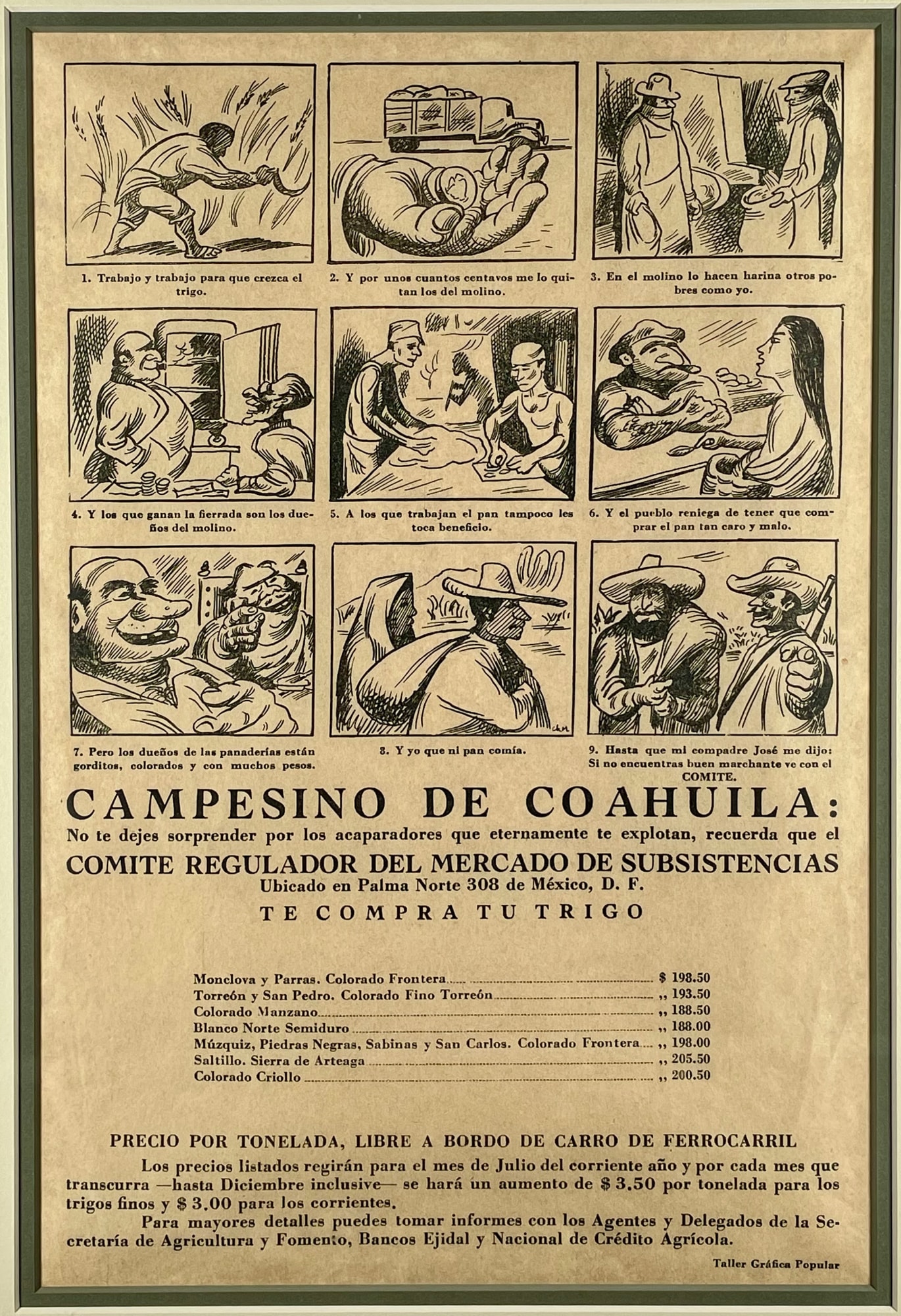 From Georgia Museum book: "As with Mendez's chapulin flyers, the intention was to maintain market stability and reduce the exploitation of farmers by unscrupulous speculators. As usual, each flyer is decorated, usually with a reproduction of an ink drawing rather than an image form a linocut. Both Chavez Morado and Raul Anguiano, in absentia workshop members at best, returned to contribute caricatures, often in cartoon strip sequences, for this series.