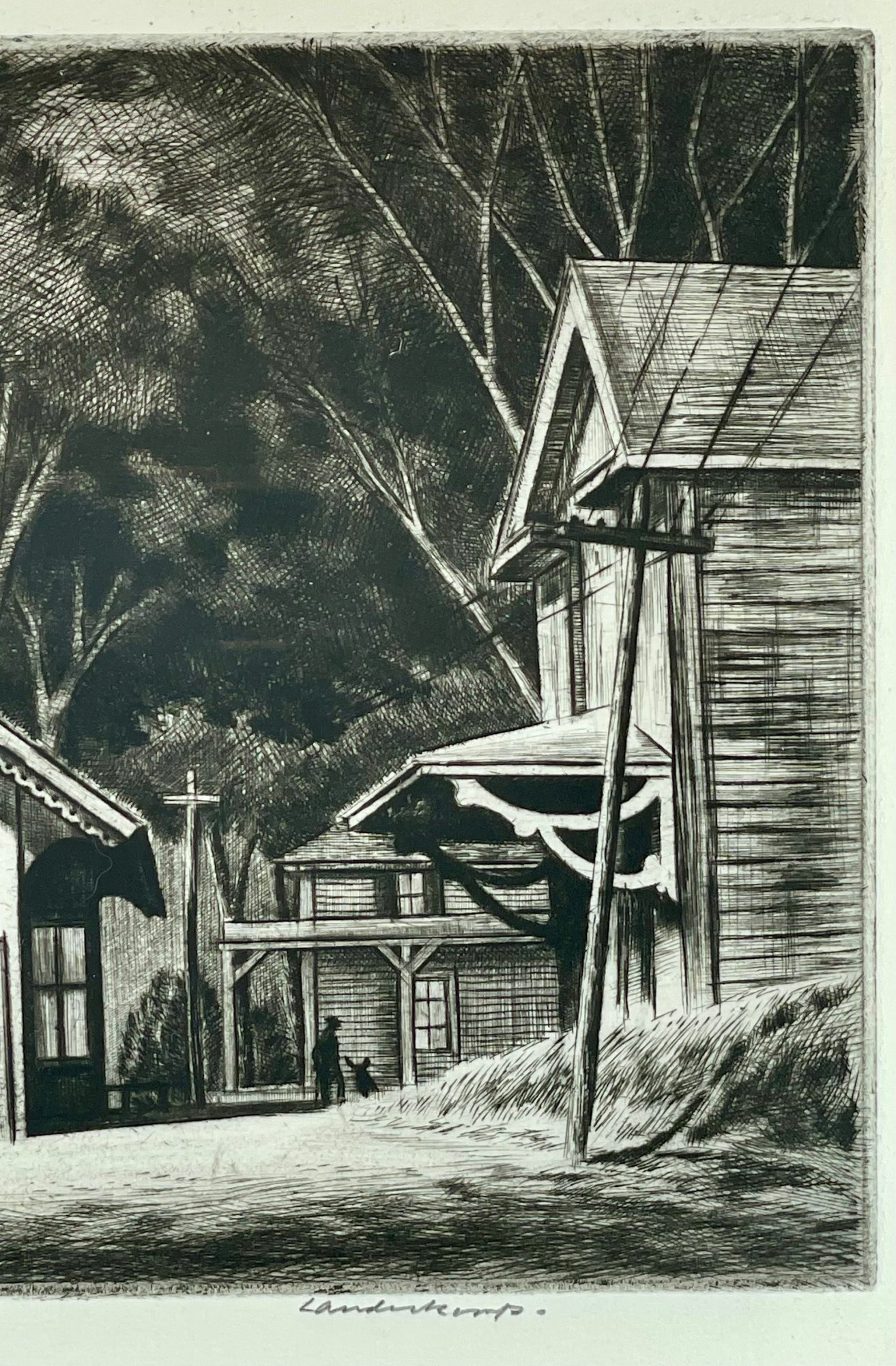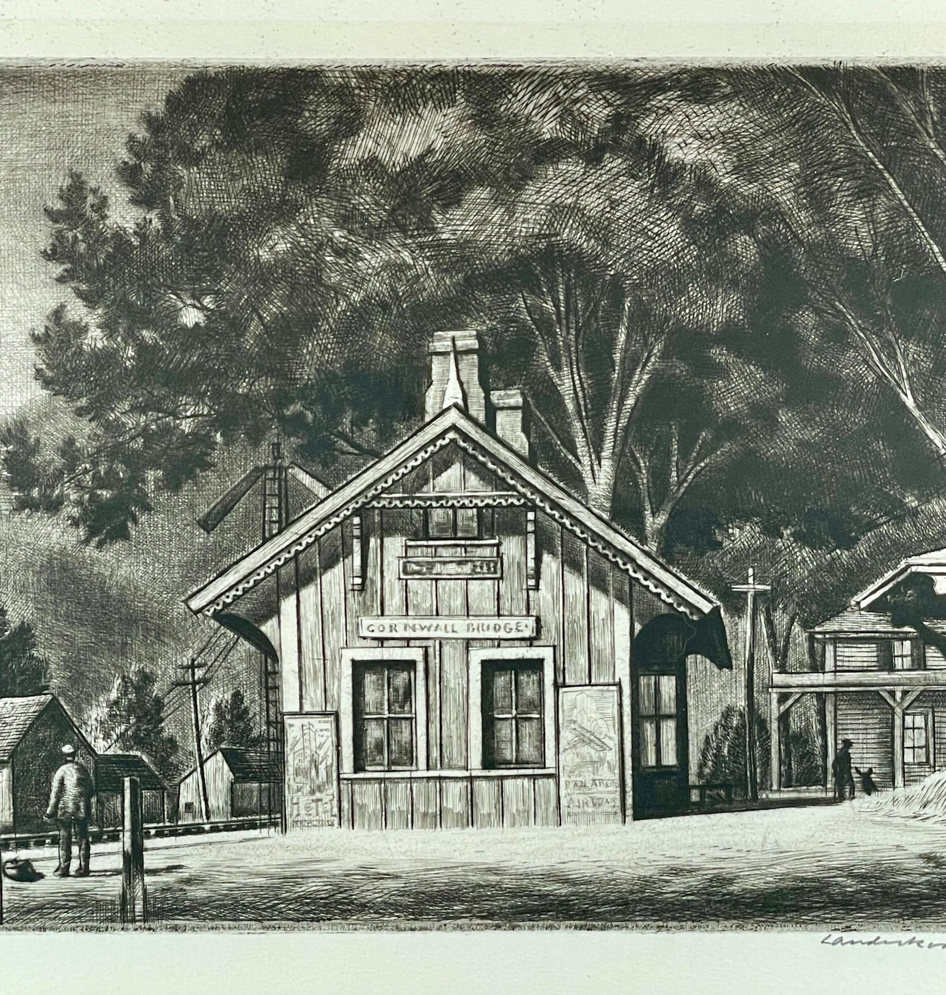 This drypoint depicts the railroad station in Cornwall Bridge, Connecticut. The Housatonic Railroad was one of the first railroads to exist in the northeast. Cornwall Bridge was the hub of 19th century industrial Cornwall and the village had a hotel and a church, as well as a number of businesses. Landeck had his studio nearby in East Cornwall on Great Hill Road.