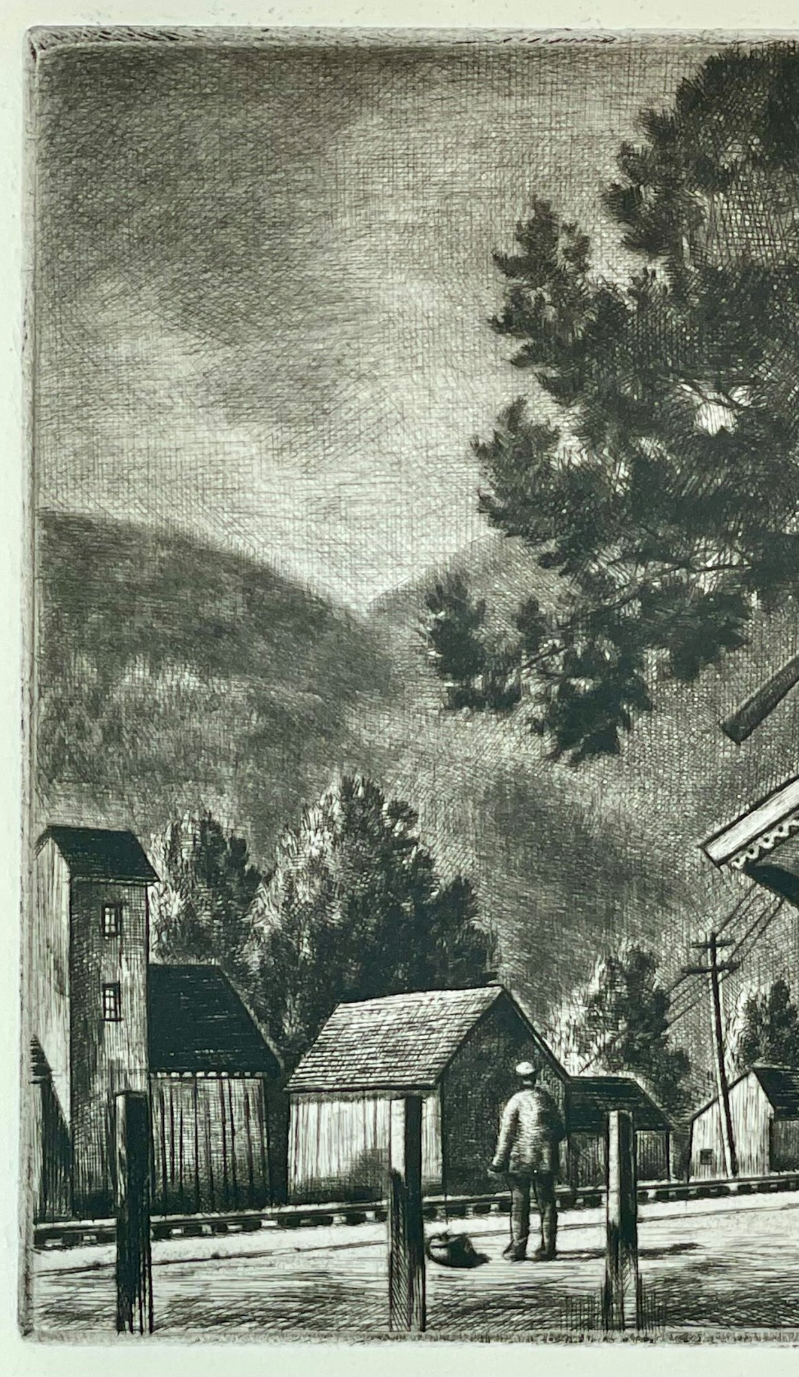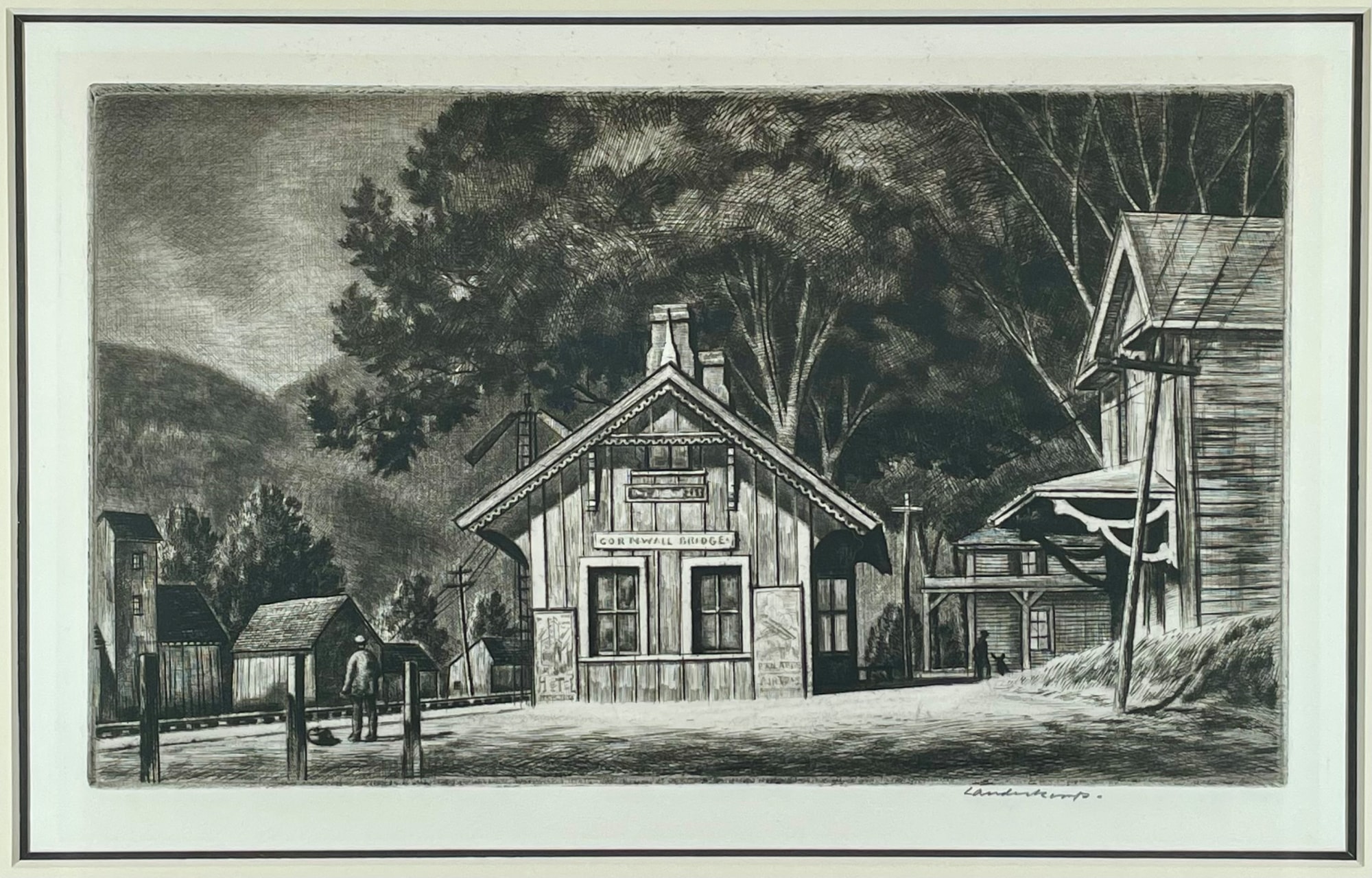This drypoint depicts the railroad station in Cornwall Bridge, Connecticut. The Housatonic Railroad was one of the first railroads to exist in the northeast. Cornwall Bridge was the hub of 19th century industrial Cornwall and the village had a hotel and a church, as well as a number of businesses. Landeck had his studio nearby in East Cornwall on Great Hill Road.