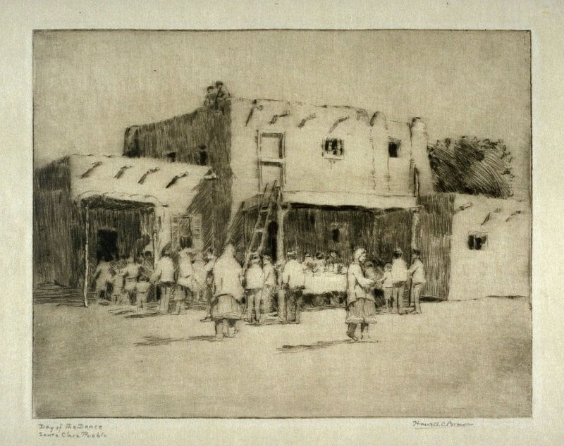 - Signature: Signed in pencil "Howell C. Brown" lower right-hand corner. Titled "Day of the Dance Santa Clara Pueblo" lower left-hand corner.