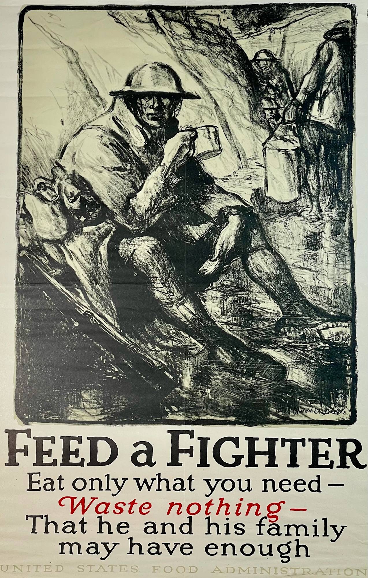“Feed a Fighter” was created by Wallace Morgan in 1918 in the midst of both World War I and a global food shortage. Grain was at the heart of this crisis because grain is transported the easiest and the basis for most foods, so when grain production fails, food production fails. Grain prices rose dramatically as Europeans and Americans competed for a limited supply of grain Poor crops in 1916 and 1917 exacerbated the issue. The US produced a billion bushels of wheat in 1915. A year later, we barely produced half of that, only producing 636 million bushels. Posters, such as this, were created to encourage the preservation of food to supply soldiers with the food that they needed to fight. Liberty gardens were created to relieve the strain on farmers and farming was studied to increase production and eliminate waste. People were encouraged to use corn and rye as substitutes for wheat. These posters encouraged people to adhere to ration days, such as wheat less Mondays and Wednesdays or meatless Tuesdays, so that their soldiers could eat. These posters encouraged people to adhere to an otherwise dreary meal plan.