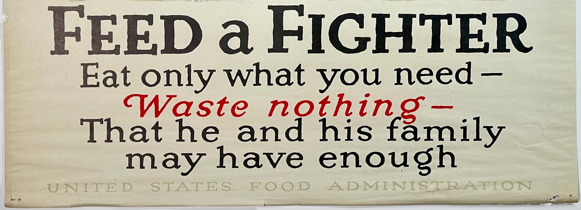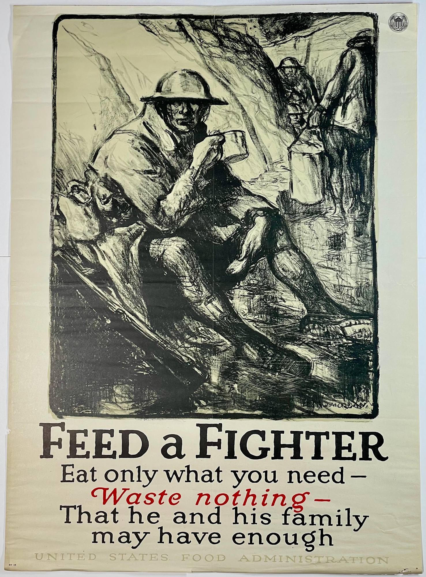 The message to the domestic population in this poster by Wallace Morgan was to conserve food and waste nothing so that all fighters and their families could be better taken care of. Morgan was one of a handful of artists selected by General Pershing to create posters during the War and they were provided with broad access to the soldiers in the fields, hence the very realistic portrayal of the fighter in this poster.