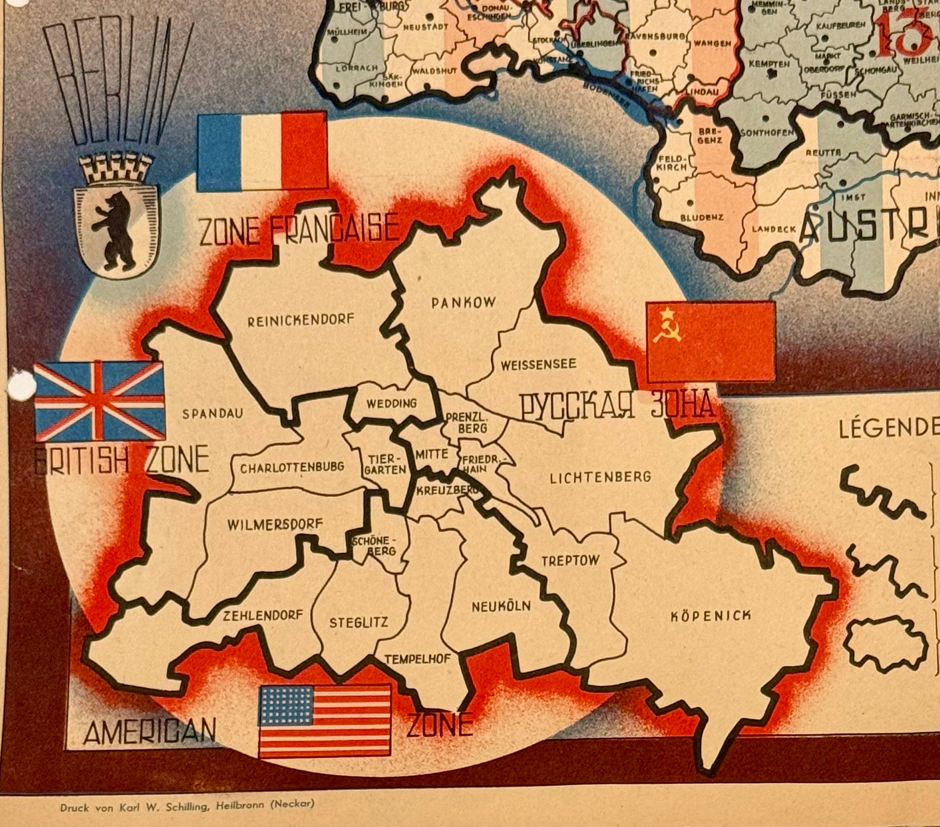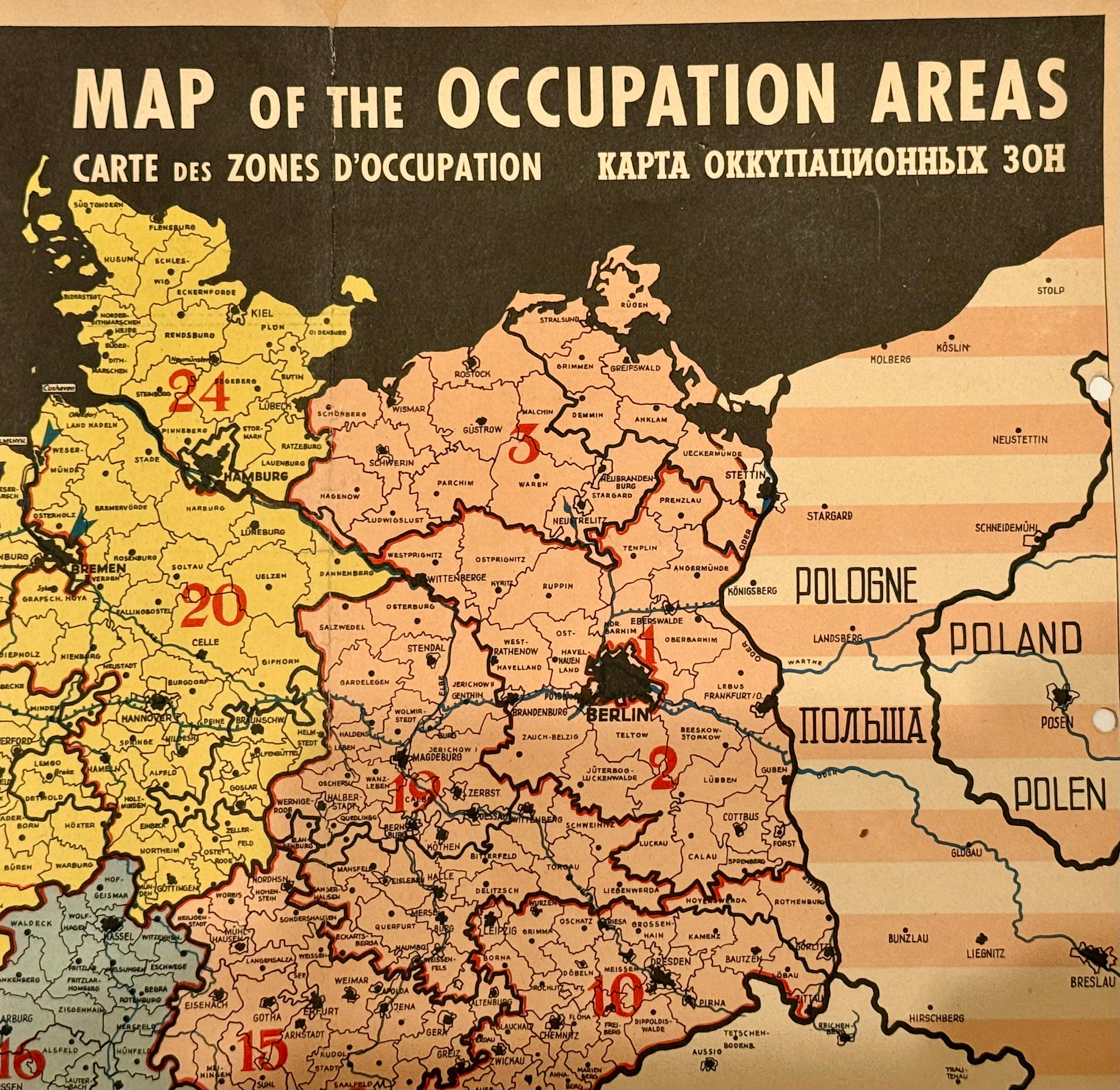 Map of the Occupation Areas - This map was created in three languages; English, French and Russian. This is the English version.