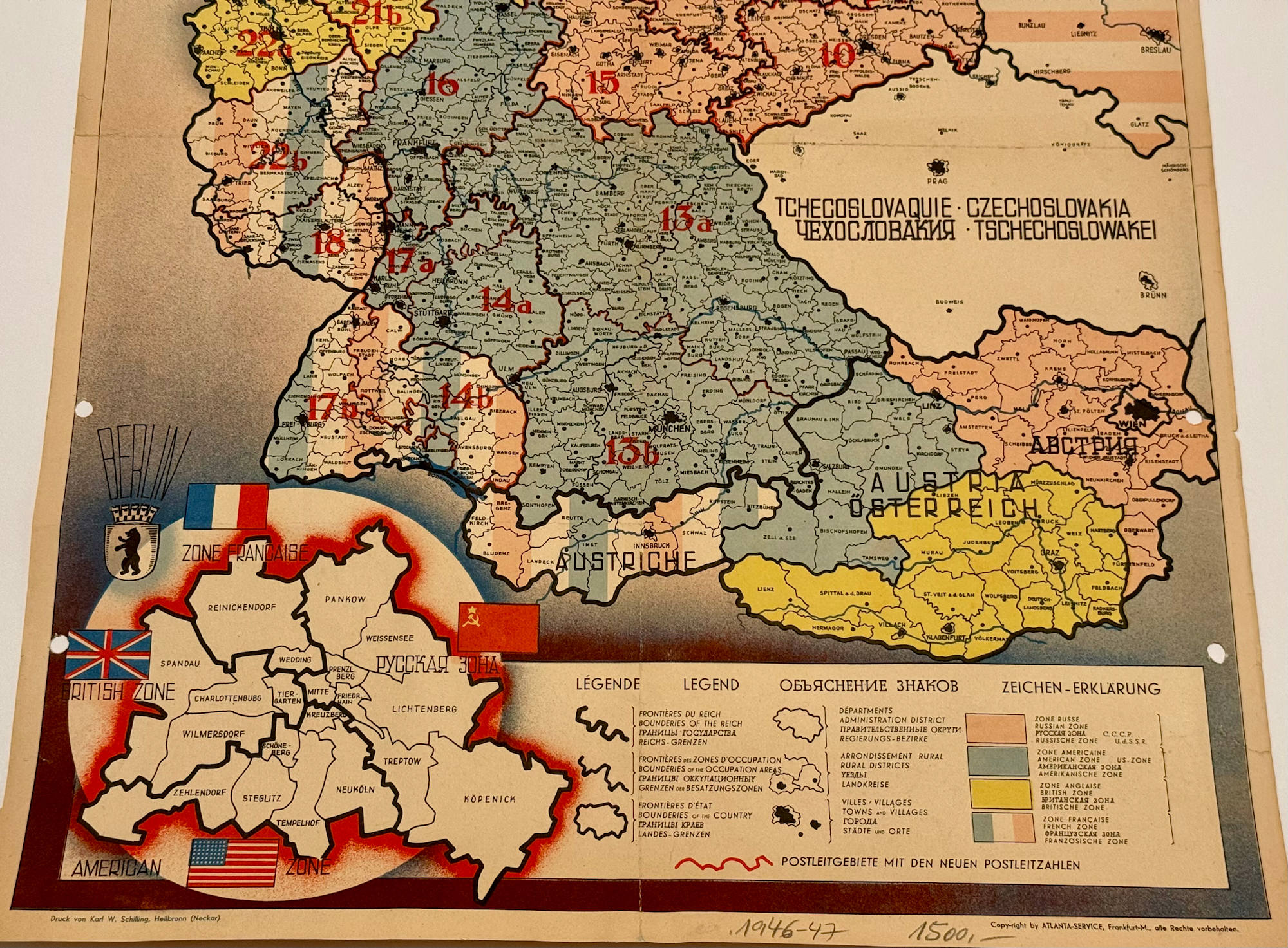 - Signature: "Druck von Karl W. Schilling, Heilbronn (Neckar)" printed lower left-hand corner "Copy-right by ATLANTA-SERVICE, Frankfurt-M., alle Rechte vorbehalten." printed lower right-hand corner