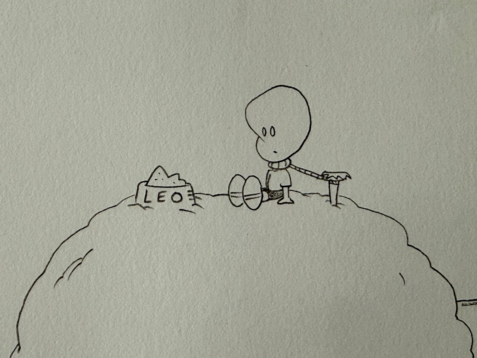Pencil sketch by California State University, Chico Distinguished Alumni and VoiceOver talent Johnny Lancaster. Unsigned but sent to me as a packet of various drawing to use as inspiration for our newborn son's bedroom in 2004 which had a space theme. I guess a child tethered to Saturn counts as within the space theme. At least he warned us that it may be too disturbing to put on the walls (which we did not do).
