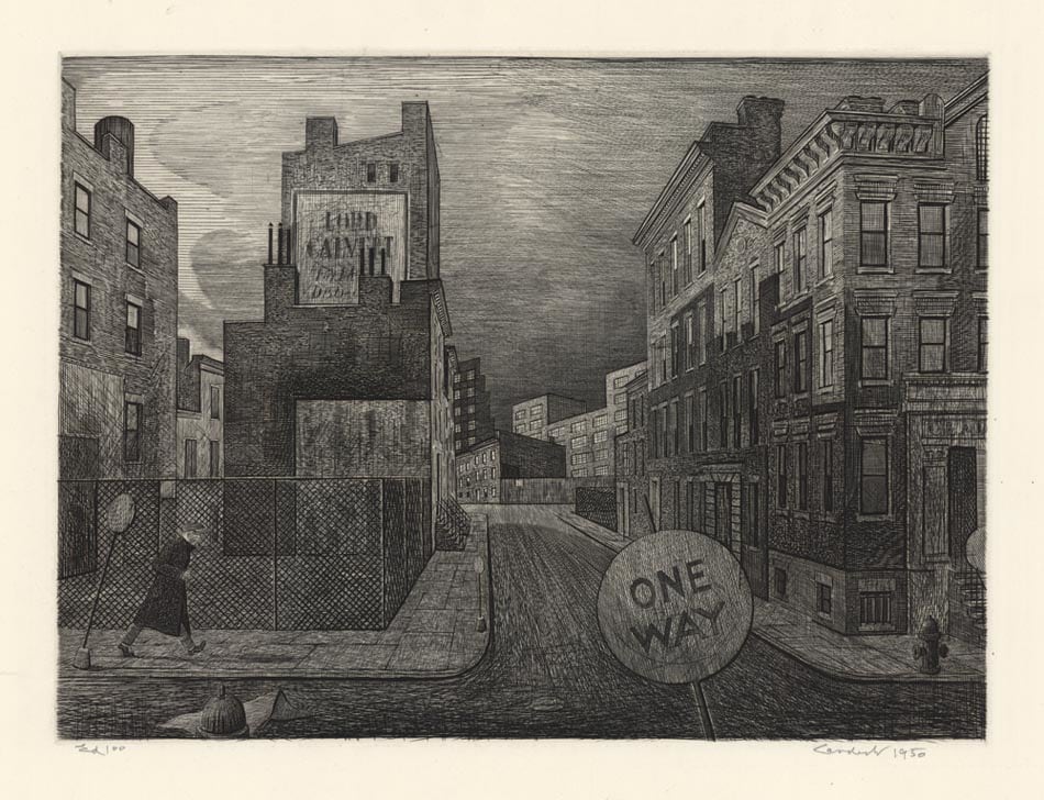 An impression of the West Side, New York City. Of this image Landeck said, "West Side. Early morning wino hurrying along. Lonely. That's all."