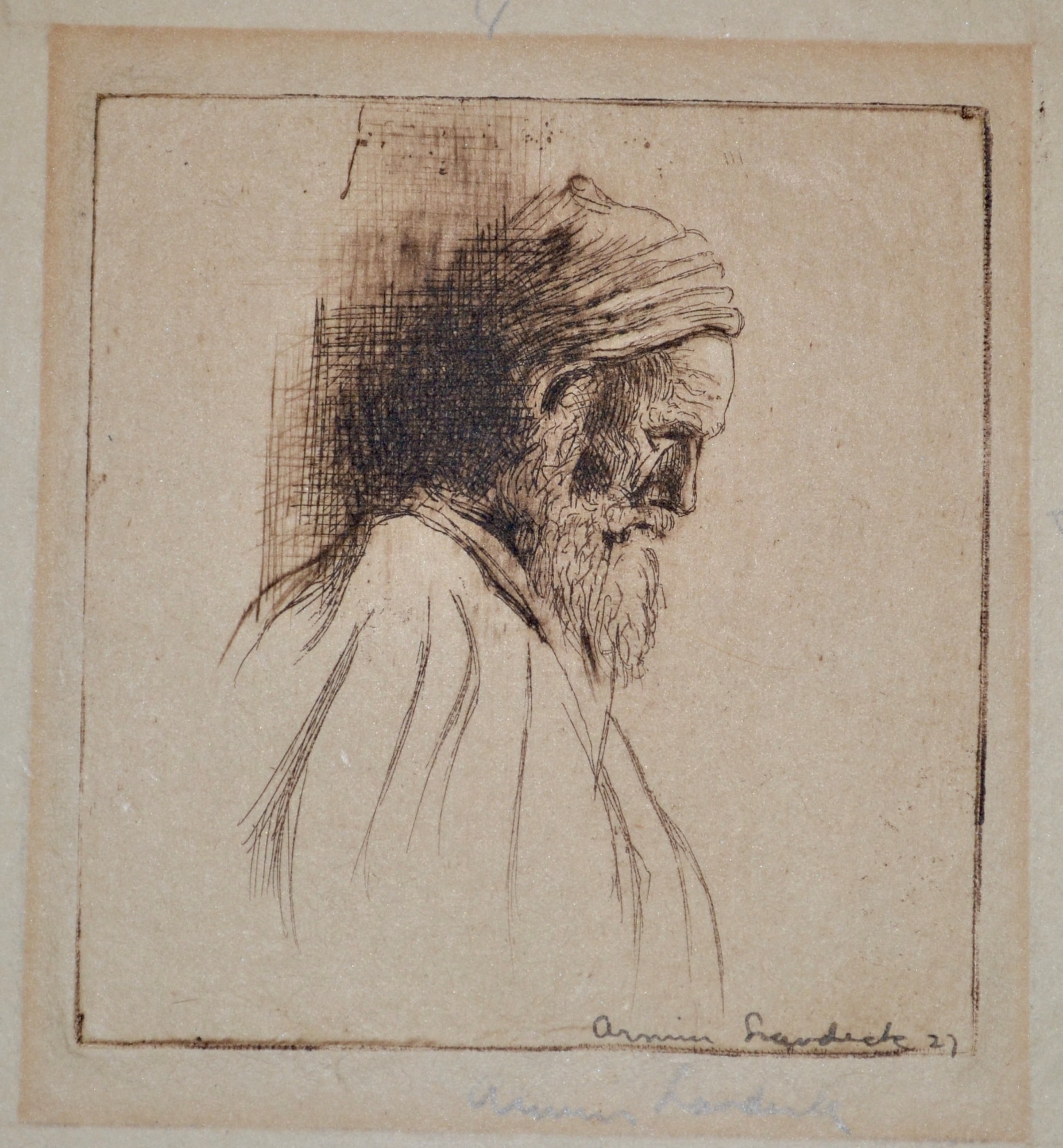 - Signature: Signed in pencil "Armin Landeck" lower right-hand corner. Signed in plate "Armin Landeck 27" lower right-hand corner. Hand-written notes along the bottom of the paper likely from original framer.