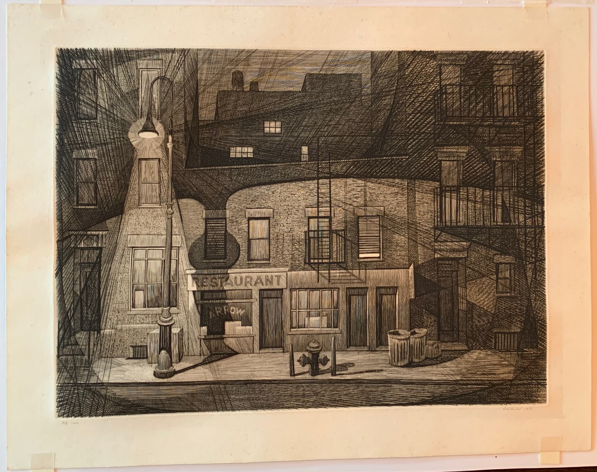 Engraving from 1951 of a city restaurant closed in the late evening.