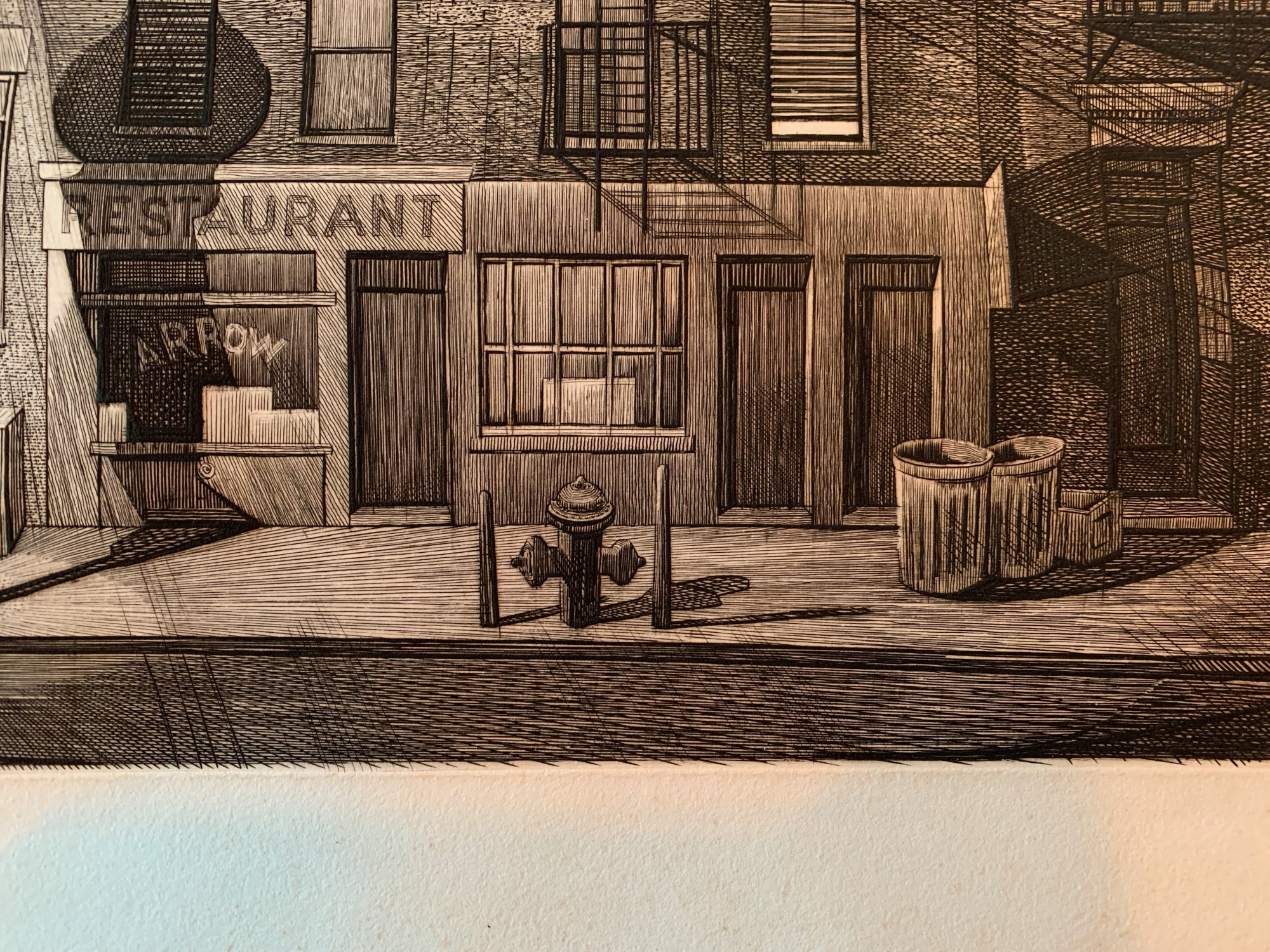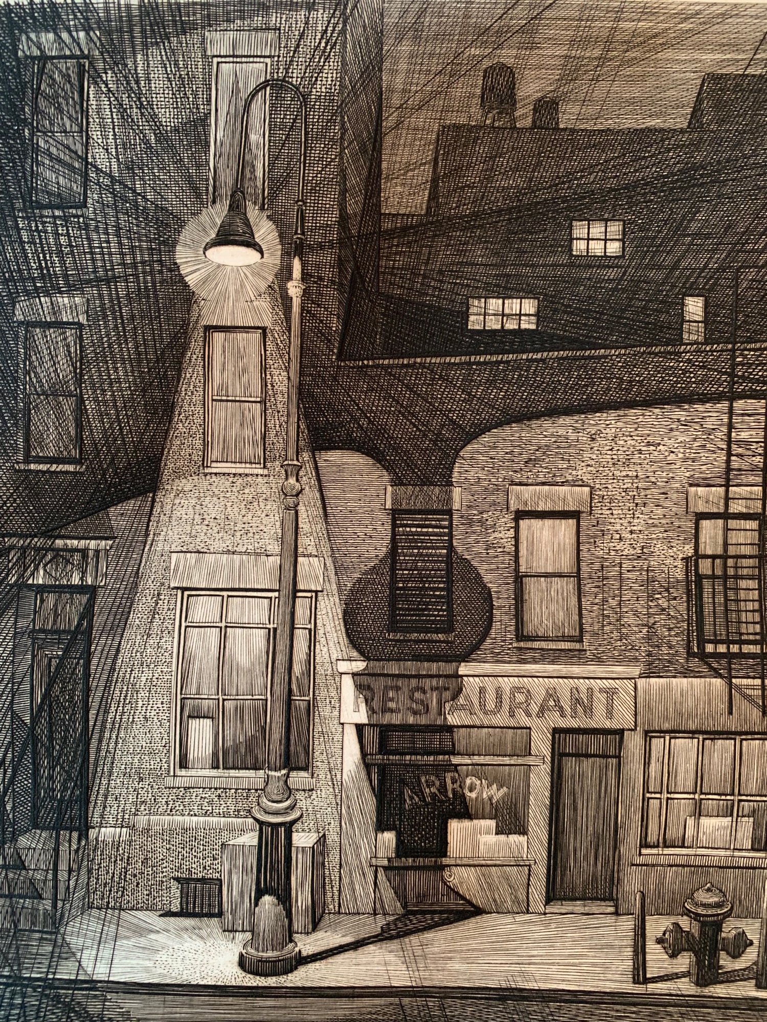 Engraving from 1951 of a city restaurant closed in the late evening.