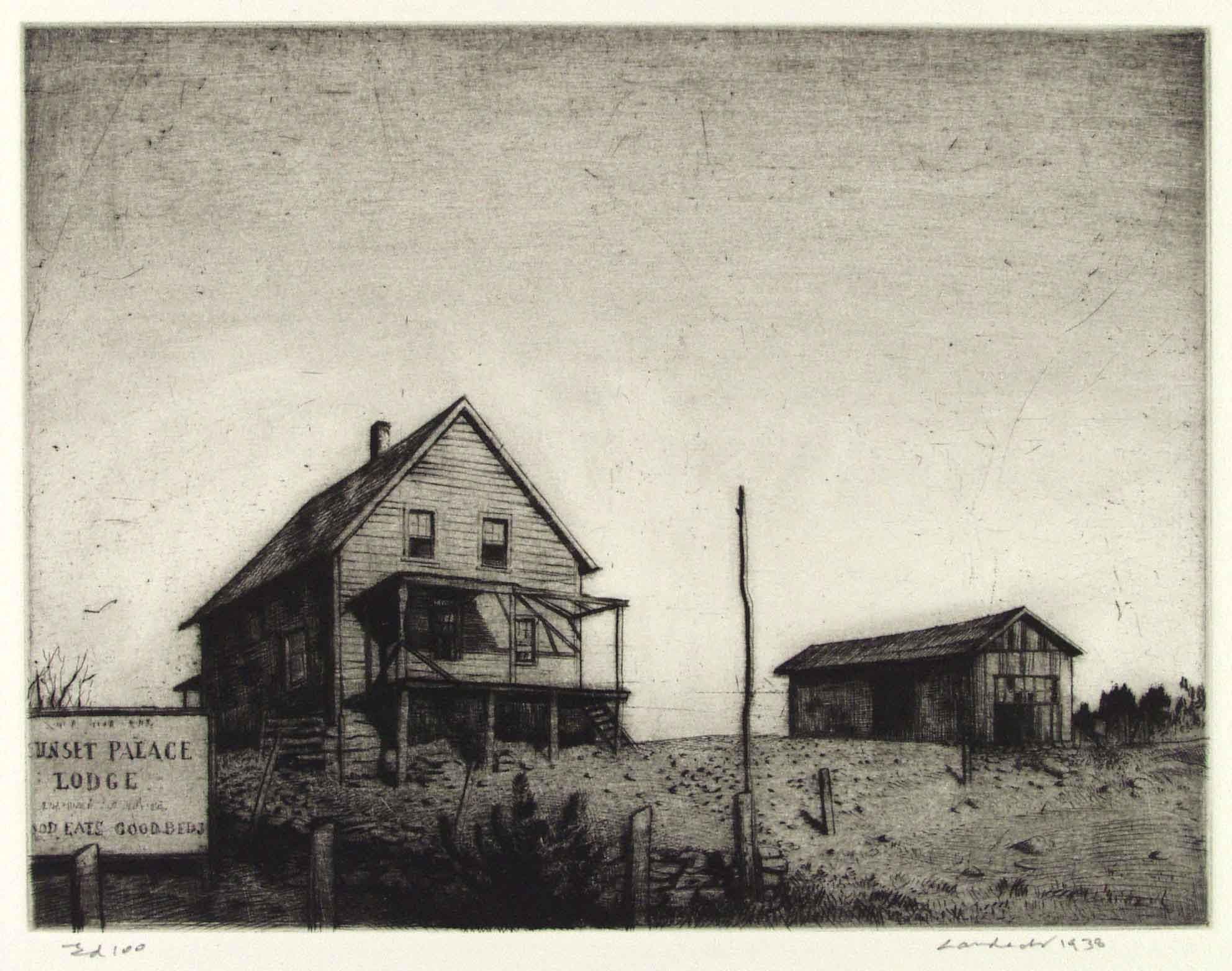 A fine impression, carefully printed with a light veil of plate tone over the buildings and land areas. The sign in front of the Lodge says “Sunset Palace Lodge, Good Eats, Good Beds.” Landeck noted that this setting was “a place near Woodbury Connecticut.” The print was not editioned when it was made, but was later printed in an edition of 100 (and signed by Landeck), the edition to be included with a deluxe edition of the catalogue raisonne.