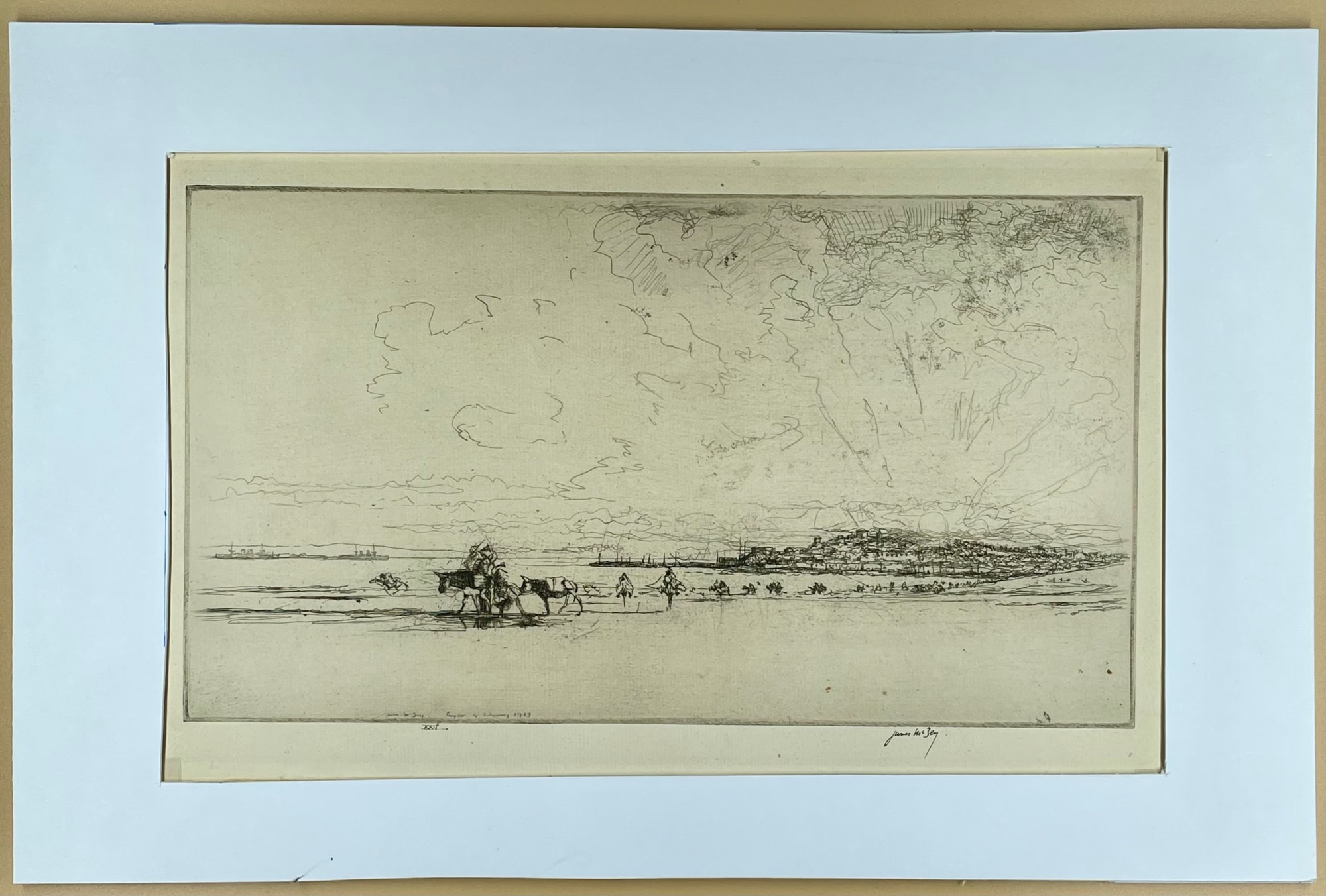 James McBey was born on December 23, 1883 in Newburgh, Aberdeenshire, Scotland, educated at his village school, and at the age of 15 years he became a clerk in a local bank. He taught himself how to create etchings on zinc plates from a book on etching "Traité de la Gravure a l'Eau-Forte."