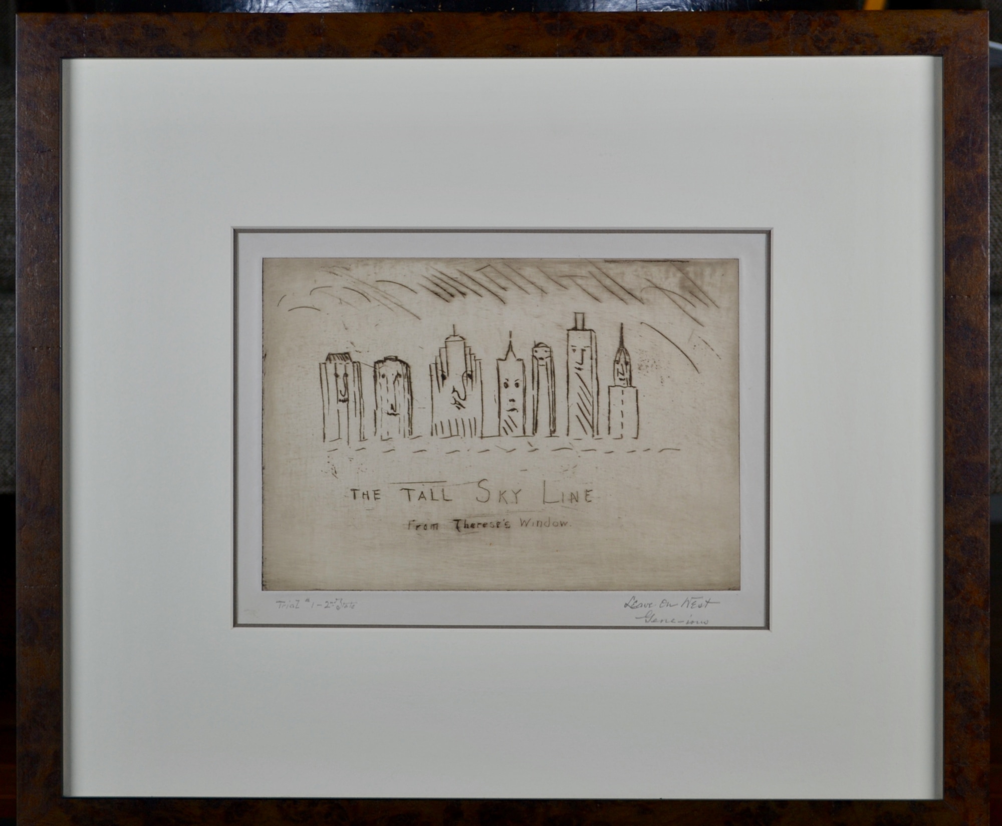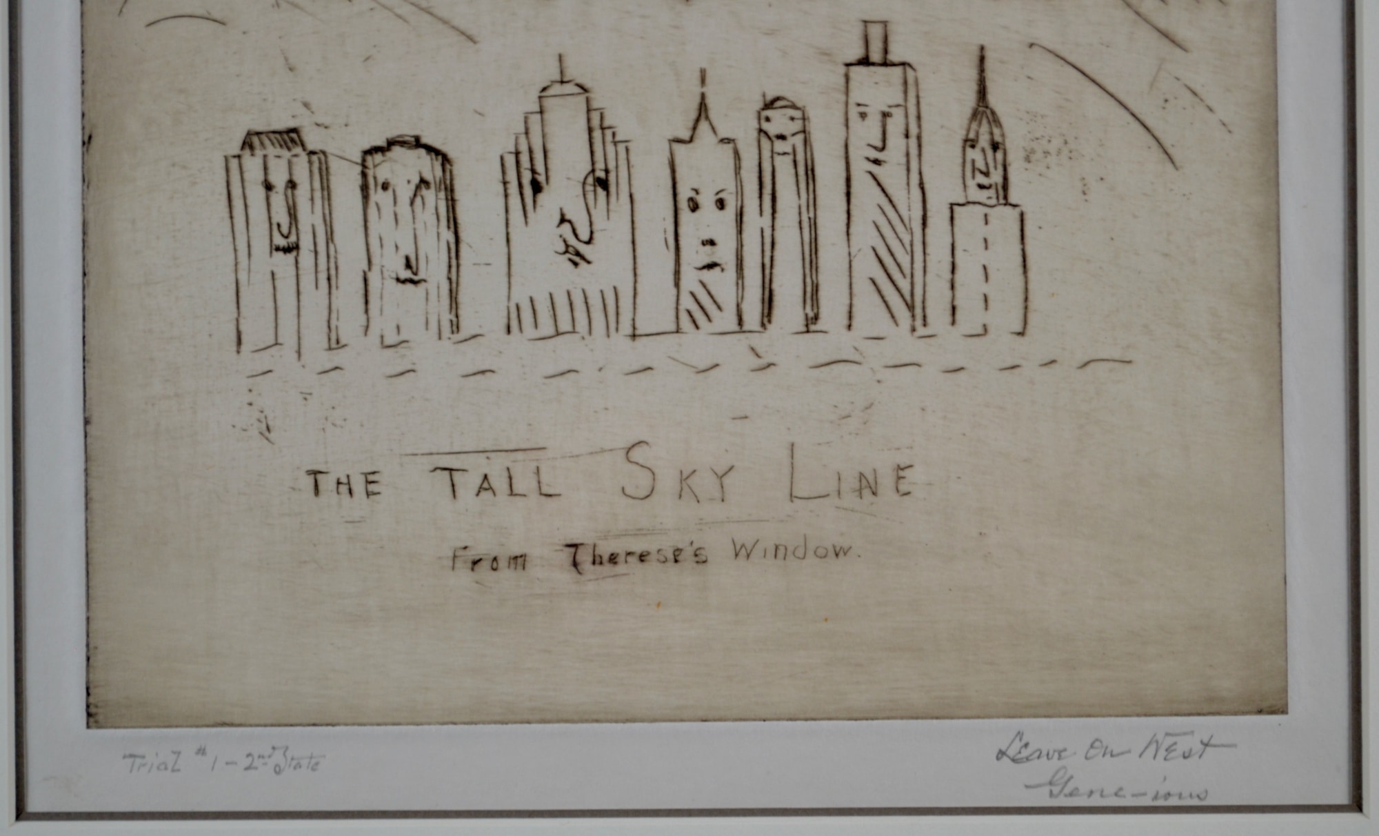 - Signature: Signatures in pencil 'Leave on West' and 'Gene-ious' lower right hand corner. Edition in pencil 'Trial #1 - 2nd State' lower left hand corner. Print name 'The Tall Sky Line From Therese's Window' etched into the plate in the lower center of image.