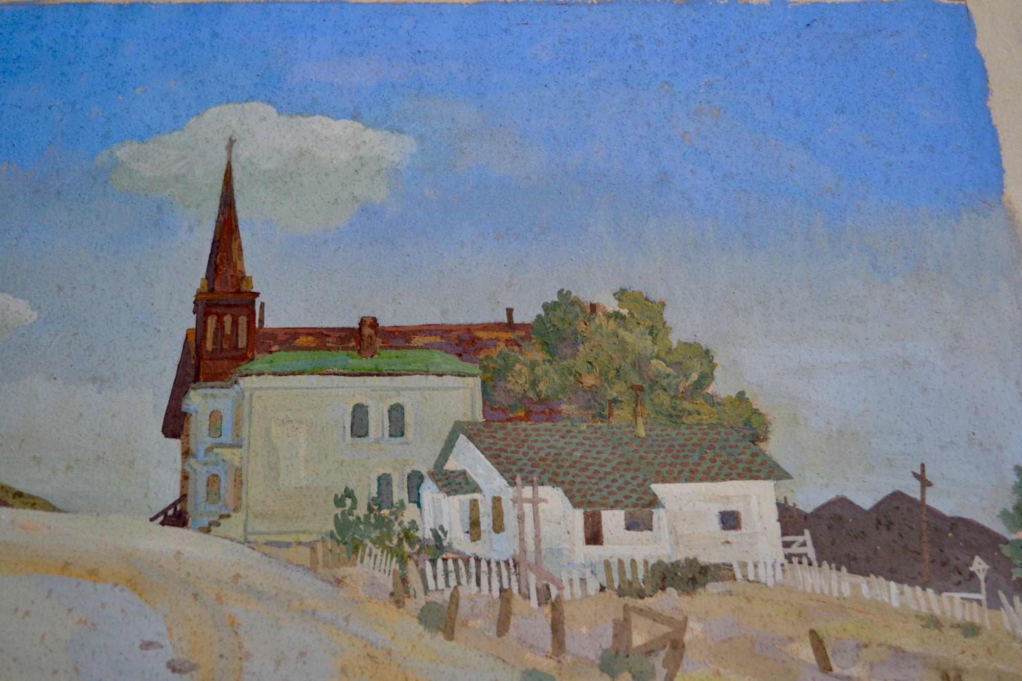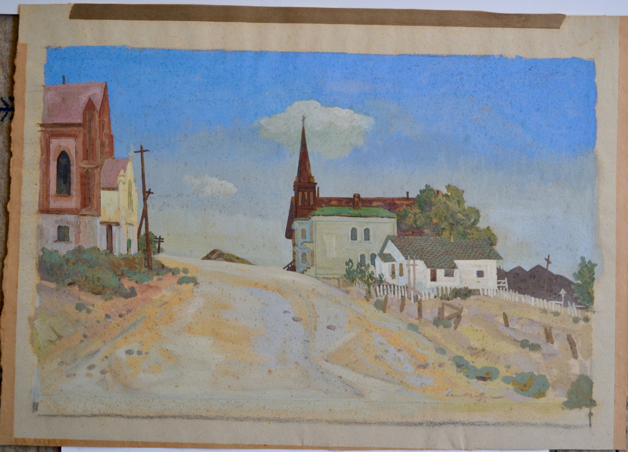 Gouache on paper of a quiet street, likely somewhere in/around Connecticut where many of Landeck's images were set.