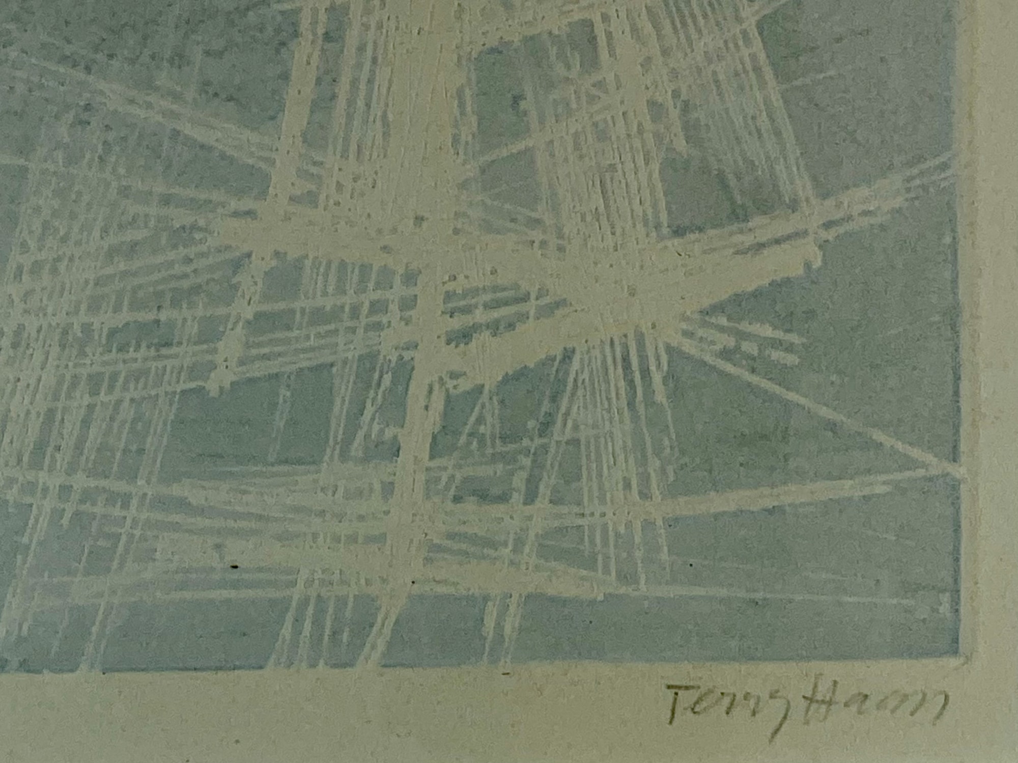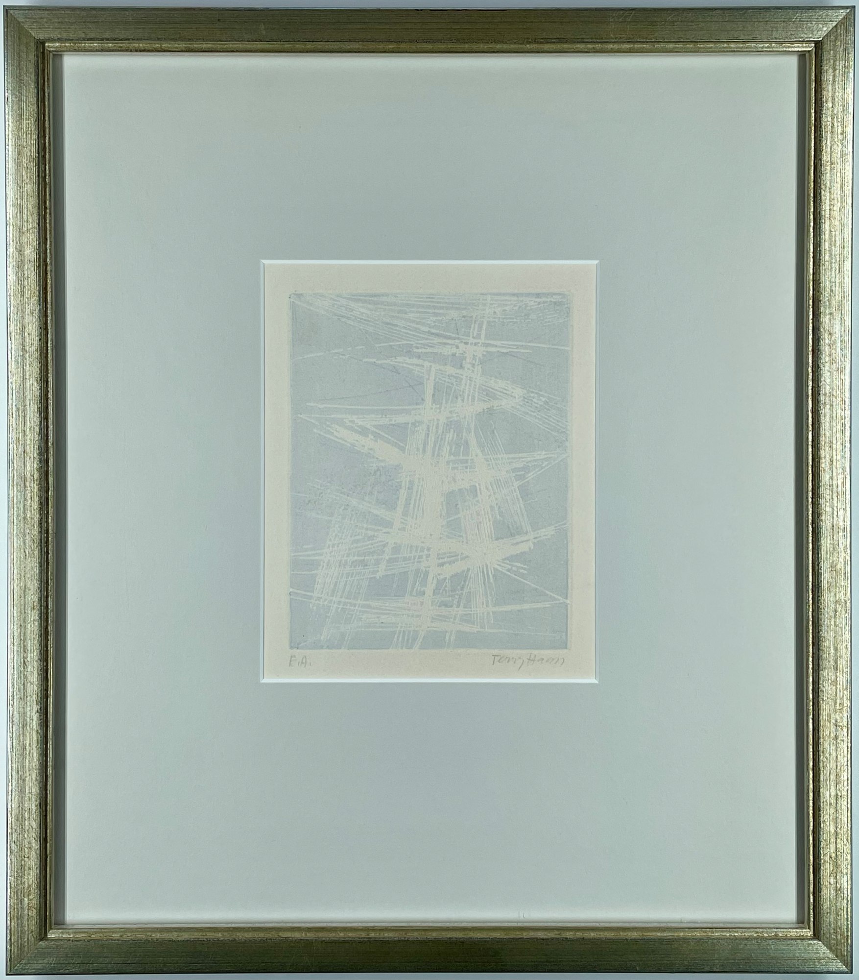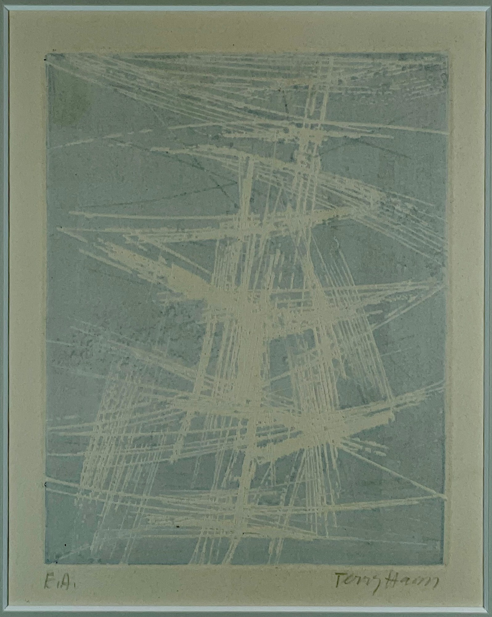 An untitled abstraction from 1966 by Terry Haass. A deepbite color etchingwith a light blue/grey ink. Printed by the artist on a crem wove paper.