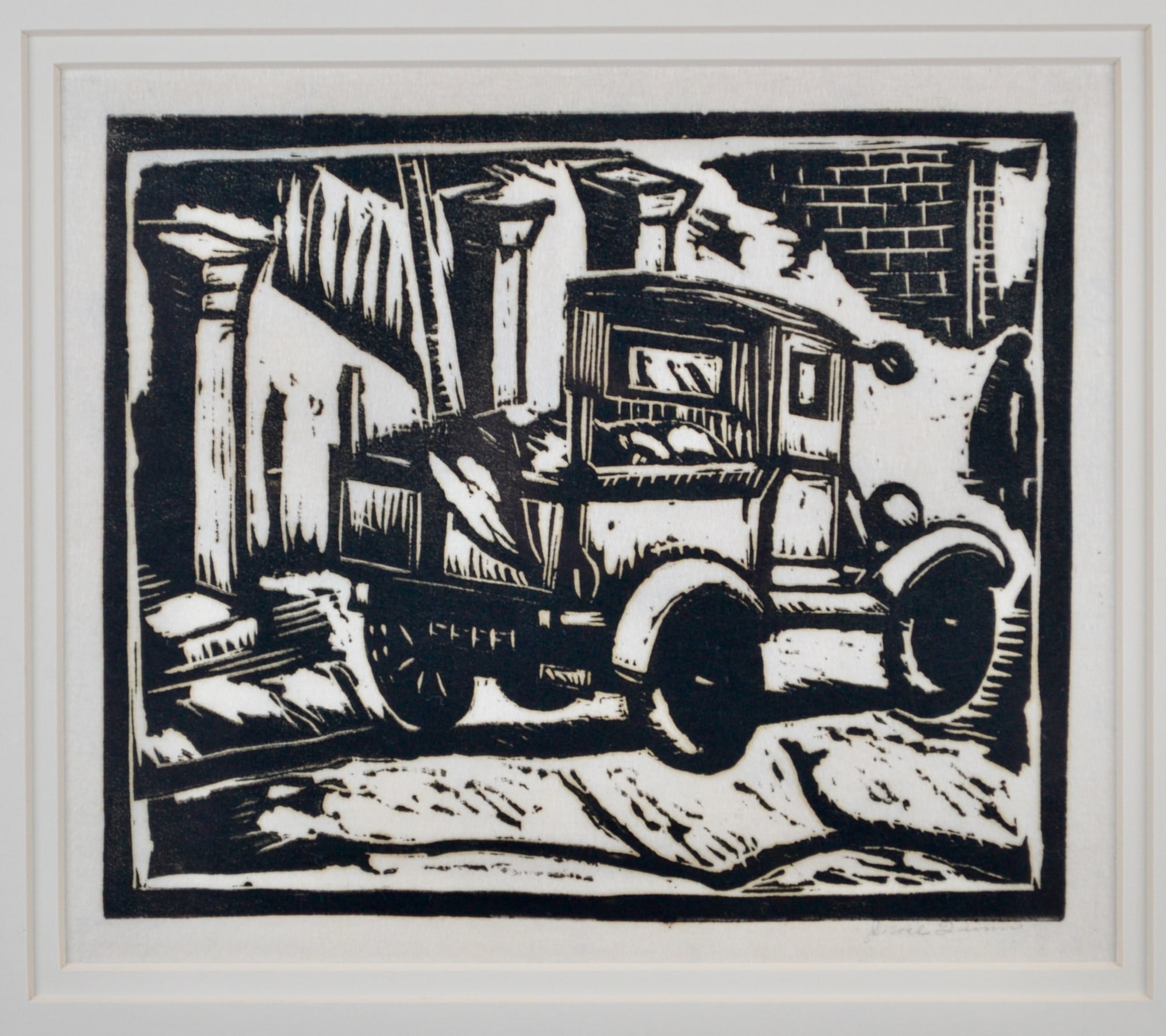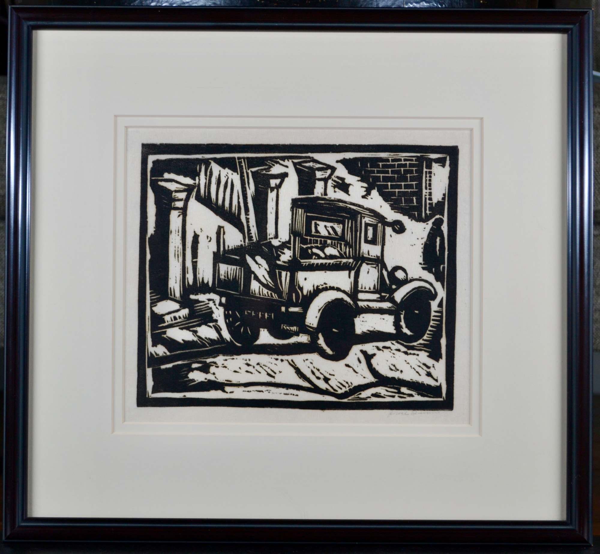 Stong woodblock of a truck in a construction scene by J. Noel Quinn from the 1930's.