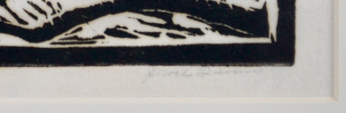 Stong woodblock of a truck in a construction scene by J. Noel Quinn from the 1930's.