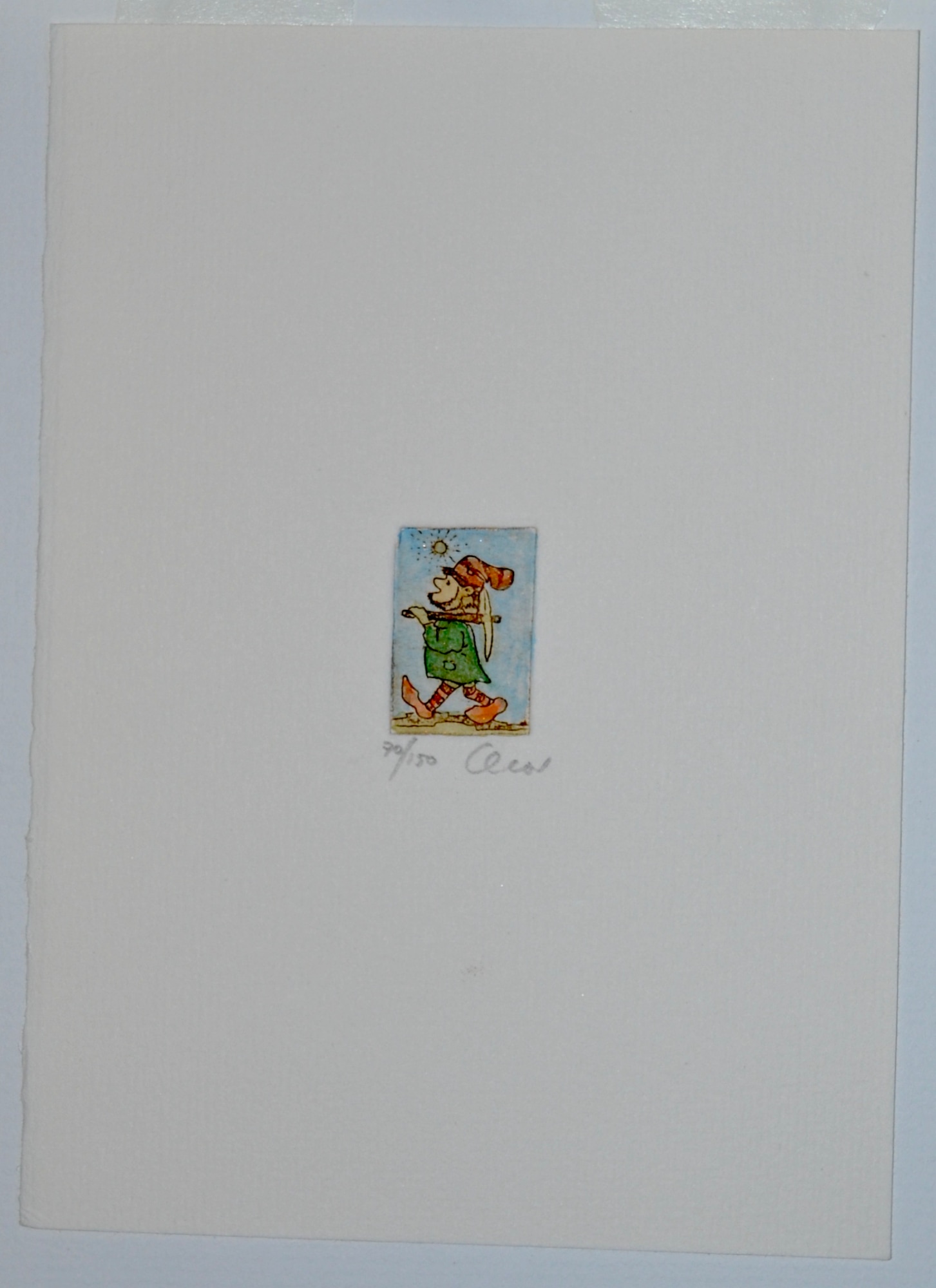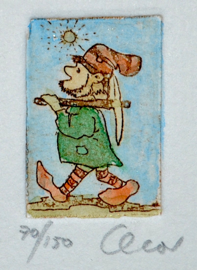 Unknown artist. Purchased at a art festival from the artist. Cute hand-colored etching of a gnome on his way to work in a mine.
