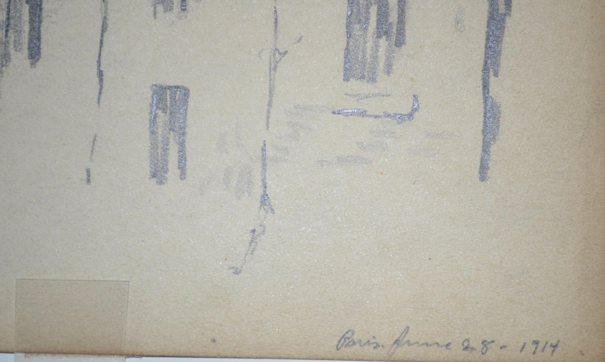This work was attributed to Lester George Hornby by the person I purchased it from stating "dated in artist's hand lower right." There is no signature but it is a drawing of homes and rooftops presumably in Paris given the notation in the lower-right hand corner of the image. He was in/around Paris in 1914 given his artwork.