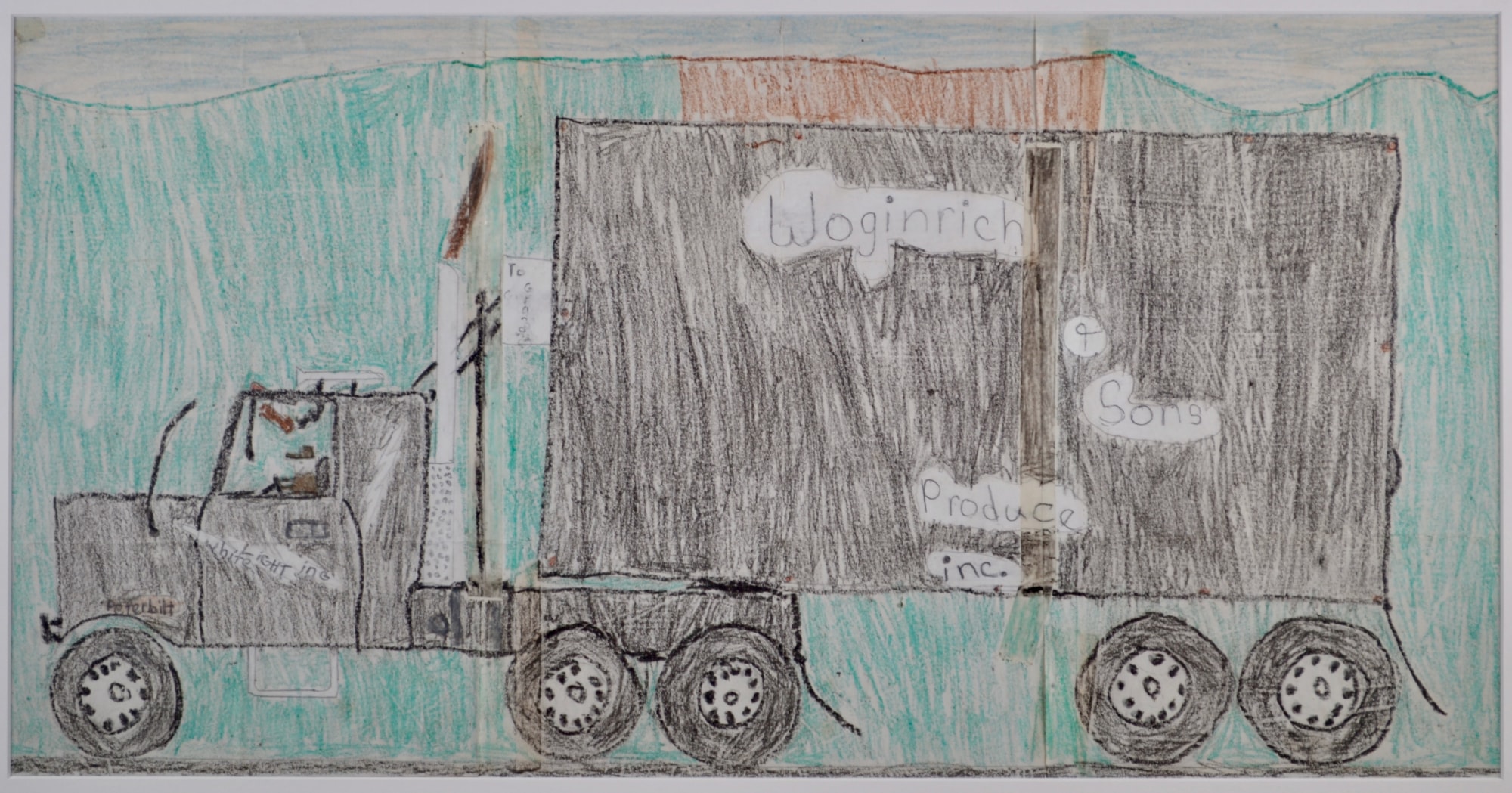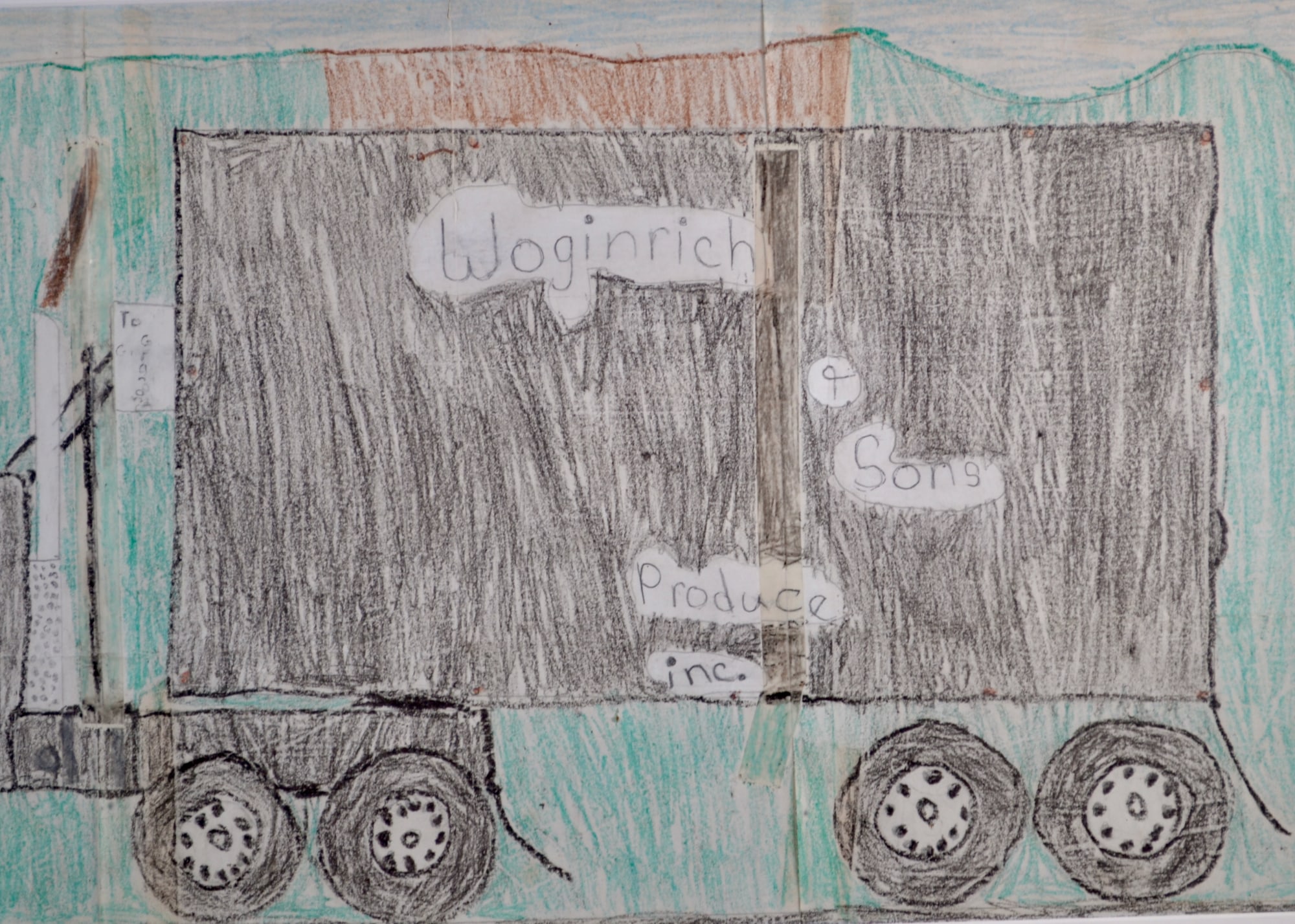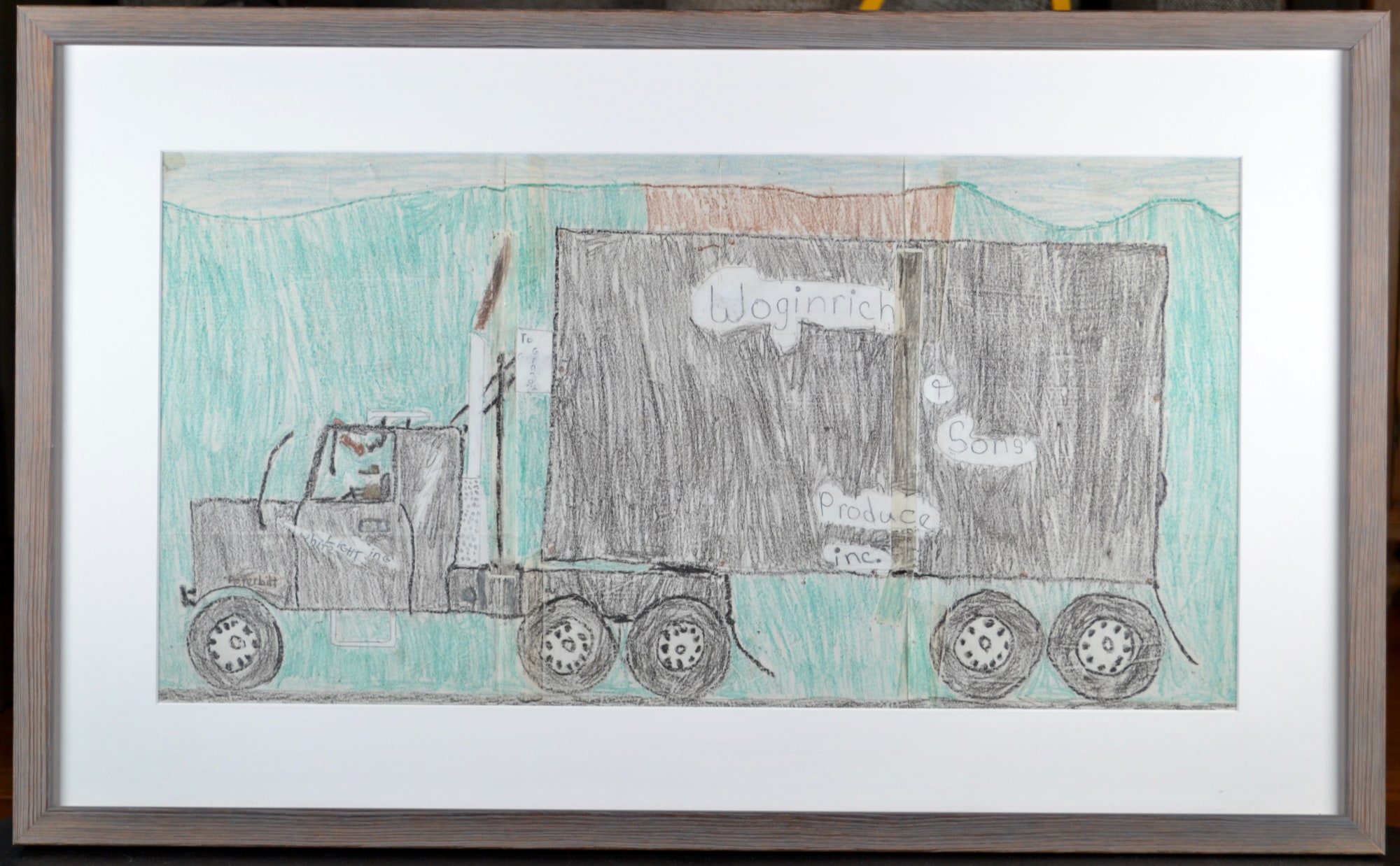 Pencil and crayon drawing of a Peterbilt truck hauling produce for the (fictional) Woginrich & Sons Produce inc. Made for my grandma which she had hung up in her house for years until she passed. Three sheeets of printer paper taped together to create the "canvas."