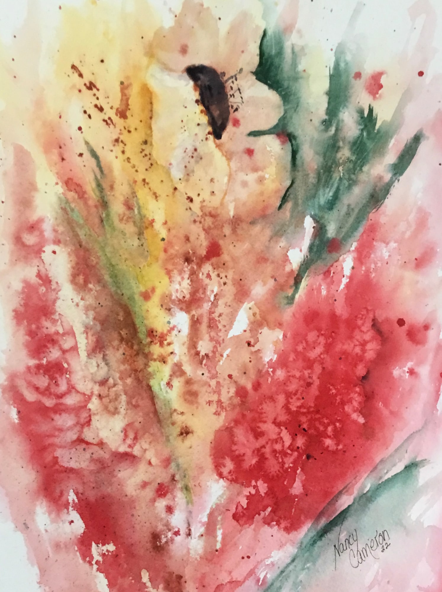 Bursting into Blooms ... Intuitive Watercolor play with a full bloom flower. Lots of color, lots of energy. It evokes thoughts of an emerging summer garden in its wild abandon ... just one bloom in the midst of it all.