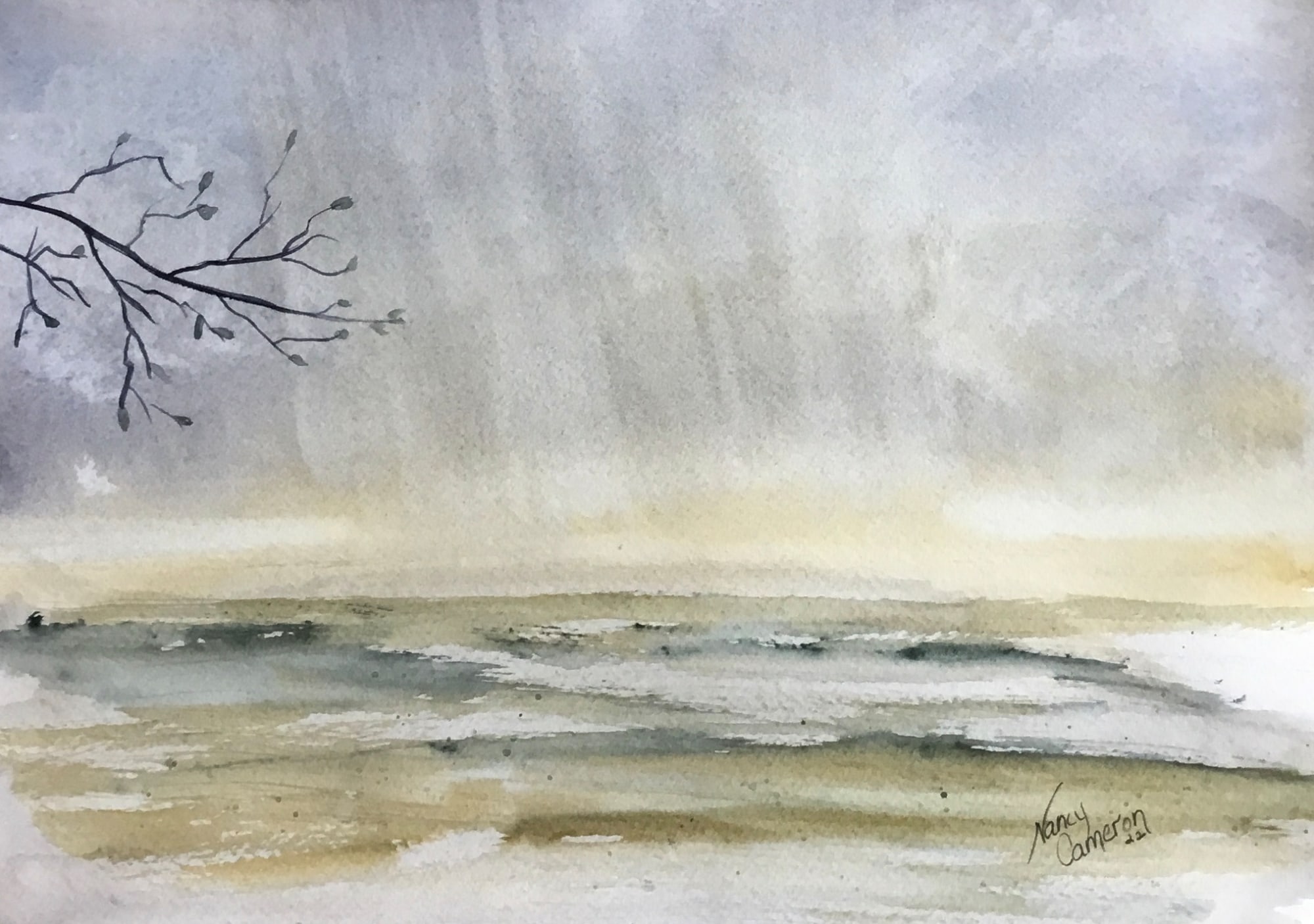 Not quite winter, not quite spring ... just a little shower to tempt us. Original Watercolor matted to 16 x 20.