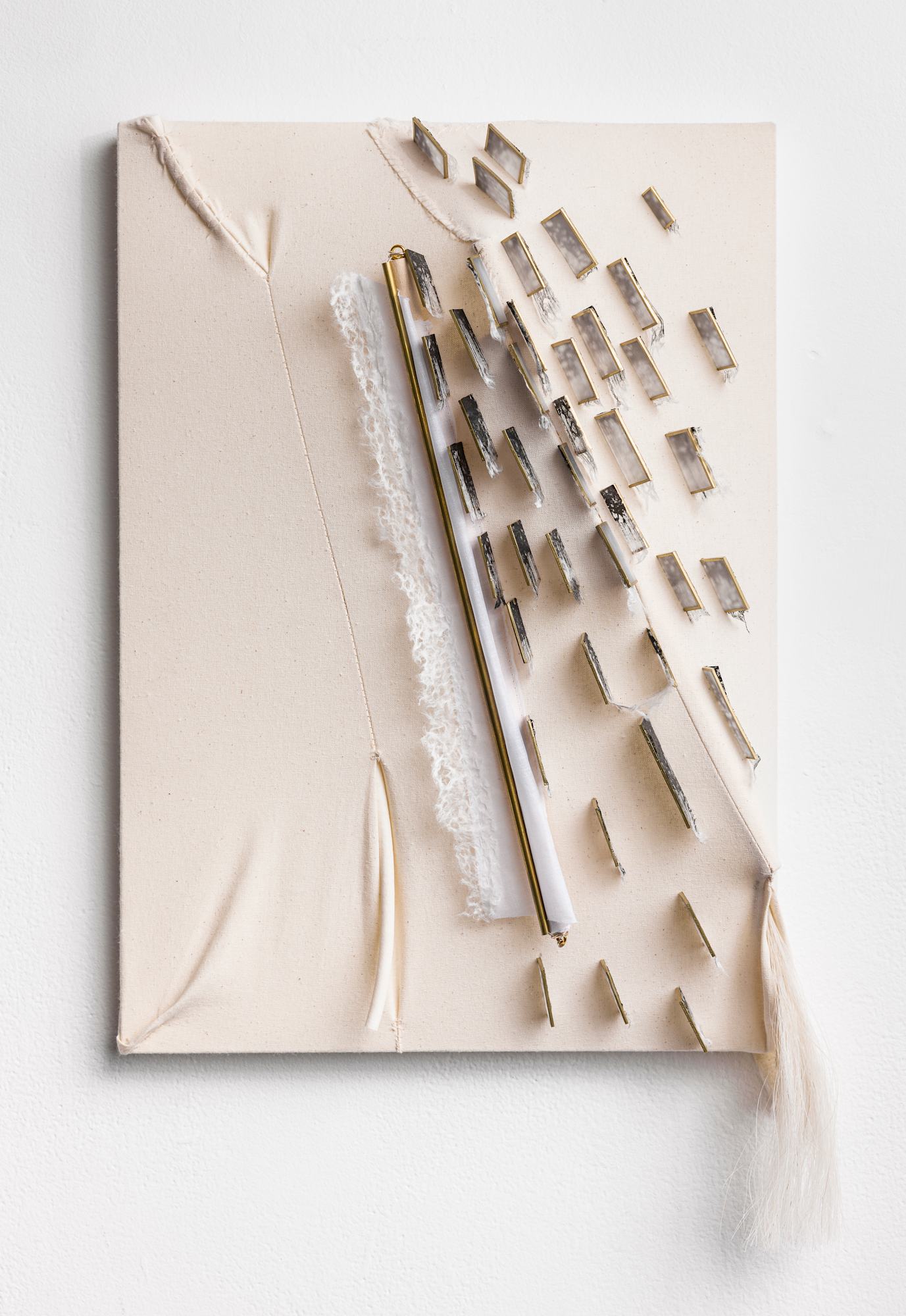 Acrylic and enamel on thermoplastic, brass, horse hair, washi paper, sumi ink, cotton fabric on panel
