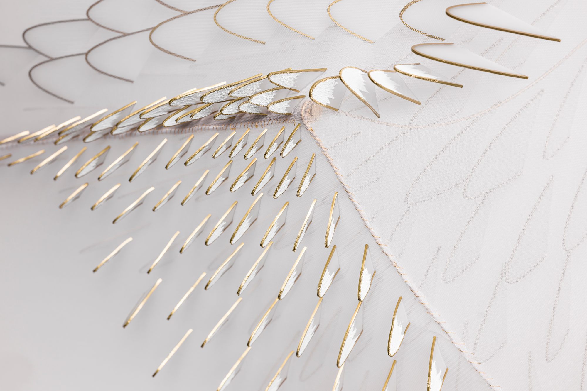 Acrylic and enamel on thermoplastic, cotton organdy, wire, wood on panel