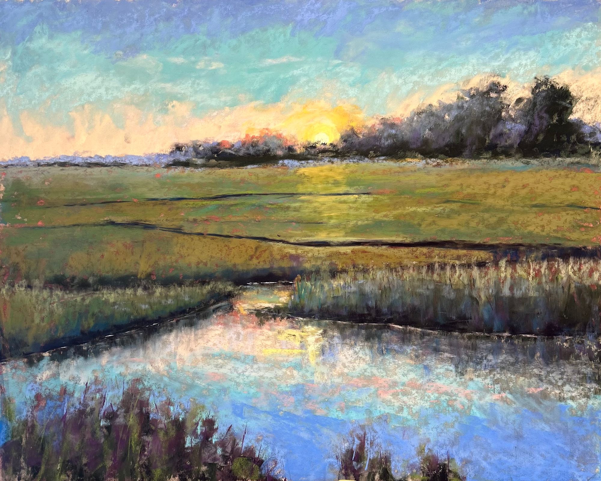Rendered in soft pastel, this piece captures the luminous spirit of the Wilmington coastline, where the setting sun casts a radiant path across the quiet, winding waters of the local salt marsh.