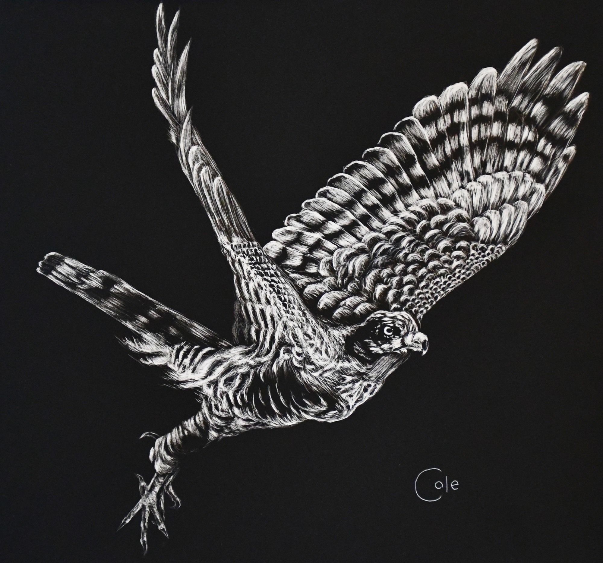 Quill on Scratchboard work of a Eurasian Sparrowhawk, created while attending an artist residency in rural Rajasthan, India.
