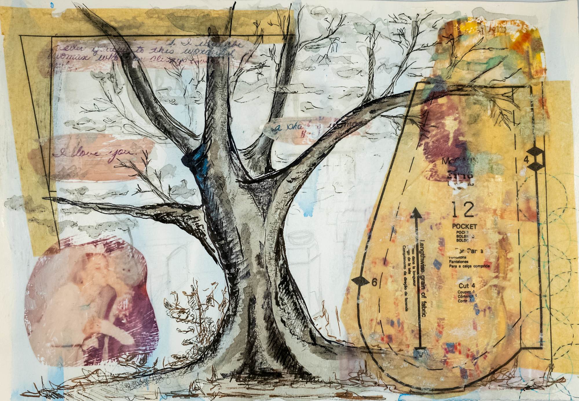 This piece is one of my herstory collection. The subject matter is the relationship between my mother and her grandmother. Included is part of a college letter inspired by the relationship they had, picture of them together at my mother's wedding and the guests names are written in the tree giving the tree substance and depth.