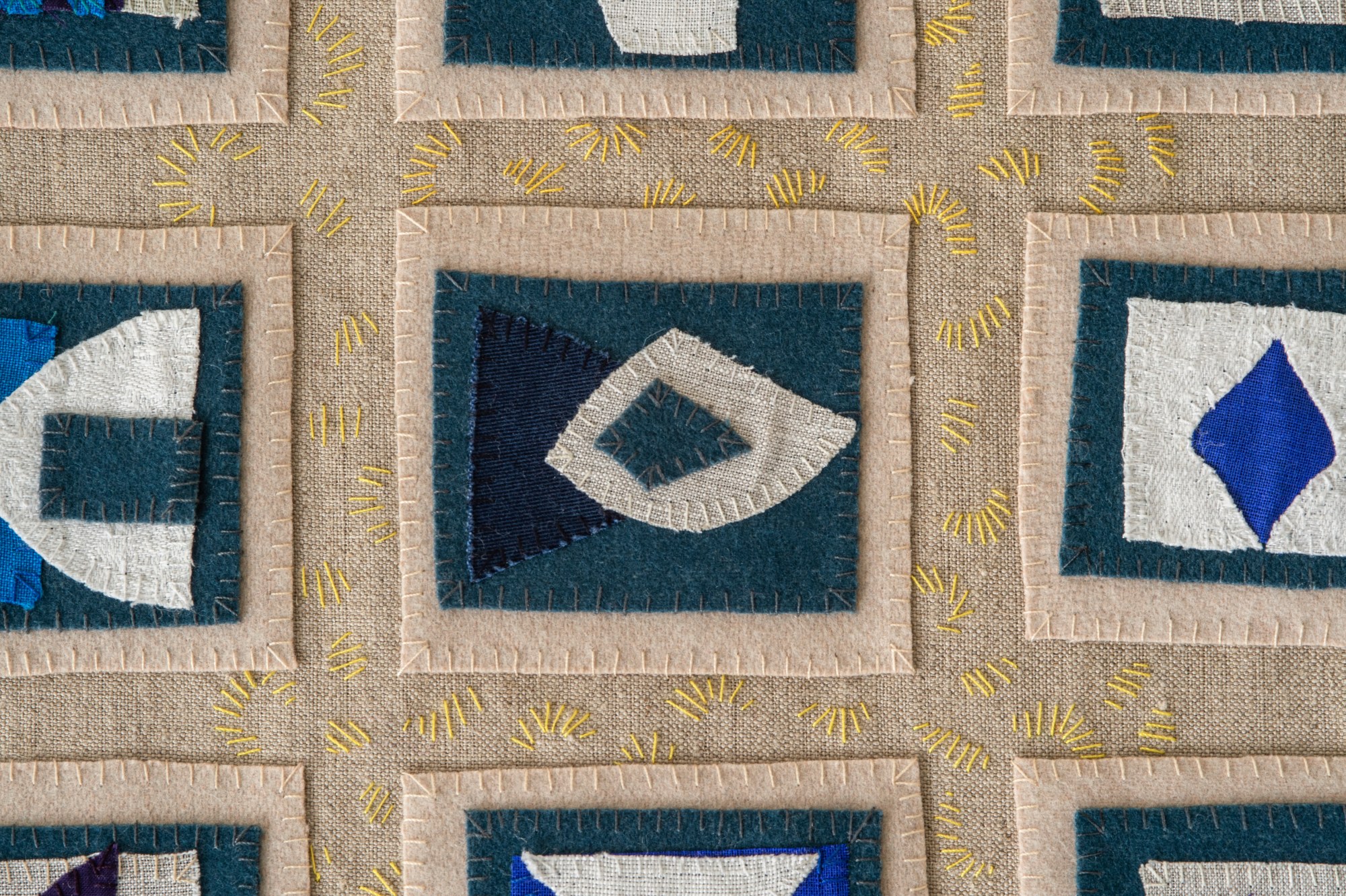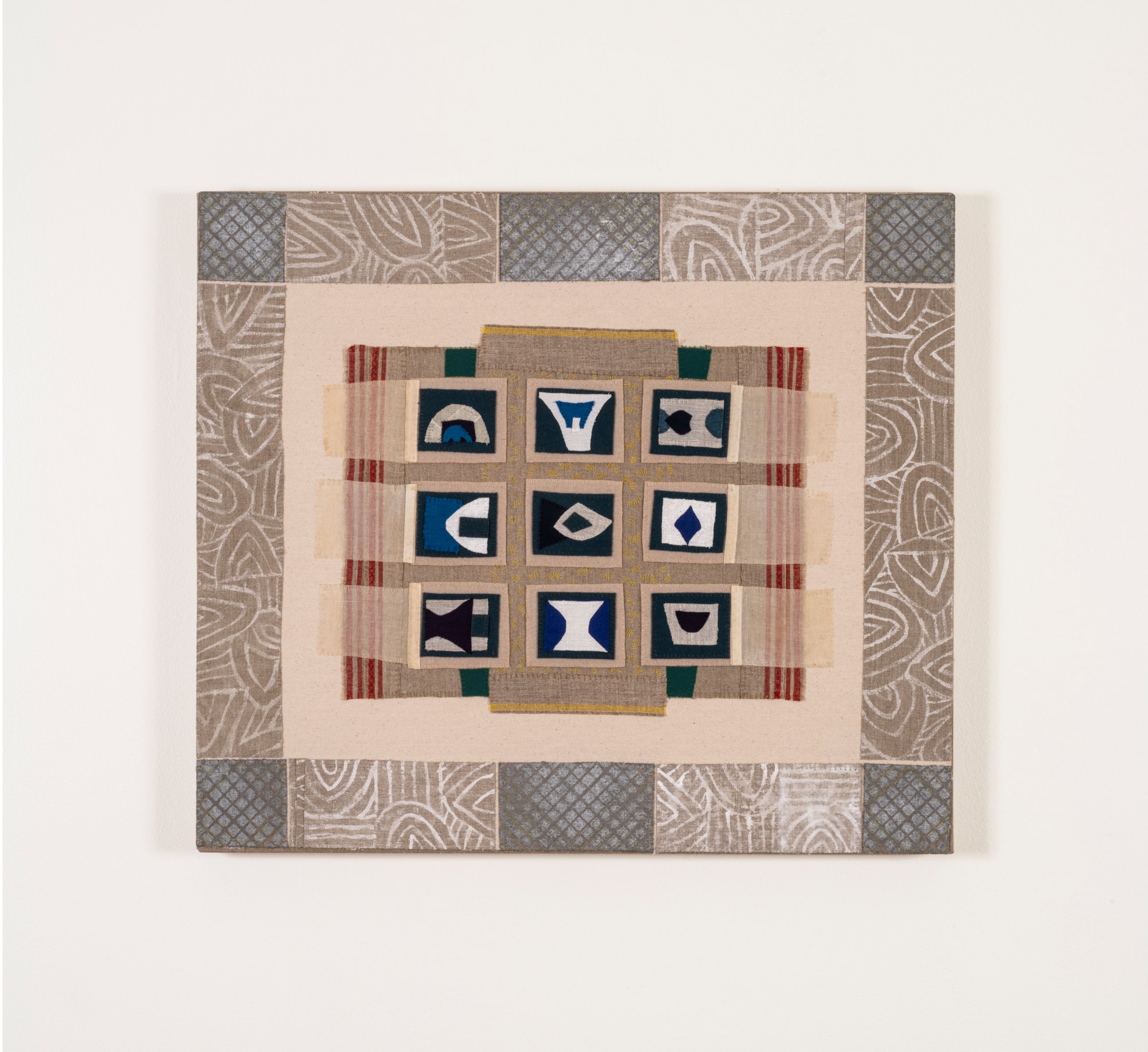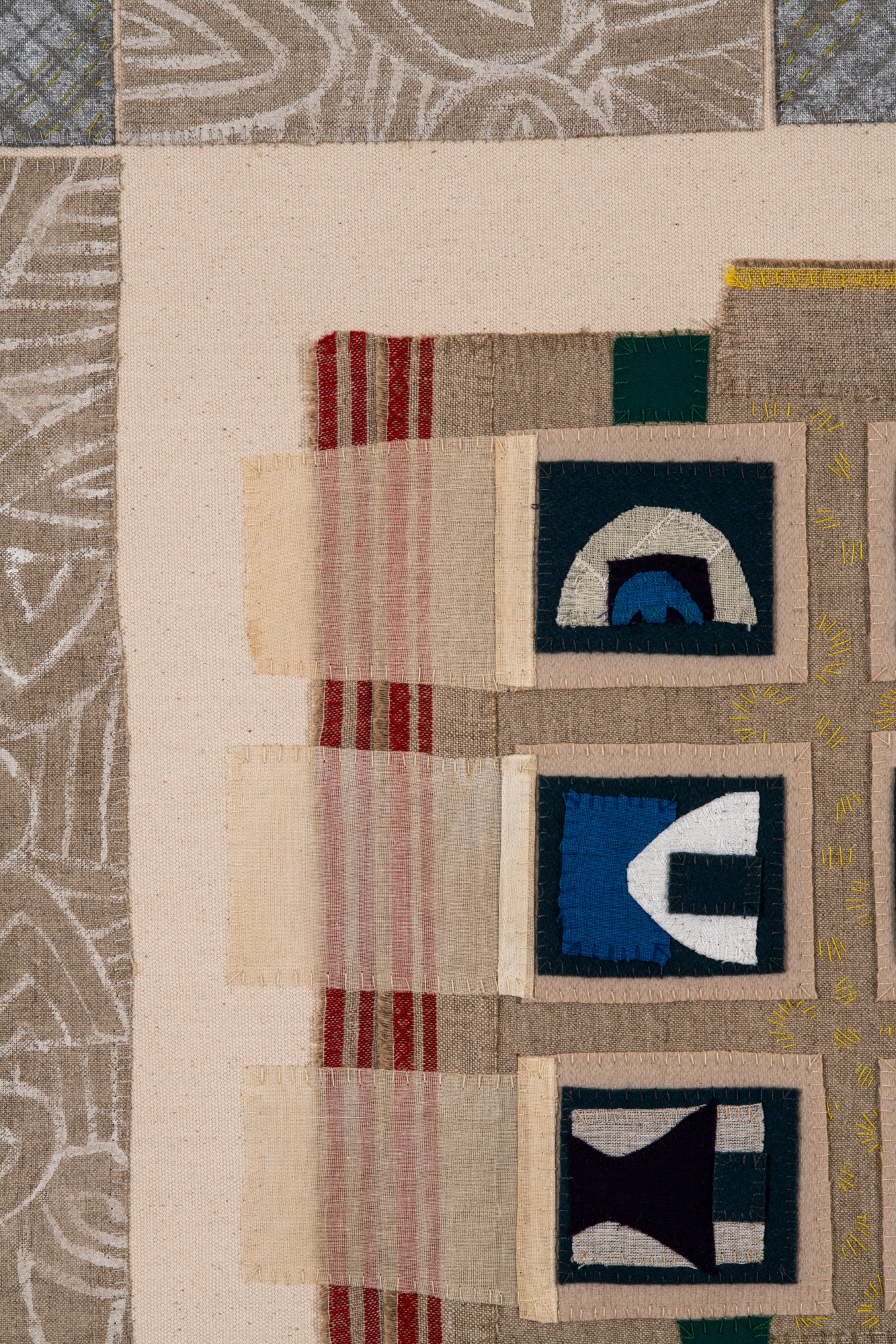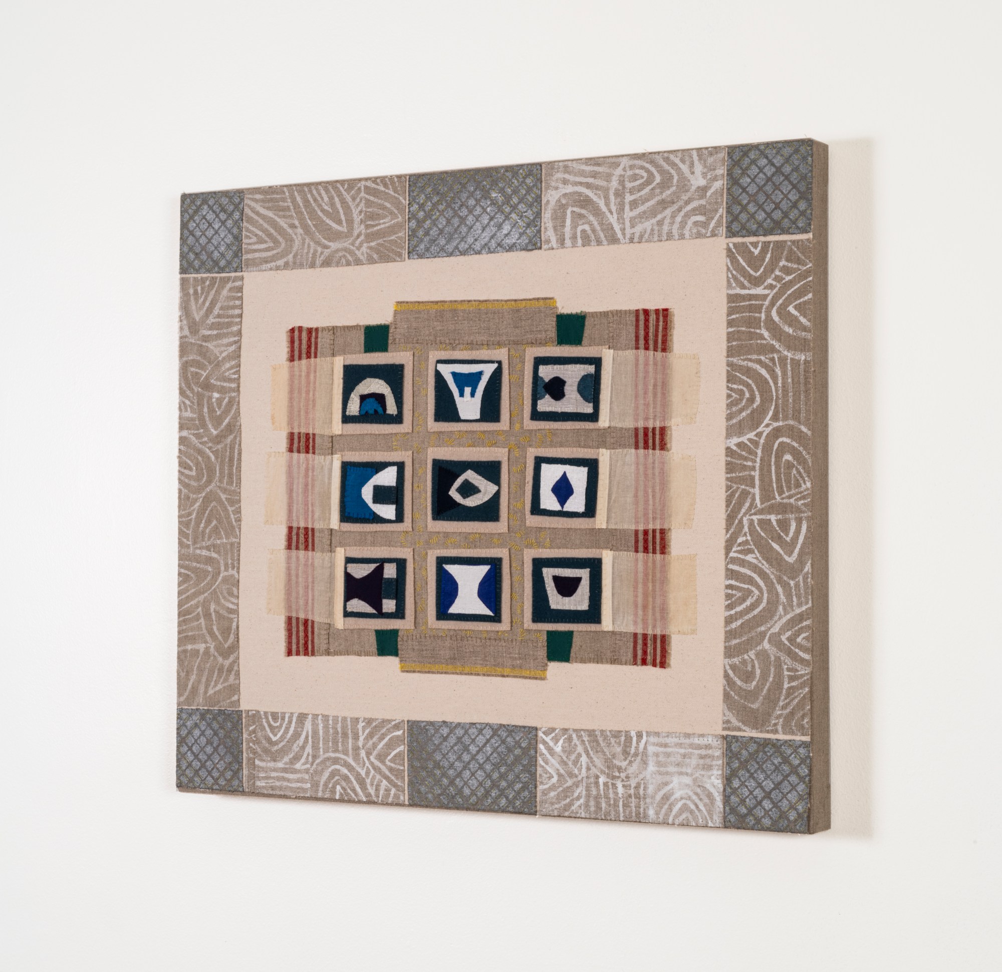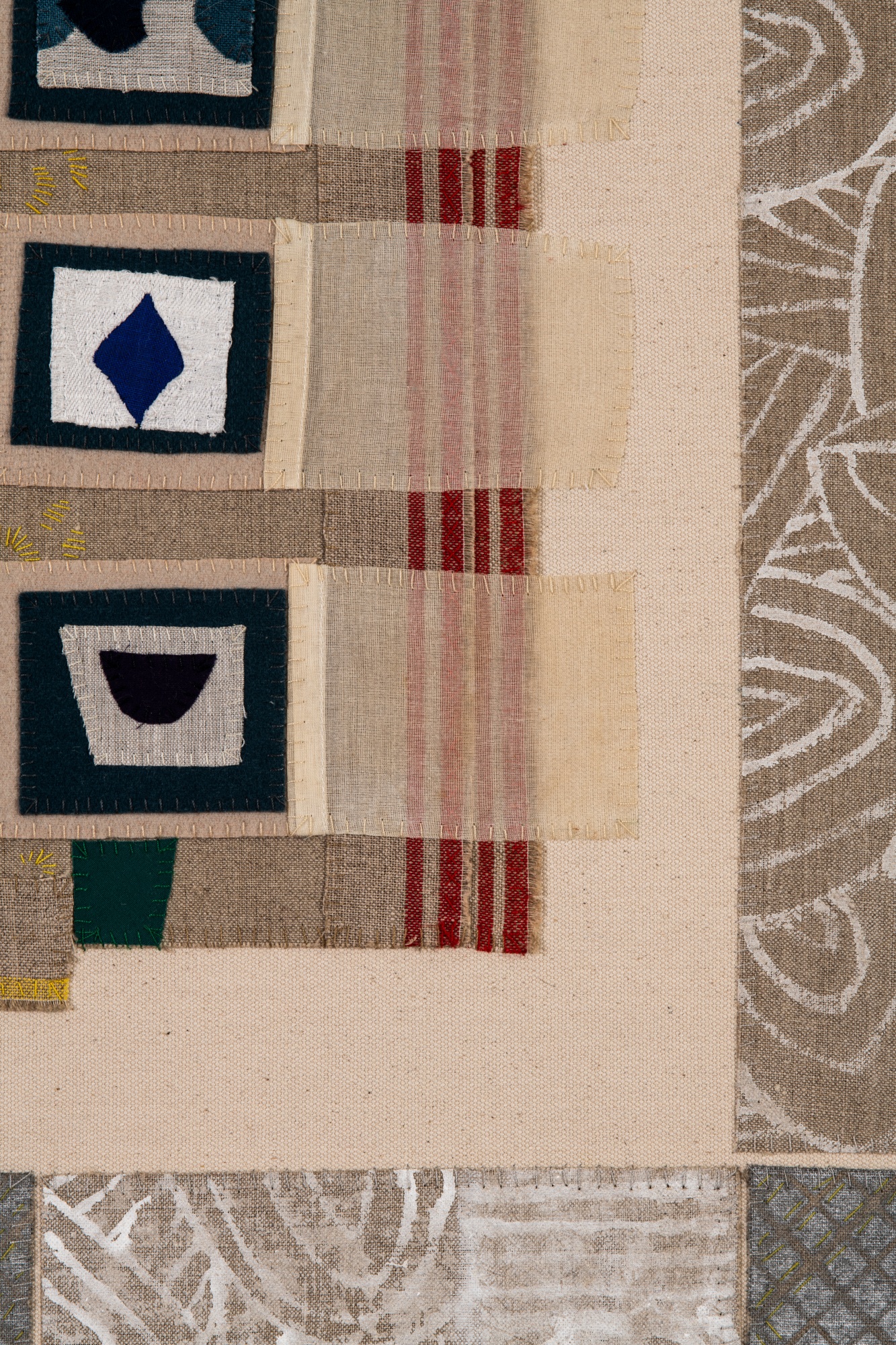 Handsewn fabric collage with acrylic and spray paint