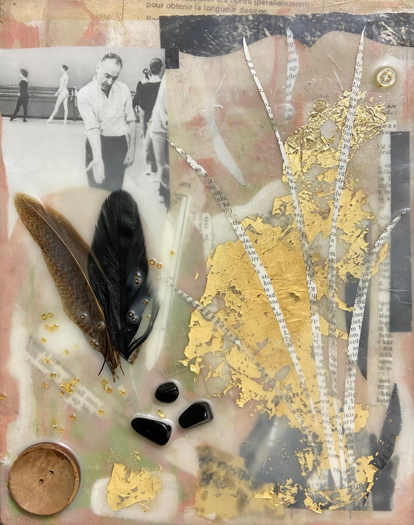 - Acrylic, collage, oil, stones, gold leaf, buttons, feathers, beads, and encaustic on canvas panel