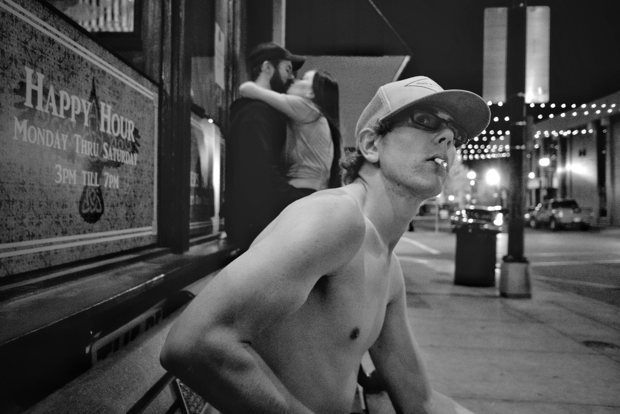 STATEMENT: Russell Cox is a native of Springfield, Missouri, and documents a combination of the ordinary and odd in his city at night, where the atmosphere of downtown serves as a backdrop for the various characters in his photos. He became interested in photography after being inspired by the work of street photographers like Daildo Moriyama, who takes candid photos of everyday people and embraces the grittier elements of photography like blur, low light, and noise.