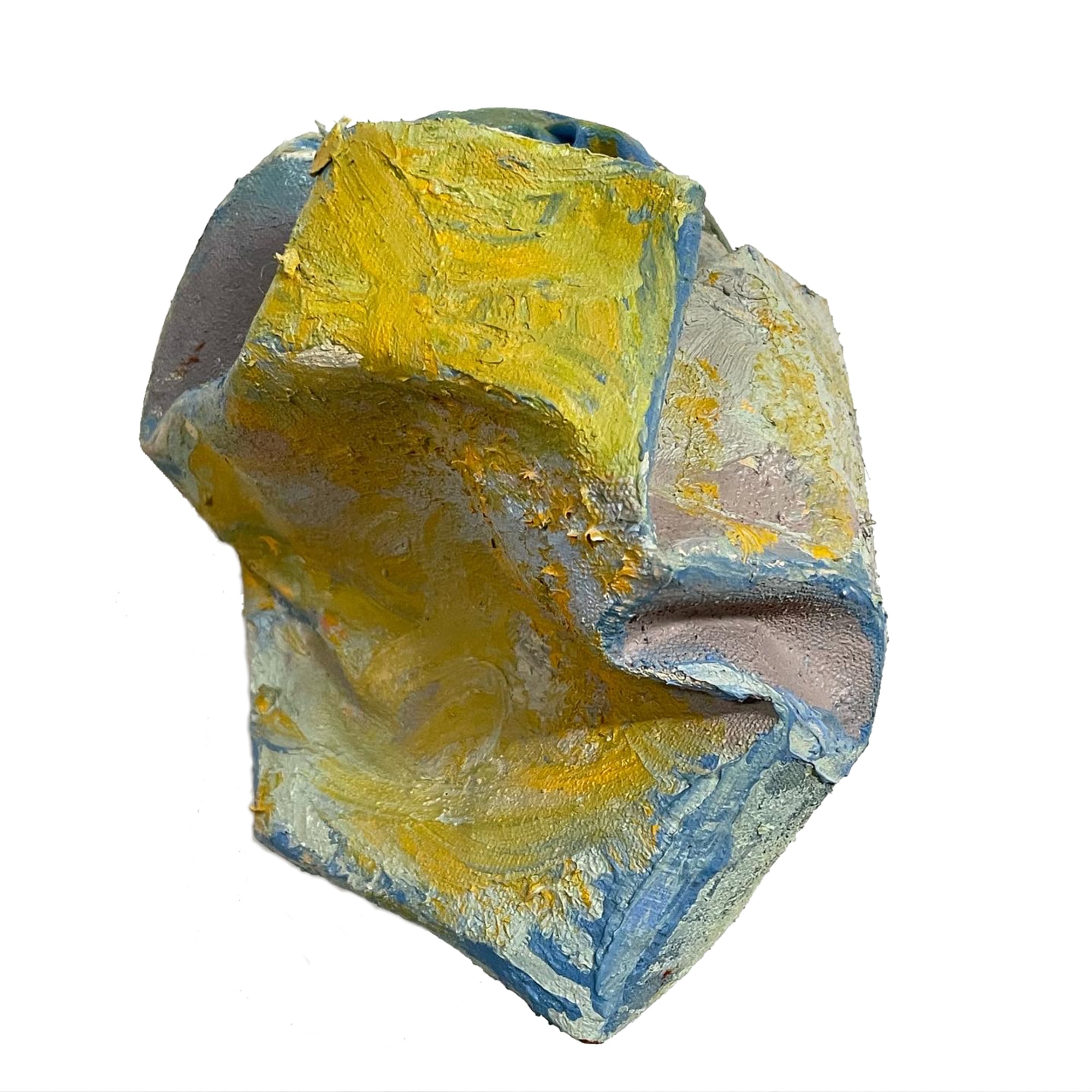 STATEMENT: *Heavy Sigh* is one, in a series of paintings, in which I use the canvas as an additional medium by sculpting and shaping the form. Intuitively painting upon the surface invites the viewer to explore hidden facets of the broken monotony of everyday control.