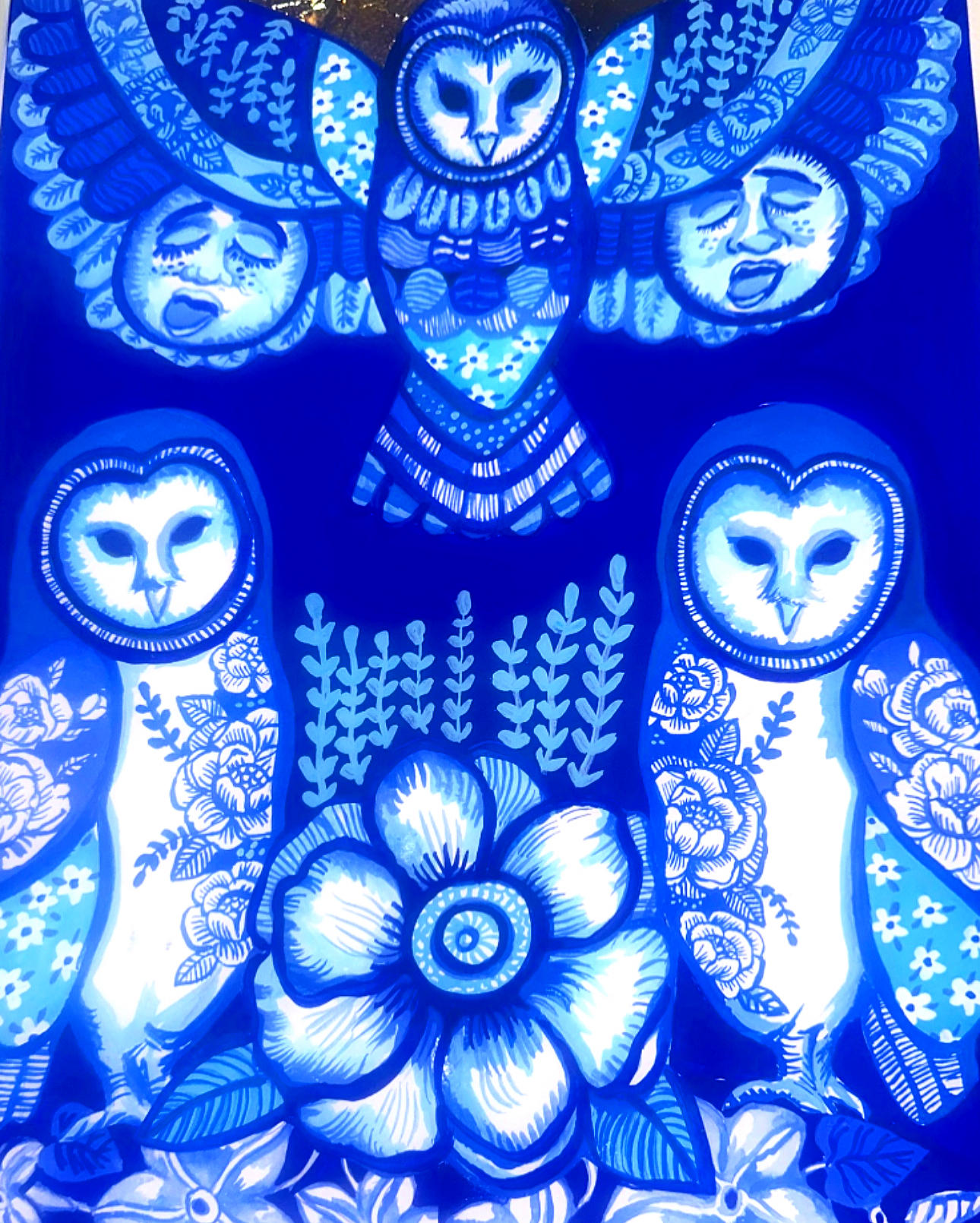 This piece is about exploration of brokenness. Within the wings you can see a visual representation of playing cards referencing we are all dealt a hand of cards from the universe and some of us get a really bad hand. Directly focusing inward on the cards I was dealt due to poverty, abuse and a severely traumatized mother who disconnected from the world by using drugs and abusing alcohol. You’ll also see reference to spades in correlation with the adverse childhood experience. On the belly of the barn owl there’s thistle growing in a harsh environment which is symbolic of the atmosphere I was raised in. Despite all of it the owl is flying it is reaching and growing through self awareness. Through the use of deep dreamy blues and light cotton shades of pale blue this is an expression of my personal journey of overcoming and persistence.
