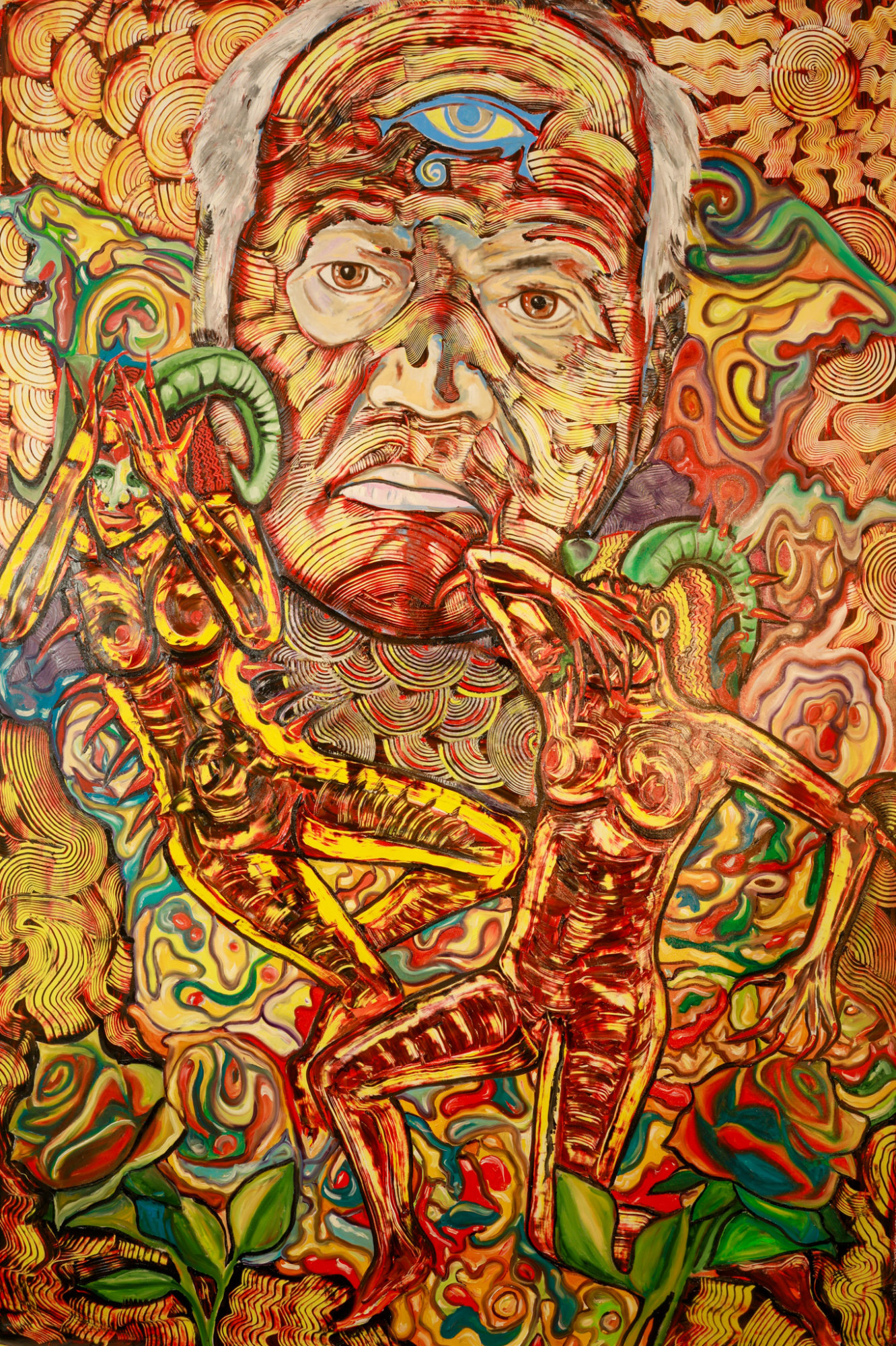 The central figure in the painting is my portrait, surrounded by two women with horns. The horns symbolize the duality of life, representing both the light and the dark, the good and the bad, the joy and the pain. The women with horns represent the many conflicting forces and emotions that we experience in our daily lives.
