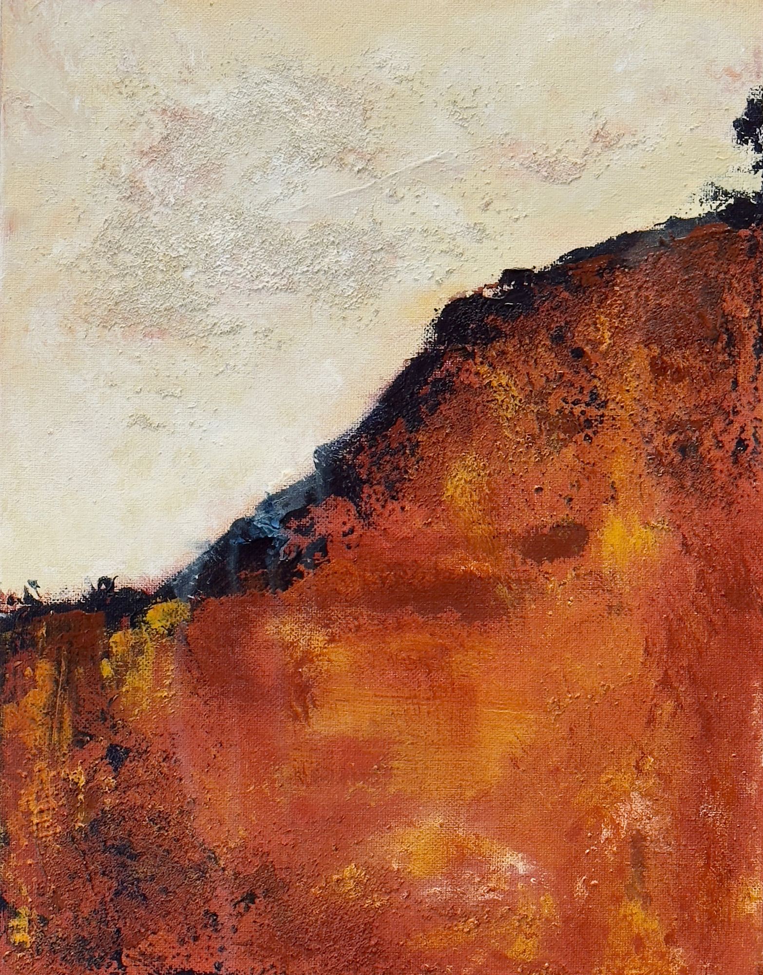 “Fragments of a Journey” is a visual meditation on movement, transformation, and the inner terrain we navigate over time. Each panel—Awakening, Ascent, and Apex—represents a moment within a broader continuum, not as destinations but as points of pause. With textured layers of cream, red oxide, and deep blue, the triptych suggests landforms and horizons, yet remains untethered to any single geography. The deep blue horizon line leads the eye forward, acting as both guide and invitation—reminding us that even at the apex, the journey continues. These works are not about where we arrive, but how we travel, and what we carry in the spaces between.