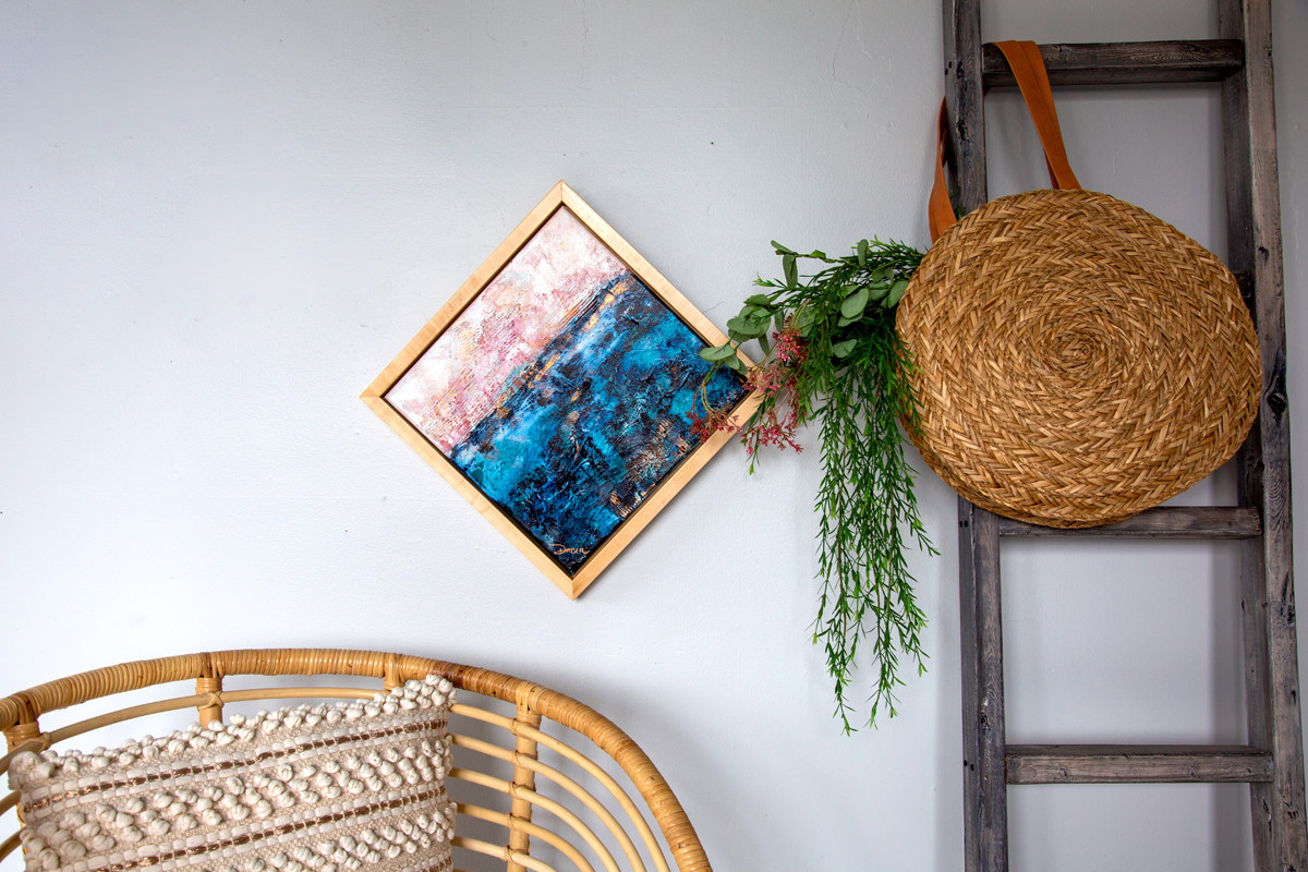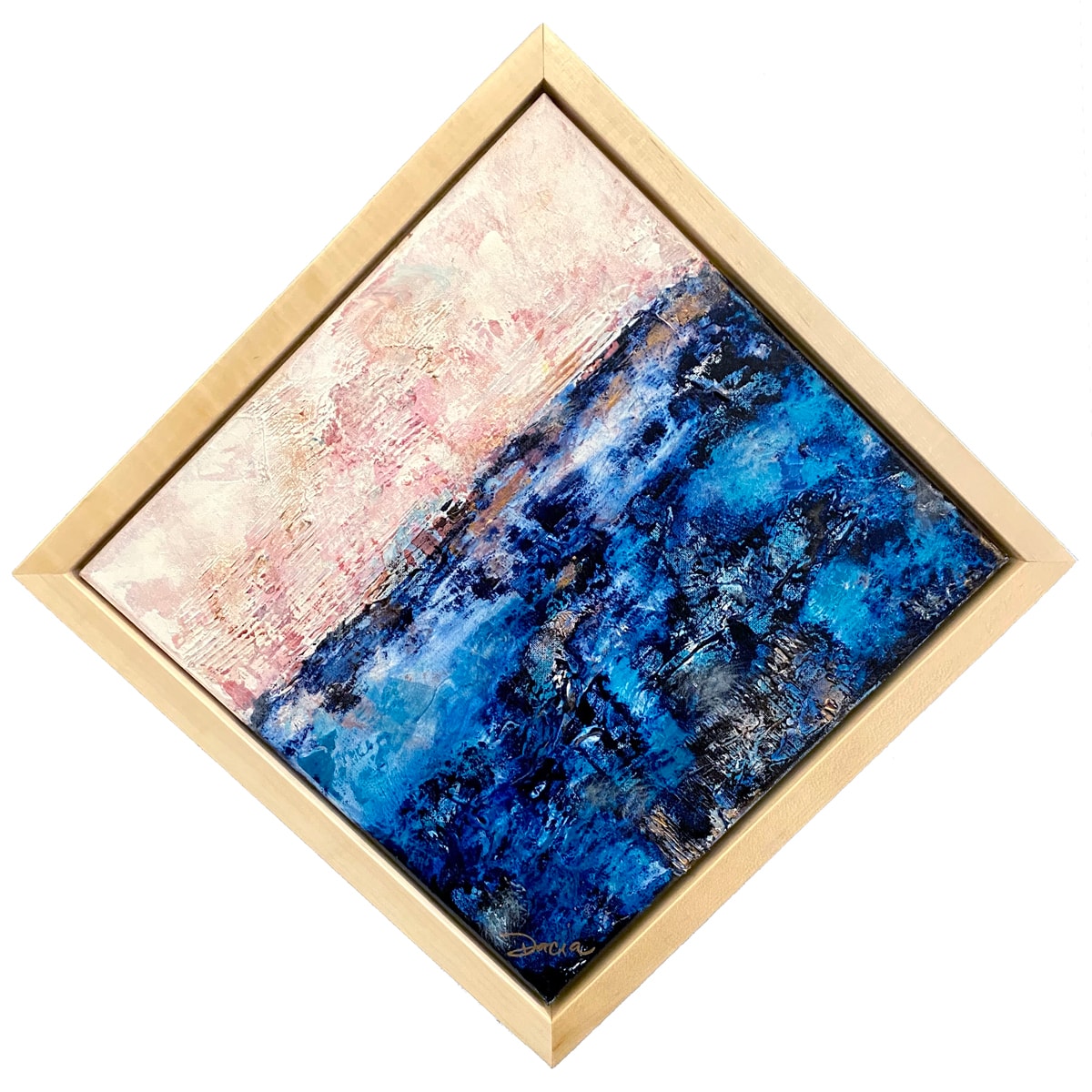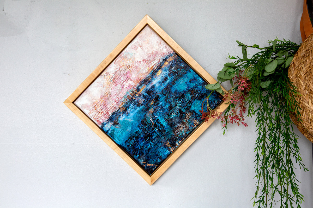 The strong contrast, texture and color in this piece were very representational of the strong emotions and diversity we found ourselves in 2021. This piece can be viewed from many different angles and is intended to be hung both diagonally and square, depending on the mood of the viewer. While I did intend to show some separation in the two very strong lines of color, there is also cohesion and beauty in the diversity.