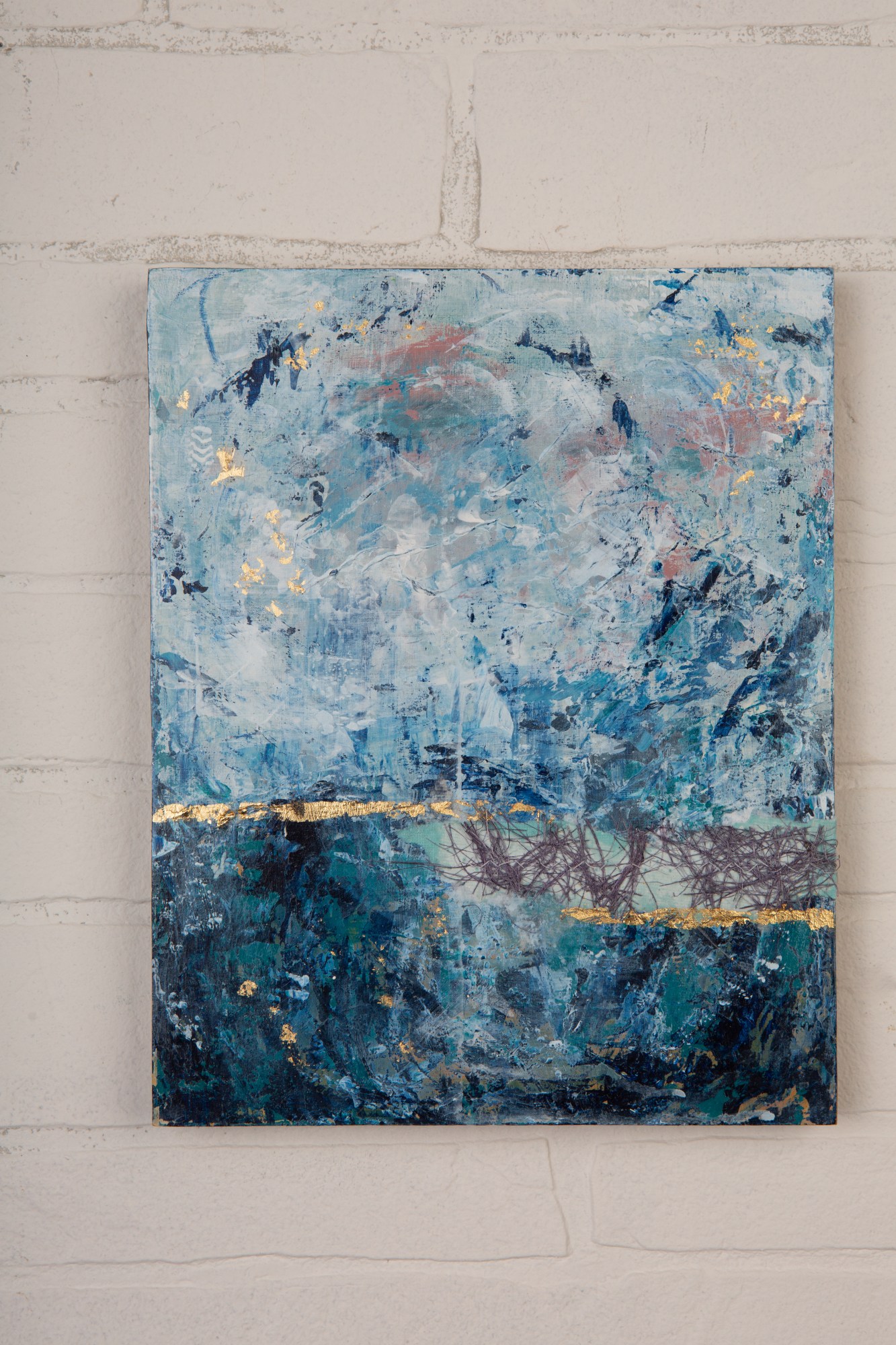 This piece is textured with modeling paste, acrylic paint, collage with paper and fibers, and gold leaf.