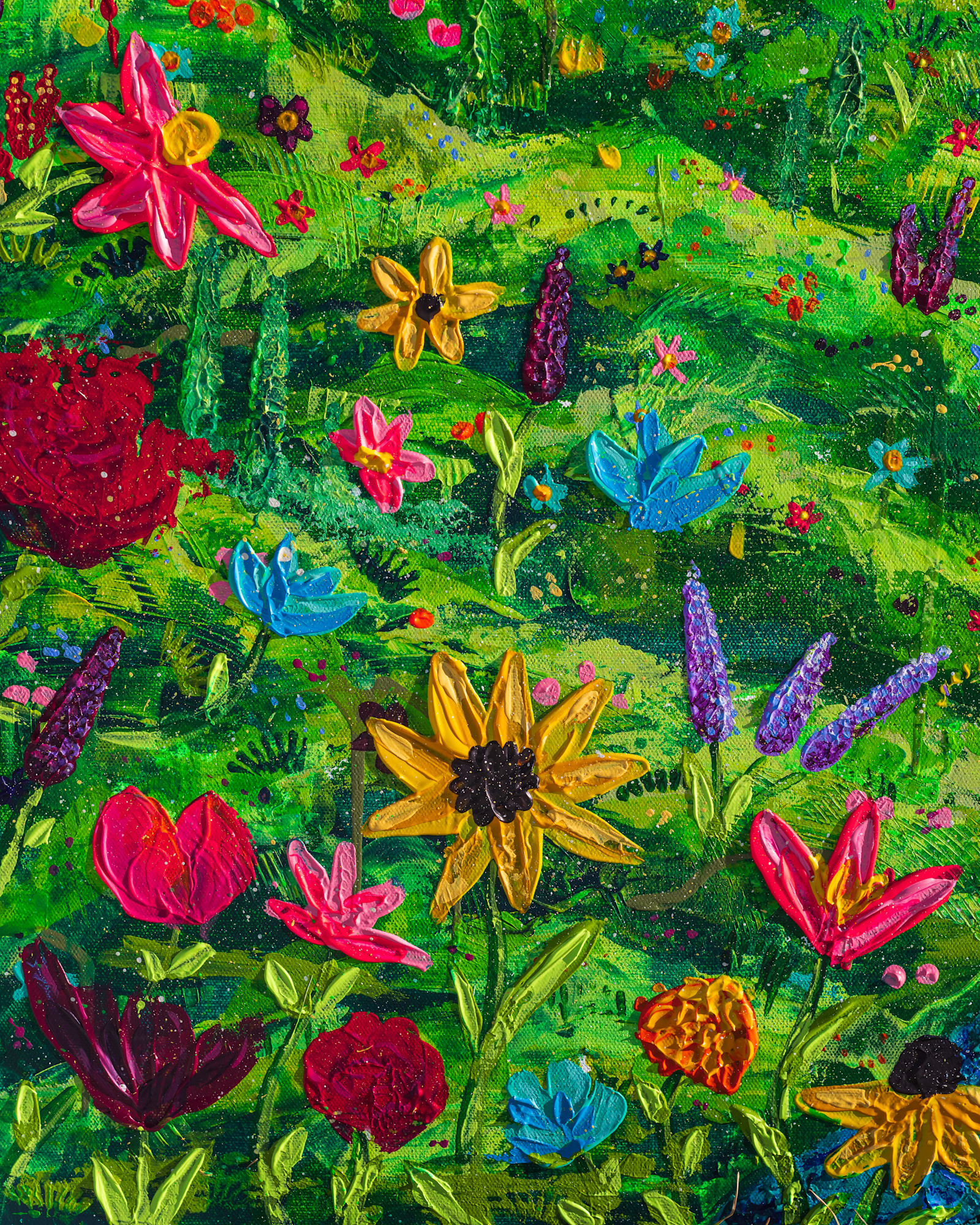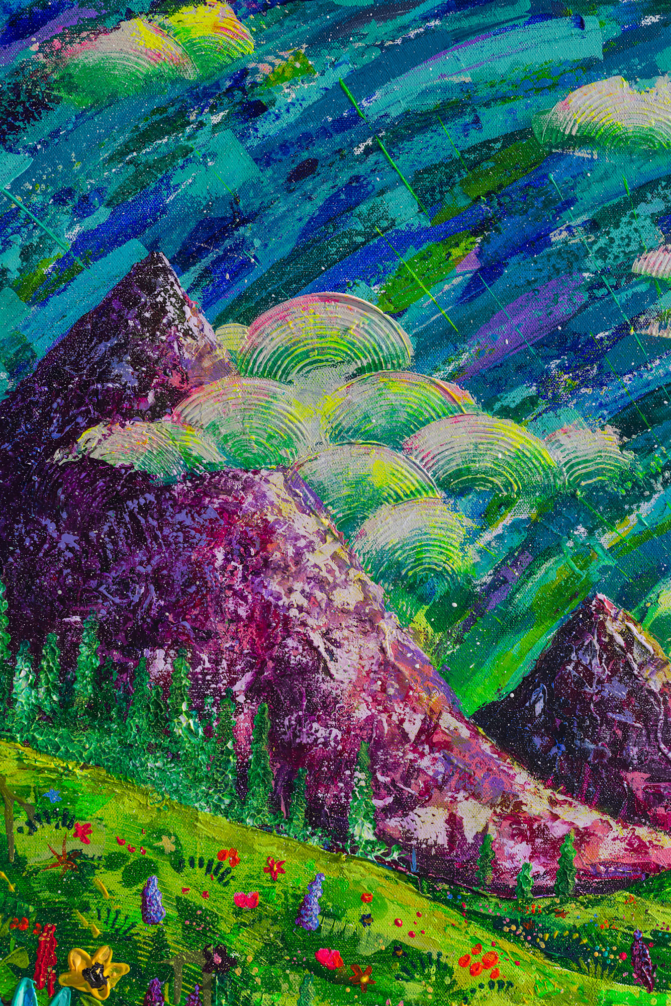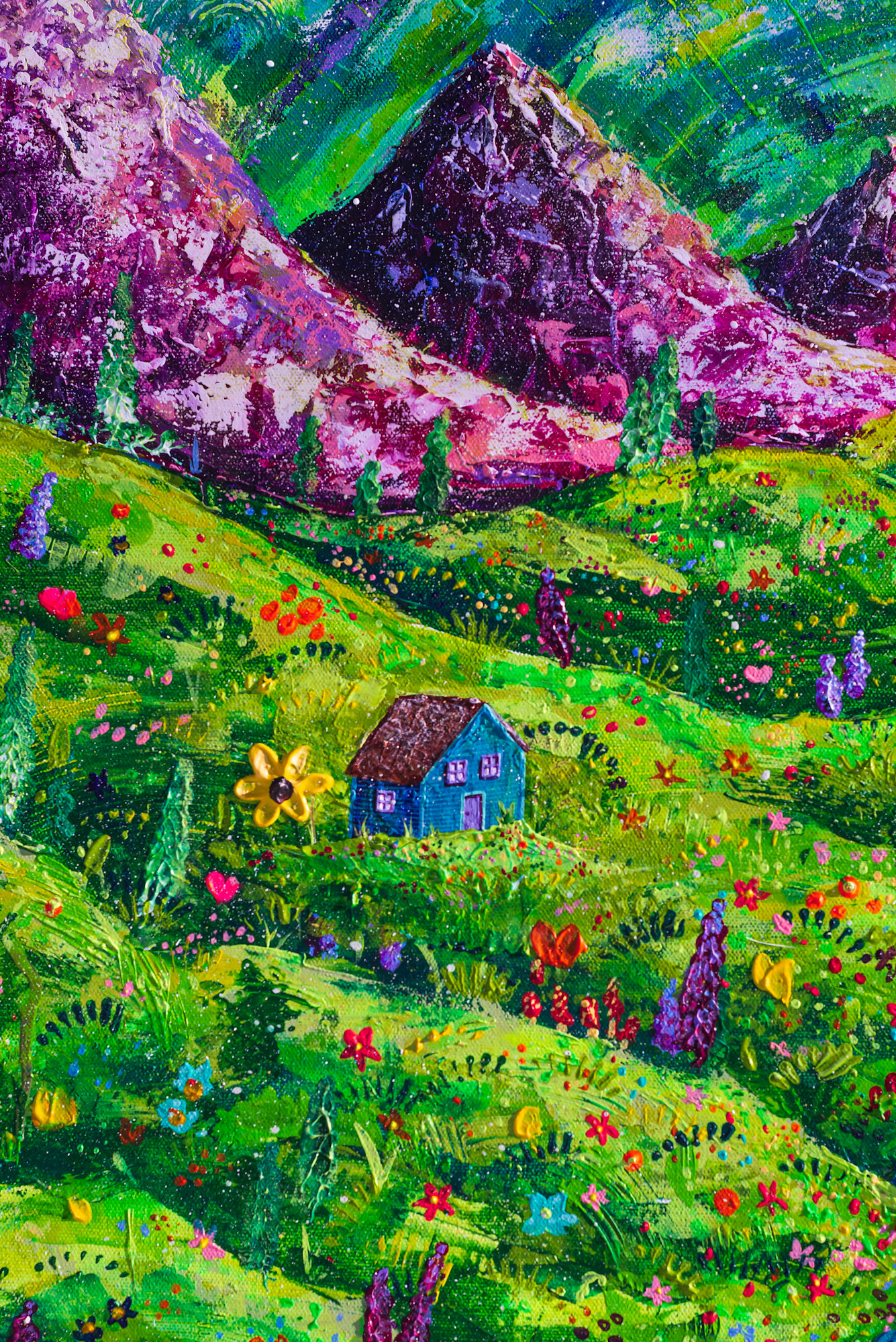 Requiem is a contemplative landscape that captures the delicate balance between nature's beauty and the echoes of its fading preservation. The painting's sweeping sky, with its strokes of blue-green and purple, serves as a backdrop to rolling hills, a bubbling river, and a vibrant explosion of flowers, all of which are intertwined with the quiet presence of a lone, small house. The name "Requiem" evokes the idea of a memorial or farewell—a tribute to something precious that may soon be lost. This piece reflects a poignant moment in time, honoring the landscapes we once took for granted while pondering the consequences of their erosion. It stands as a visual elegy, a reverence for both the natural world and the memories it holds.
