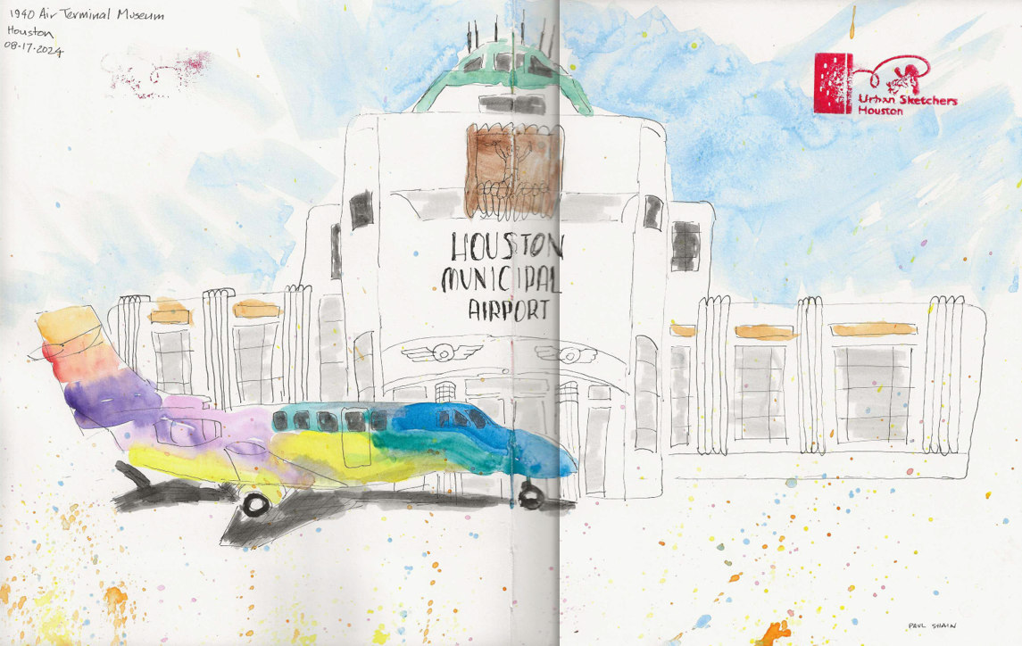 1940 Air Terminal Museum at Hobby Airport in Houston with Hawker Siddeley HS.125-400A jet parked in front.