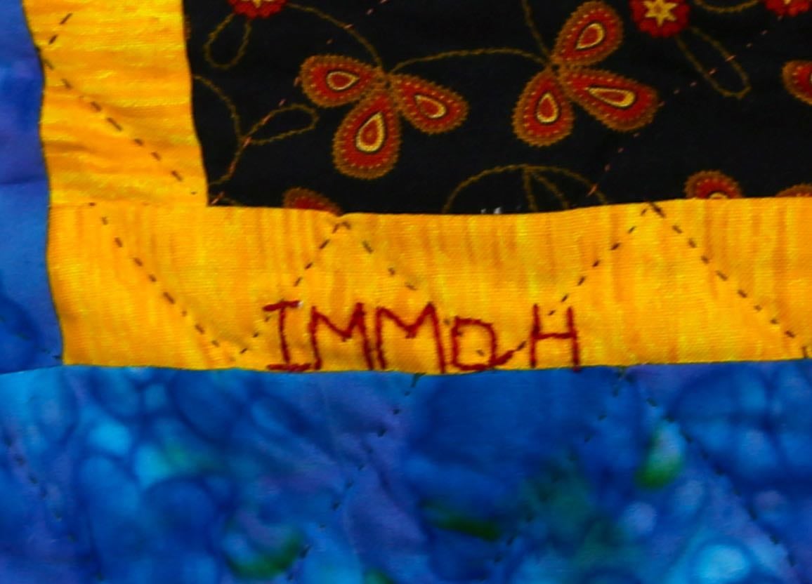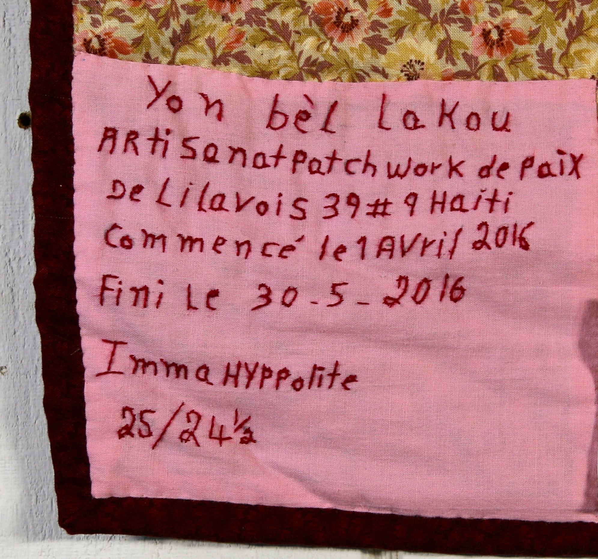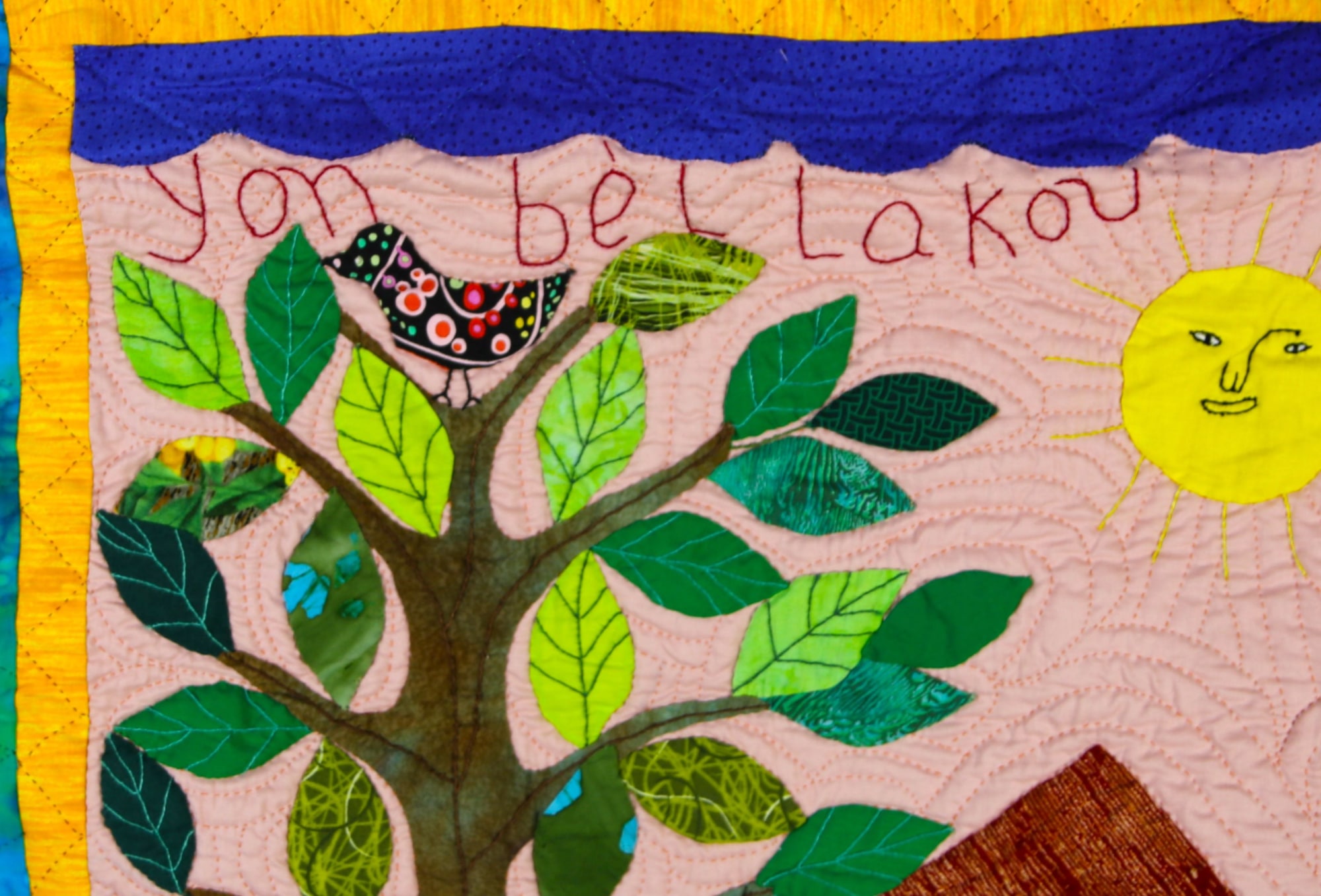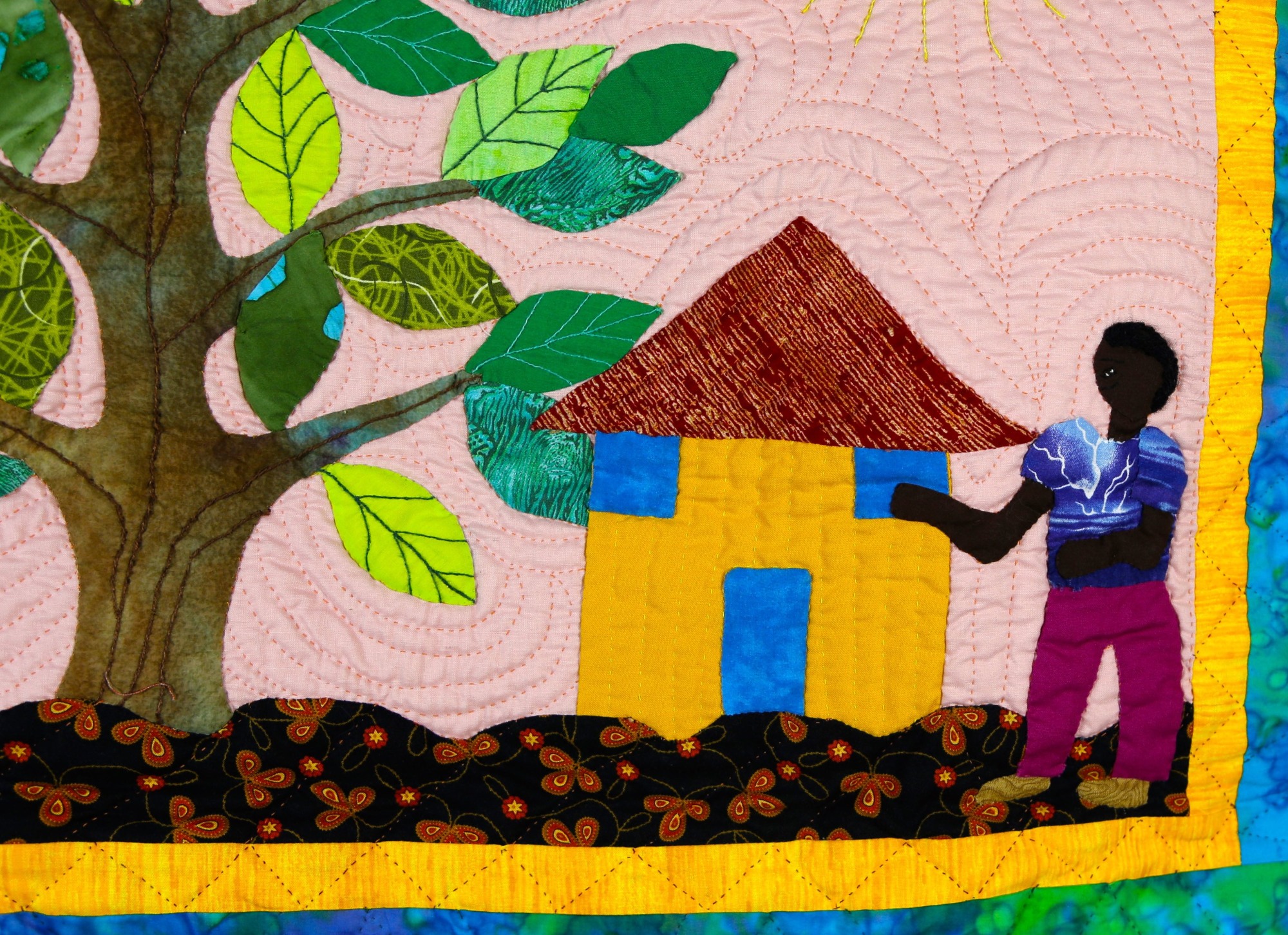 A charming 'ti kay' or little house in the country is sheltered by a beautiful tree where birds alight. Hand-stitched appliqué, quilting and embroidered details. Sleeve on reverse for hanging. Complementary copy of Patience To Raise the Sun included with purchase.