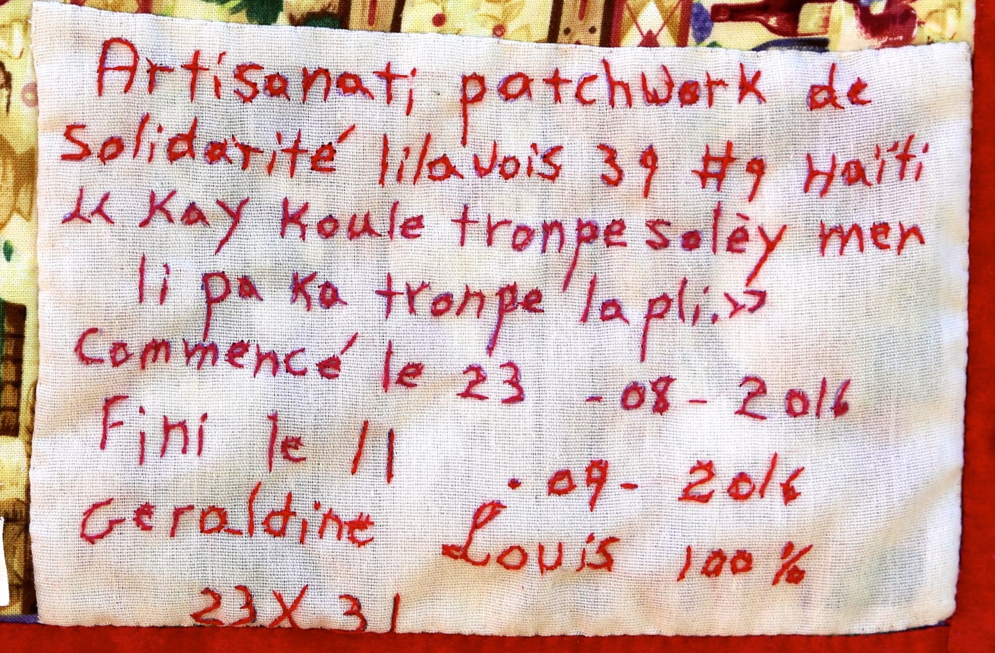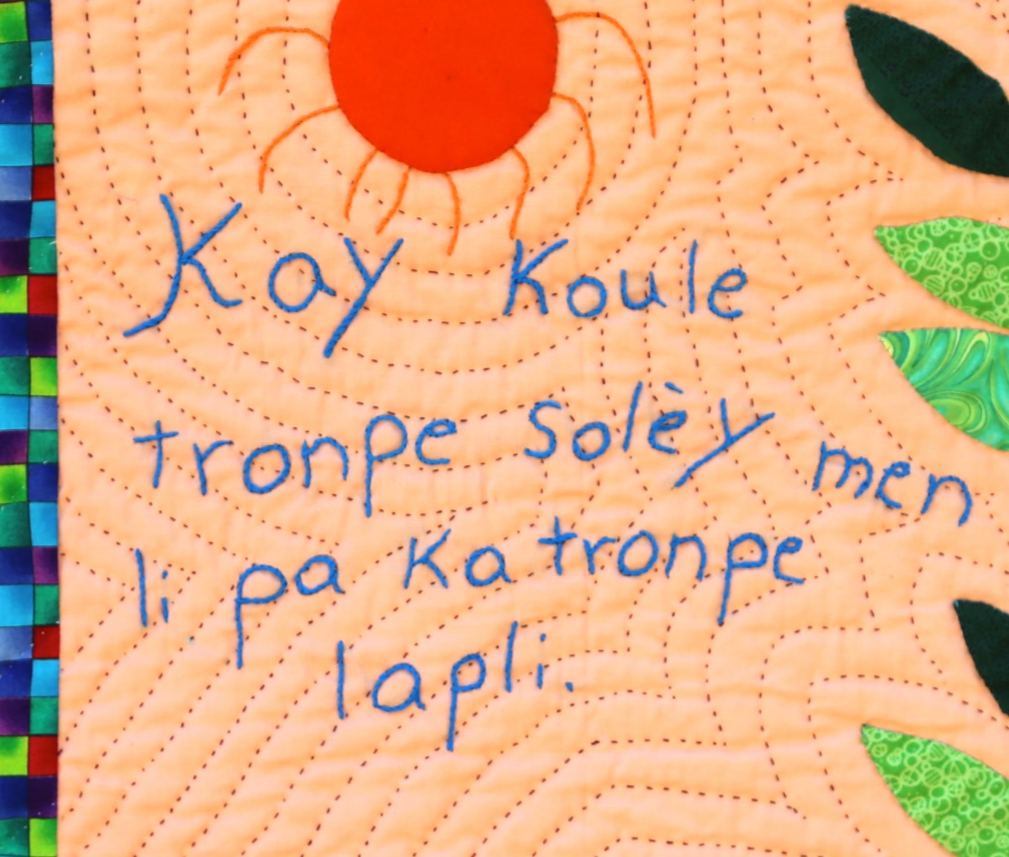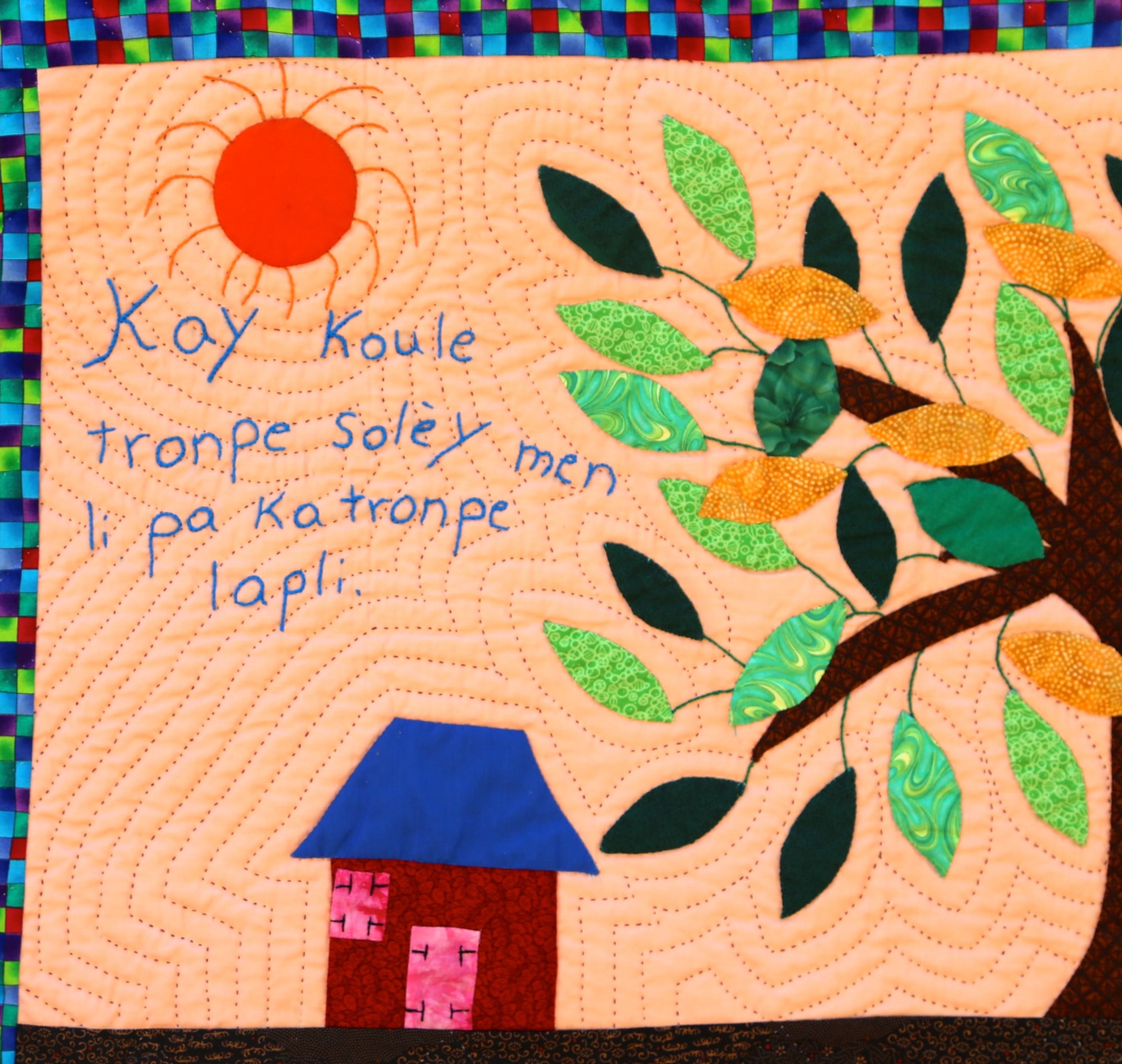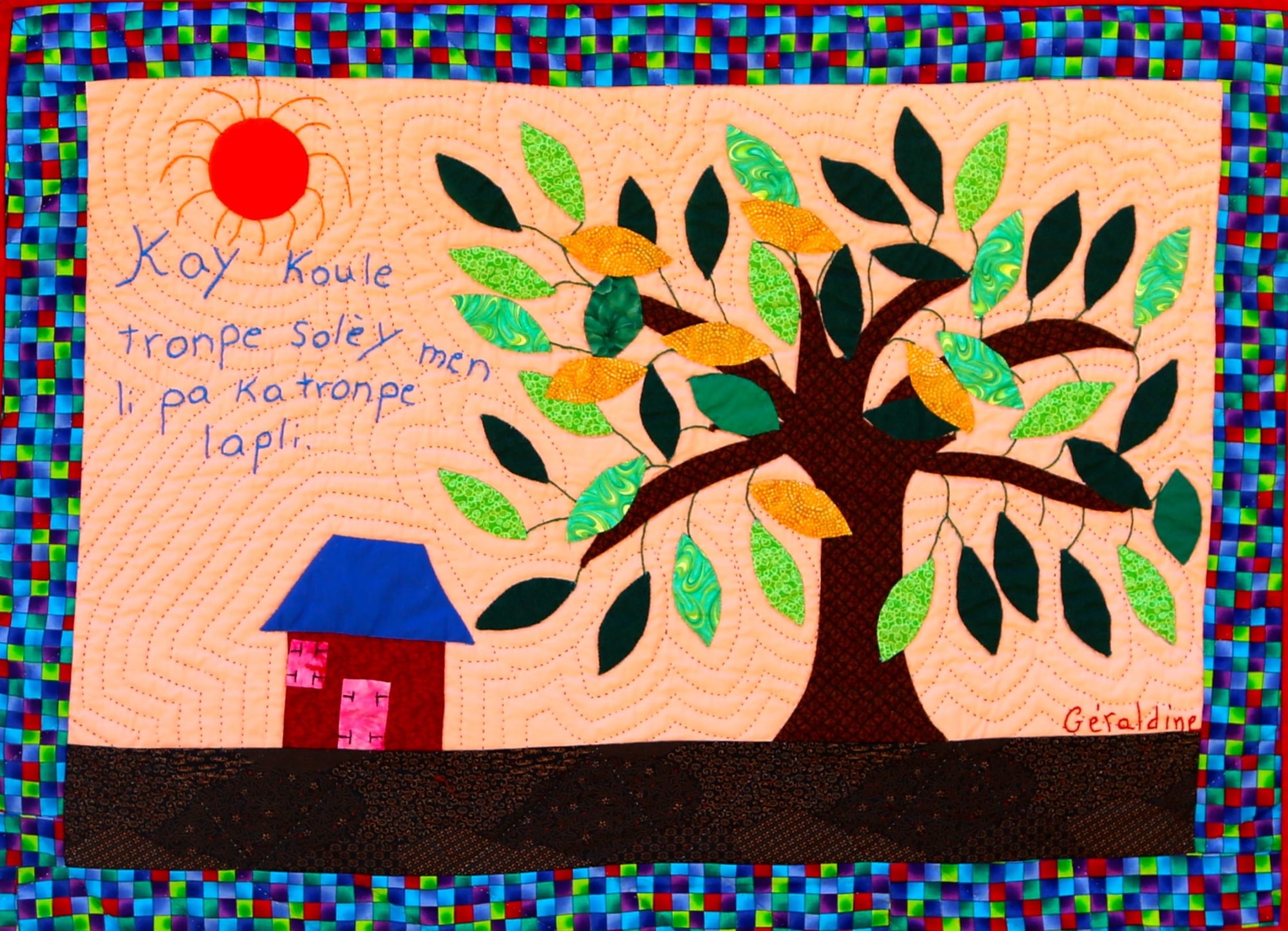 A charming depiction of a well-known proverb in Haiti, this quilt cautions the viewer to prepare for a rainy day! Hand appliquéd, quilted and embroidered on pieced cottons. Sleeve on reverse for hanging. Complementary copy of Patience To Raise the Sun included with your purchase.