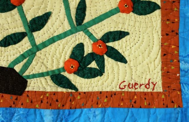 Sometimes you have to look for the beauty around you. Artist Geurdy Desulme has captured this lovely flowering branch on a tree near her home. 100% cotton. Treadle machine pieced with hand appliqué and echo quilting. Sleeve on reverse for hanging. Complementary copy of Patience To Raise the Sun book included with your purchase. Free shipping.