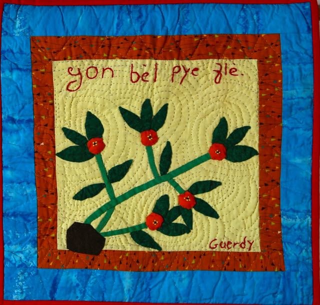 Sometimes you have to look for the beauty around you. Artist Geurdy Desulme has captured this lovely flowering branch on a tree near her home. 100% cotton. Treadle machine pieced with hand appliqué and echo quilting. Sleeve on reverse for hanging. Complementary copy of Patience To Raise the Sun book included with your purchase. Free shipping.