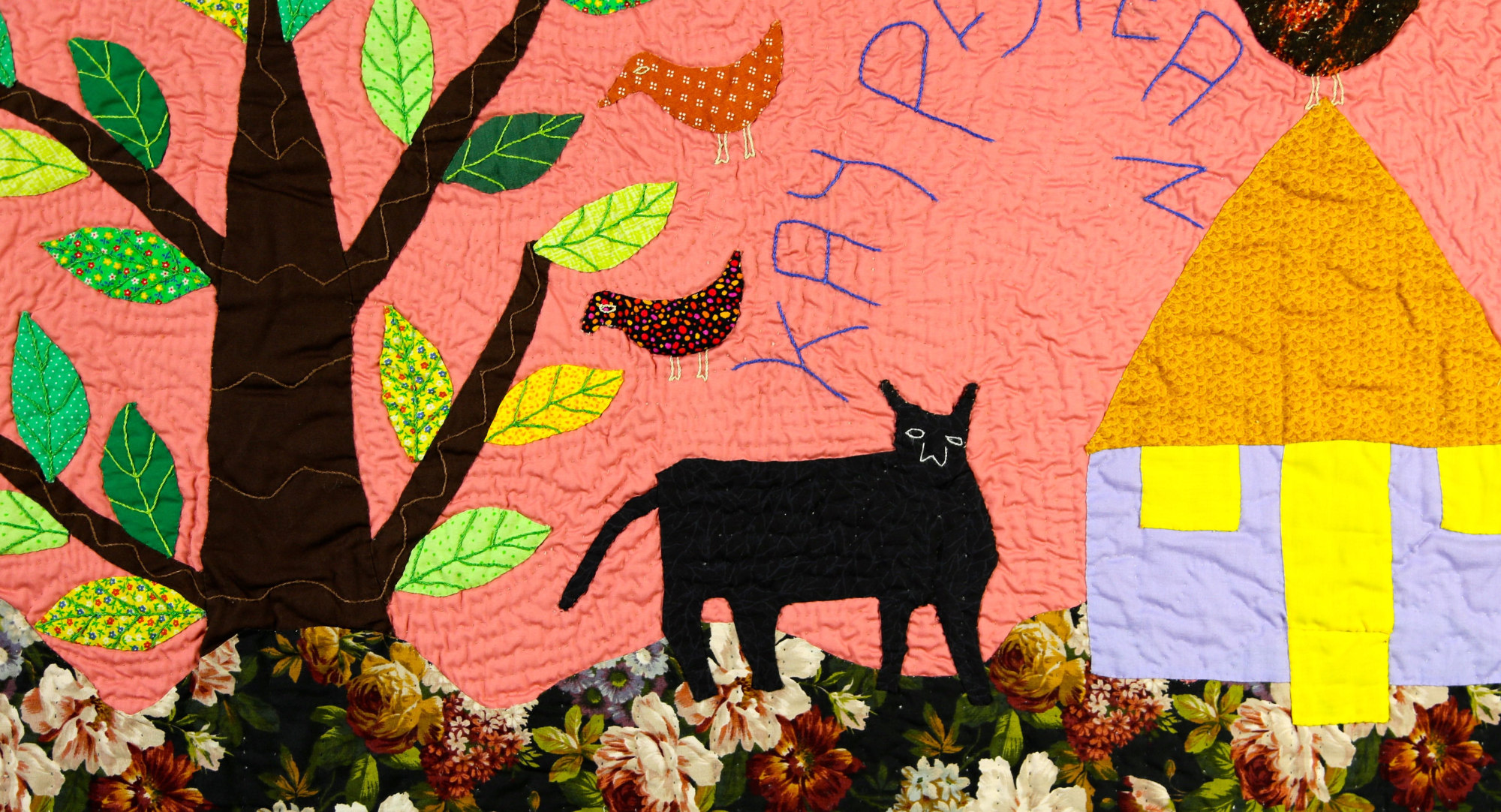 The charms of country life are beautifully captured in this exquisitely stitched quilt by artist Carine Charles. Hand appliquéd, quilted and embroidered on pieced cottons. Sleeve on reverse for hanging. Complementary copy of Patience To Raise the Sun included with your purchase.