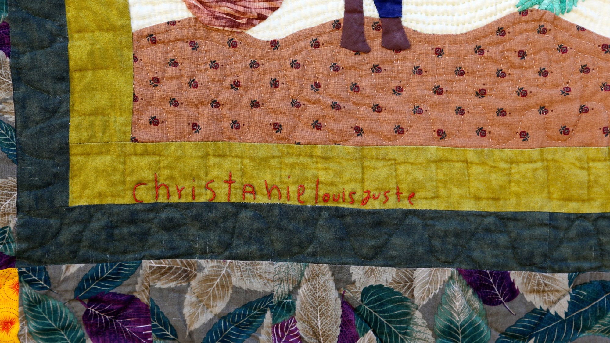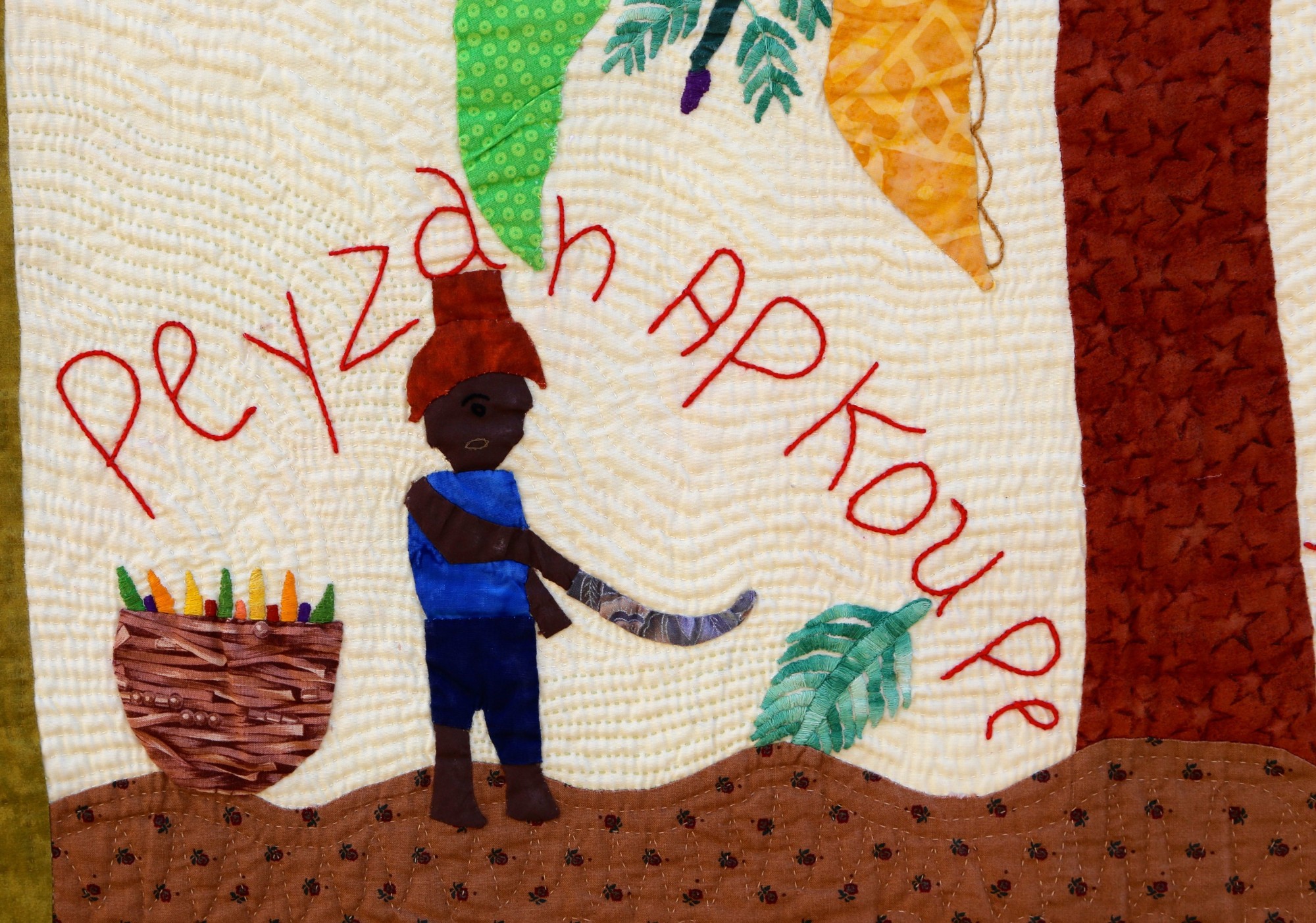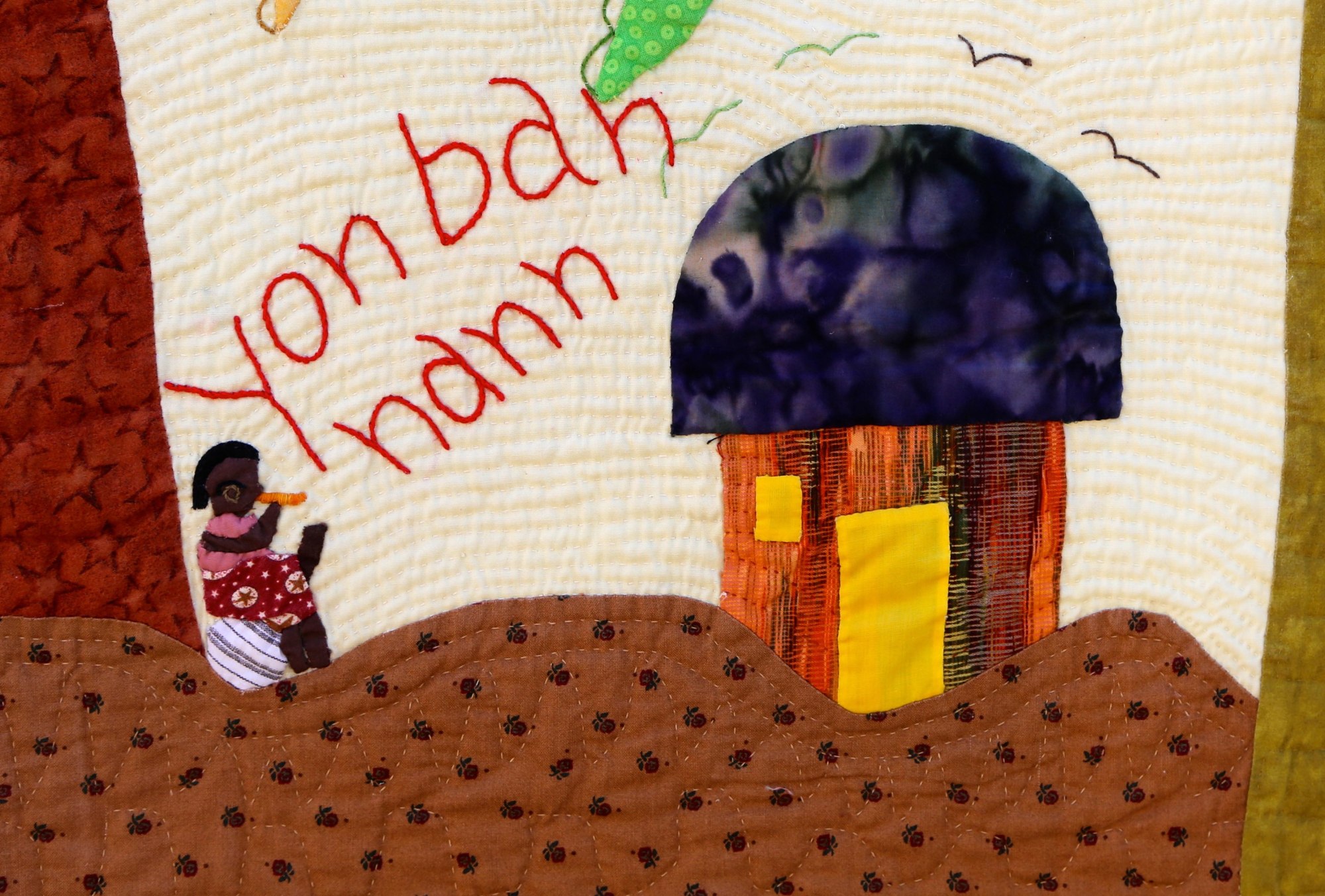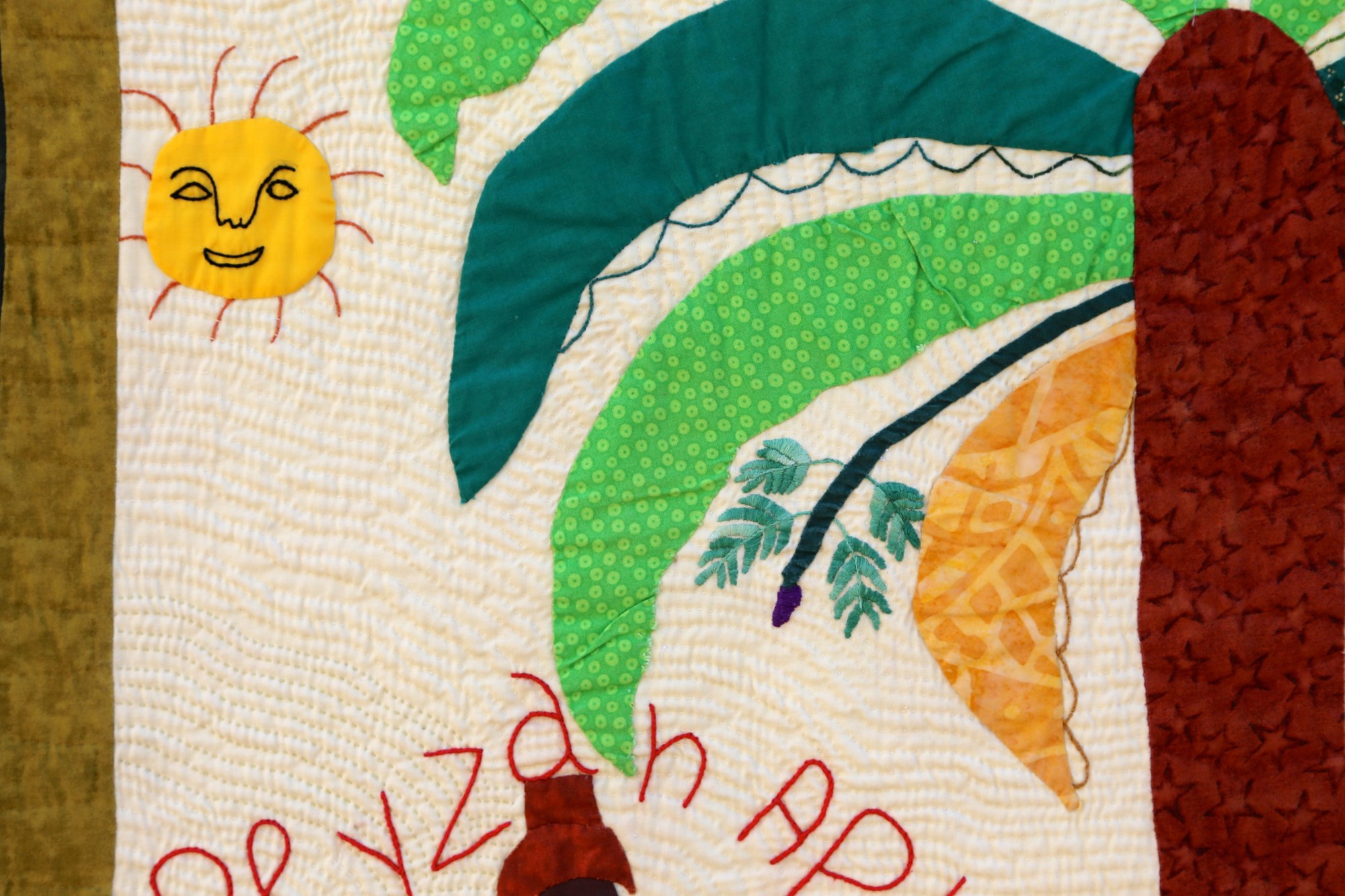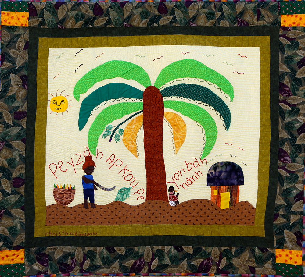 The outsized banana tree depicted on this quilt demonstrates its importance to the artist's family. Hand appliquéd, quilted and embroidered on pieced cottons. Sleeve on reverse for hanging. Complementary copy of Patience To Raise the Sun included with your purchase.