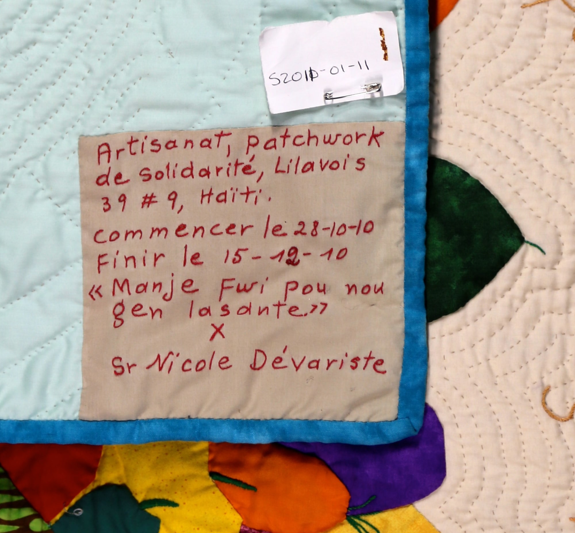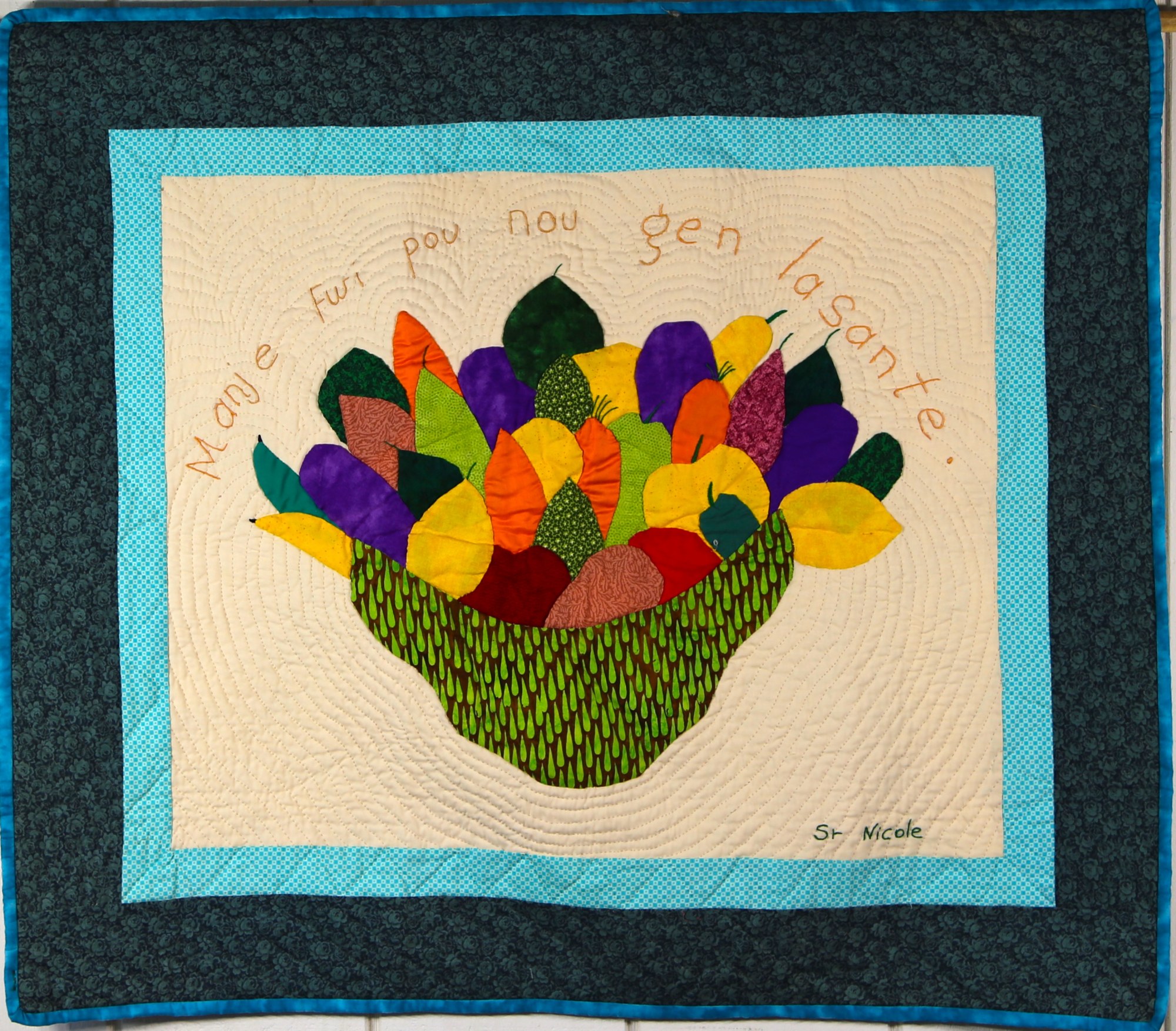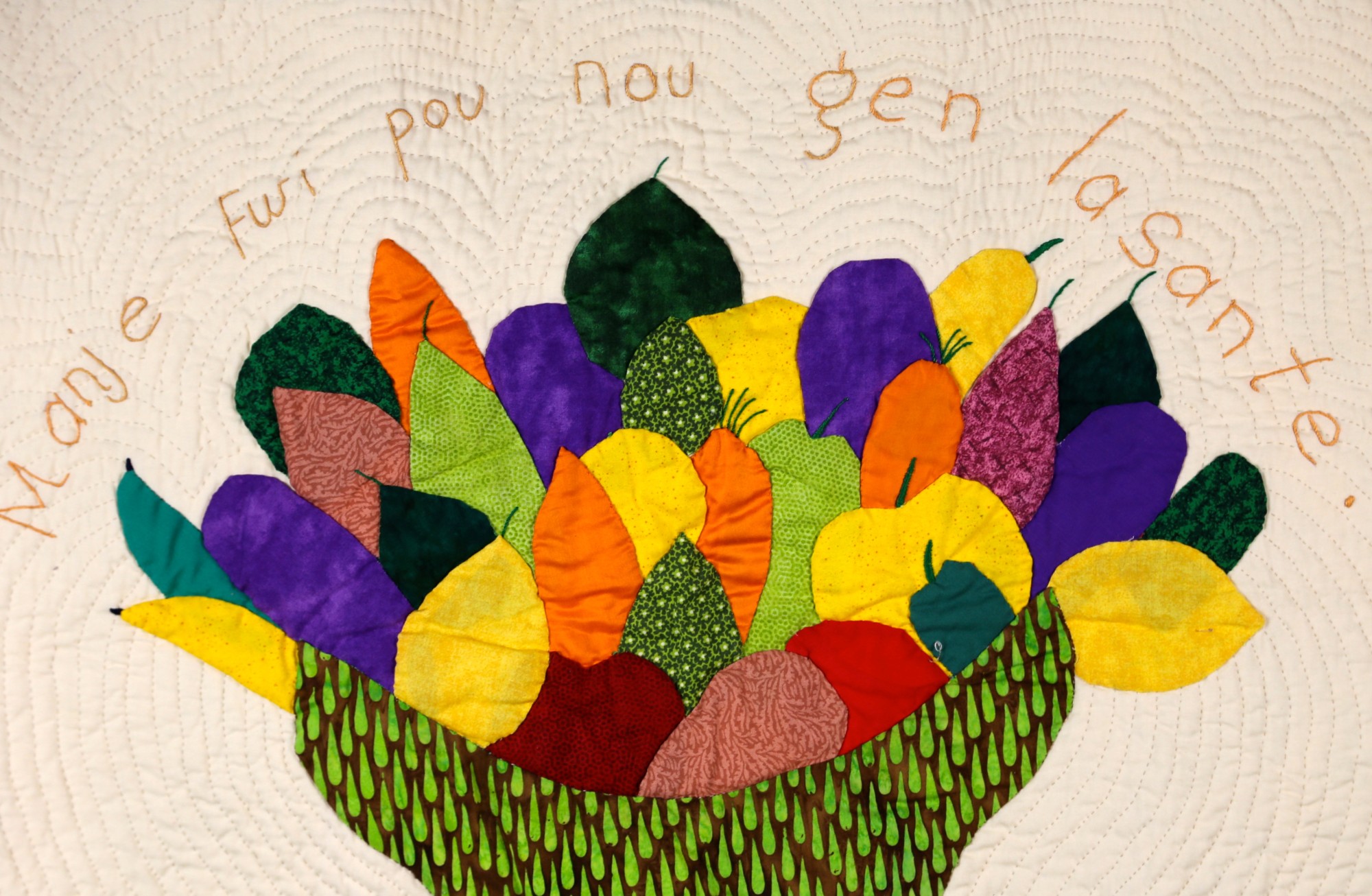 An incredible bounty of local fruits and vegetables are heaped in a basket - more aspiration than a reflection of reality for most Haitians - but still an expression of hope for Haiti's potential. 100% cotton. Hand-appliquéd, quilted and embroidered throughout. Sleeve on reverse for hanging. Complementary copy of Patience To Raise the Sun included with purchase.