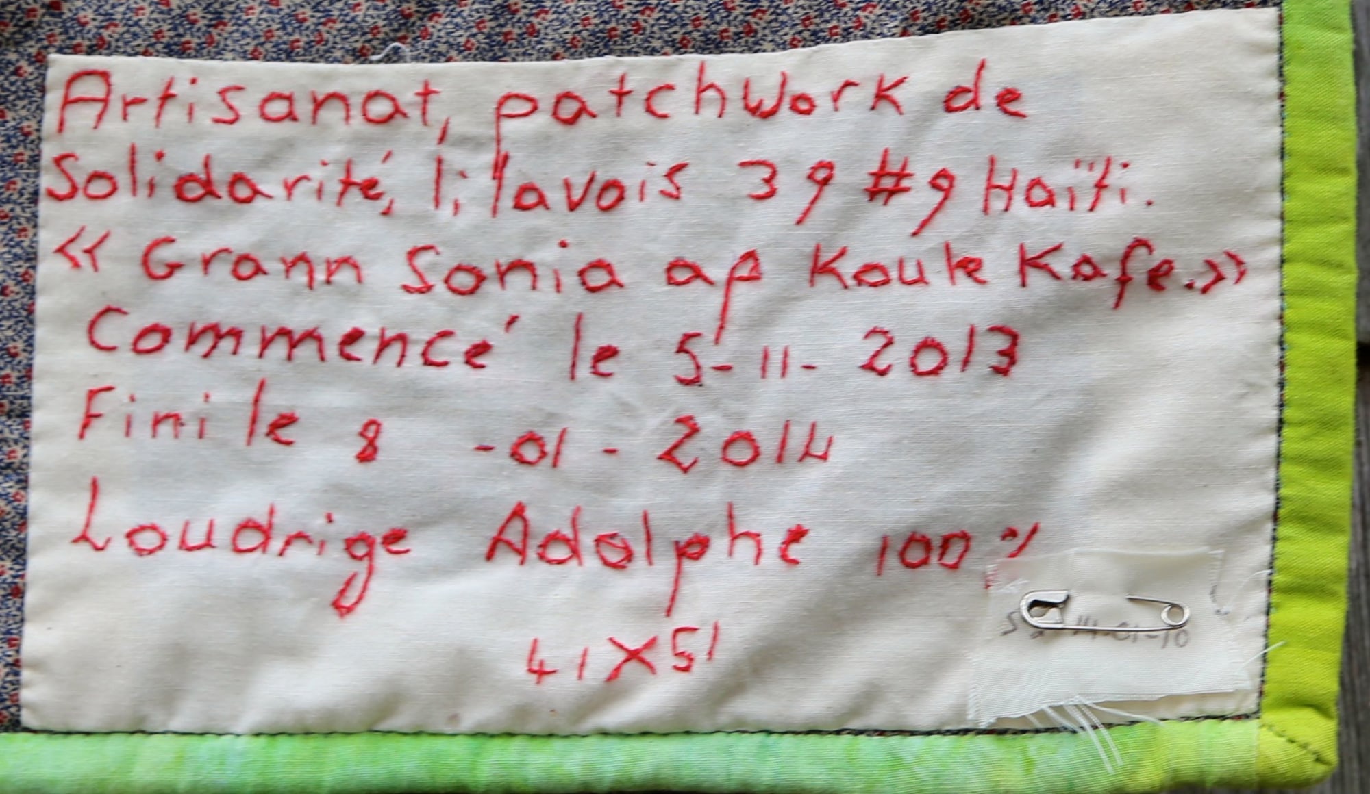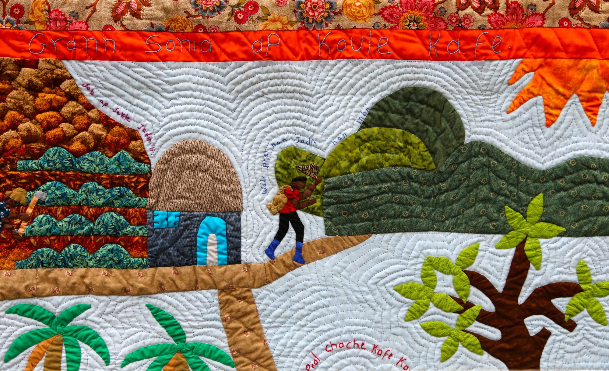 In Haiti, most people live with or near their extended families. Grandparents are respected and integral to the raising of children. This beautifully detailed quilt is rich in story, showing family members tending their gardens as Gramma does her part to help with the coffee.