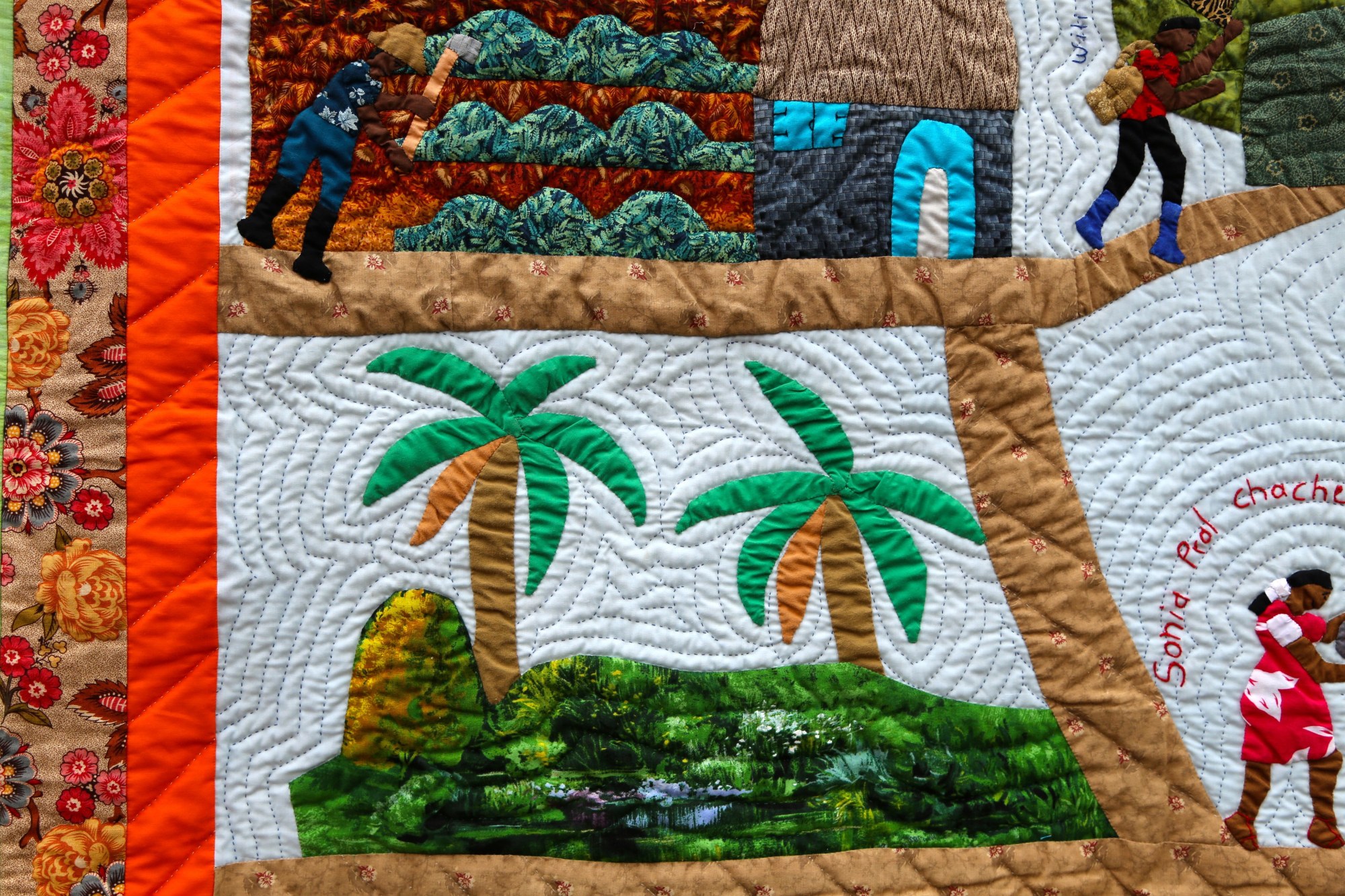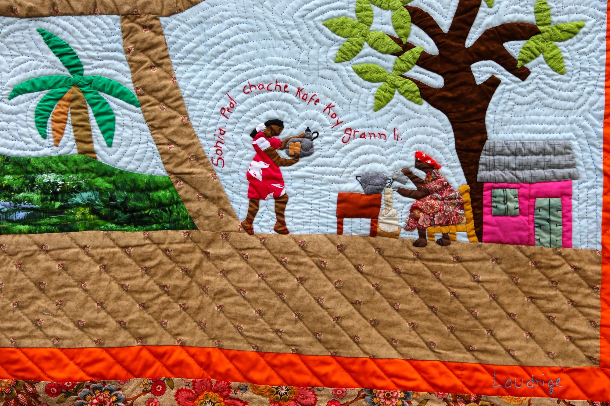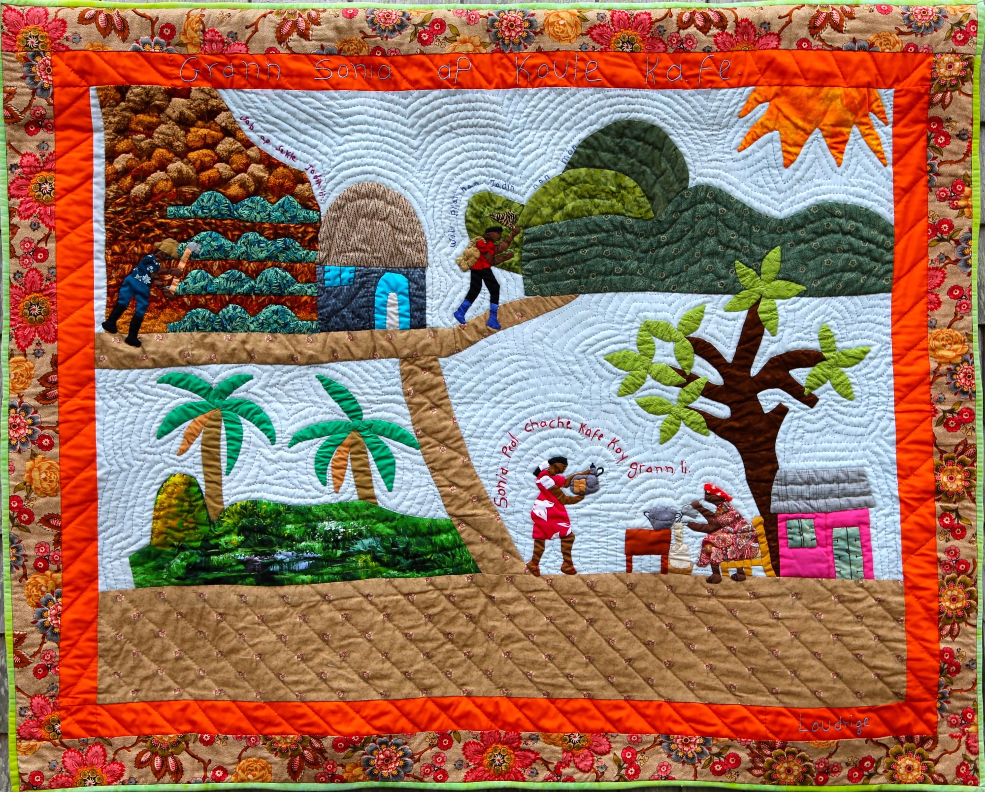 In Haiti, most people live with or near their extended families. Grandparents are respected and integral to the raising of children. This beautifully detailed quilt is rich in story, showing family members tending their gardens as Gramma does her part to help with the coffee.